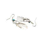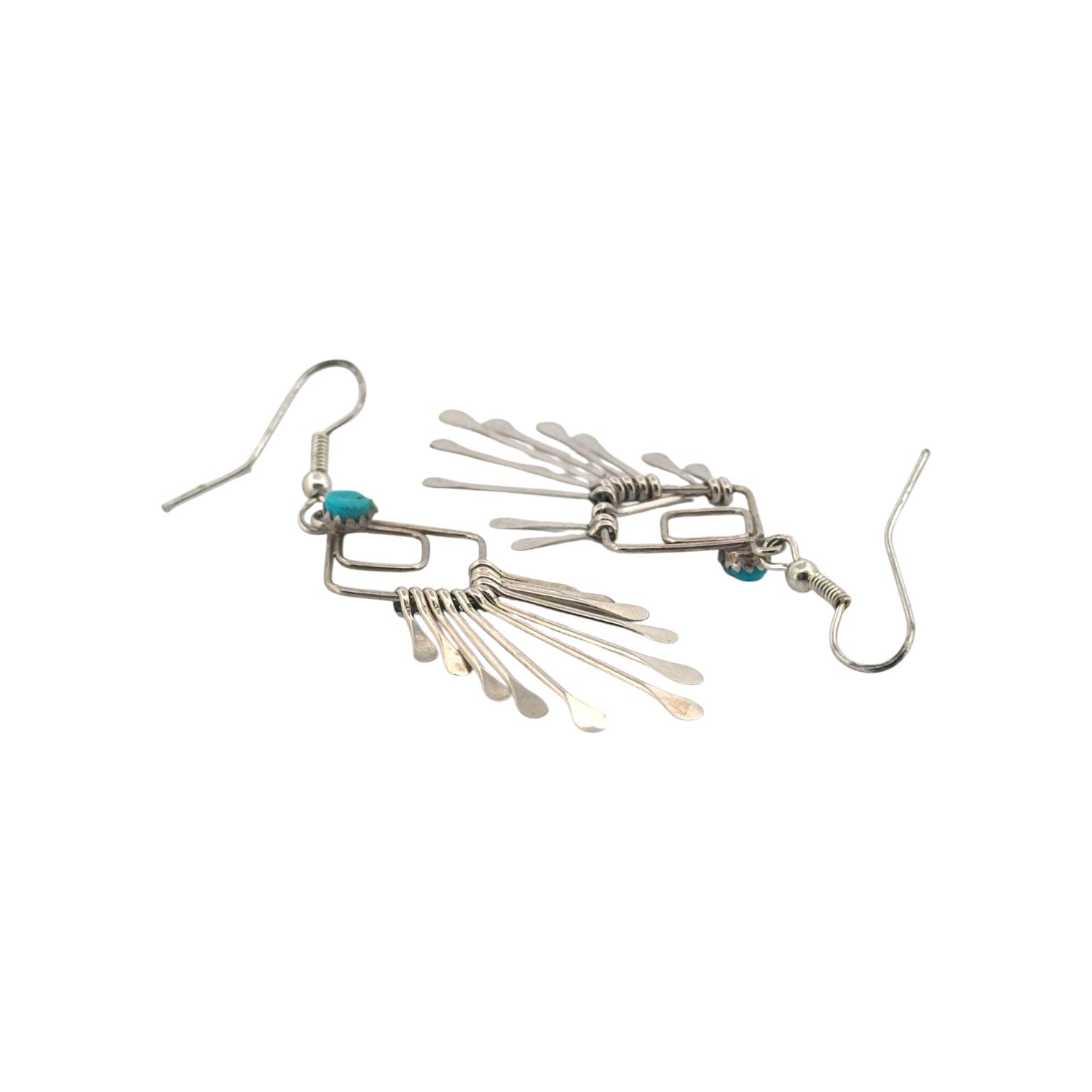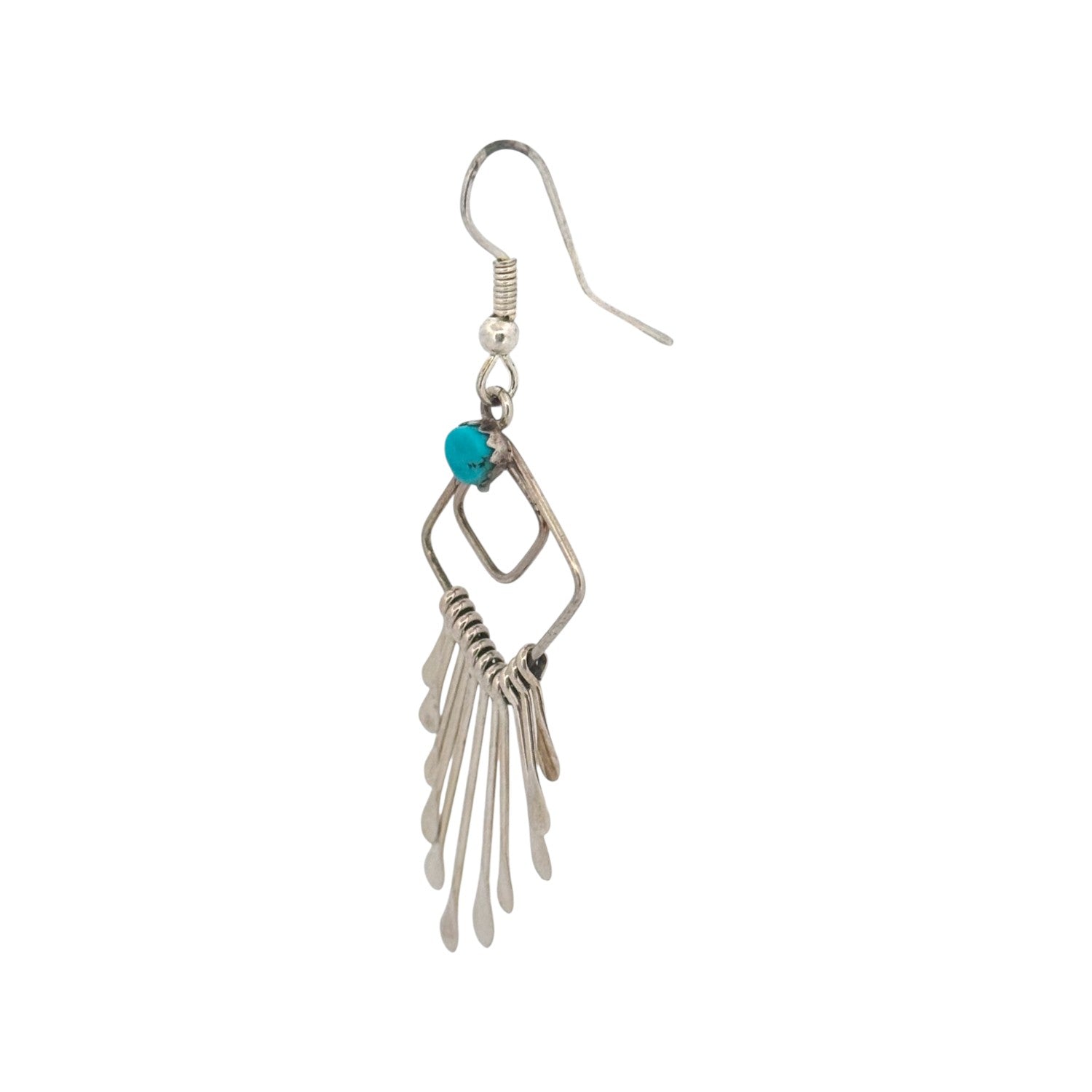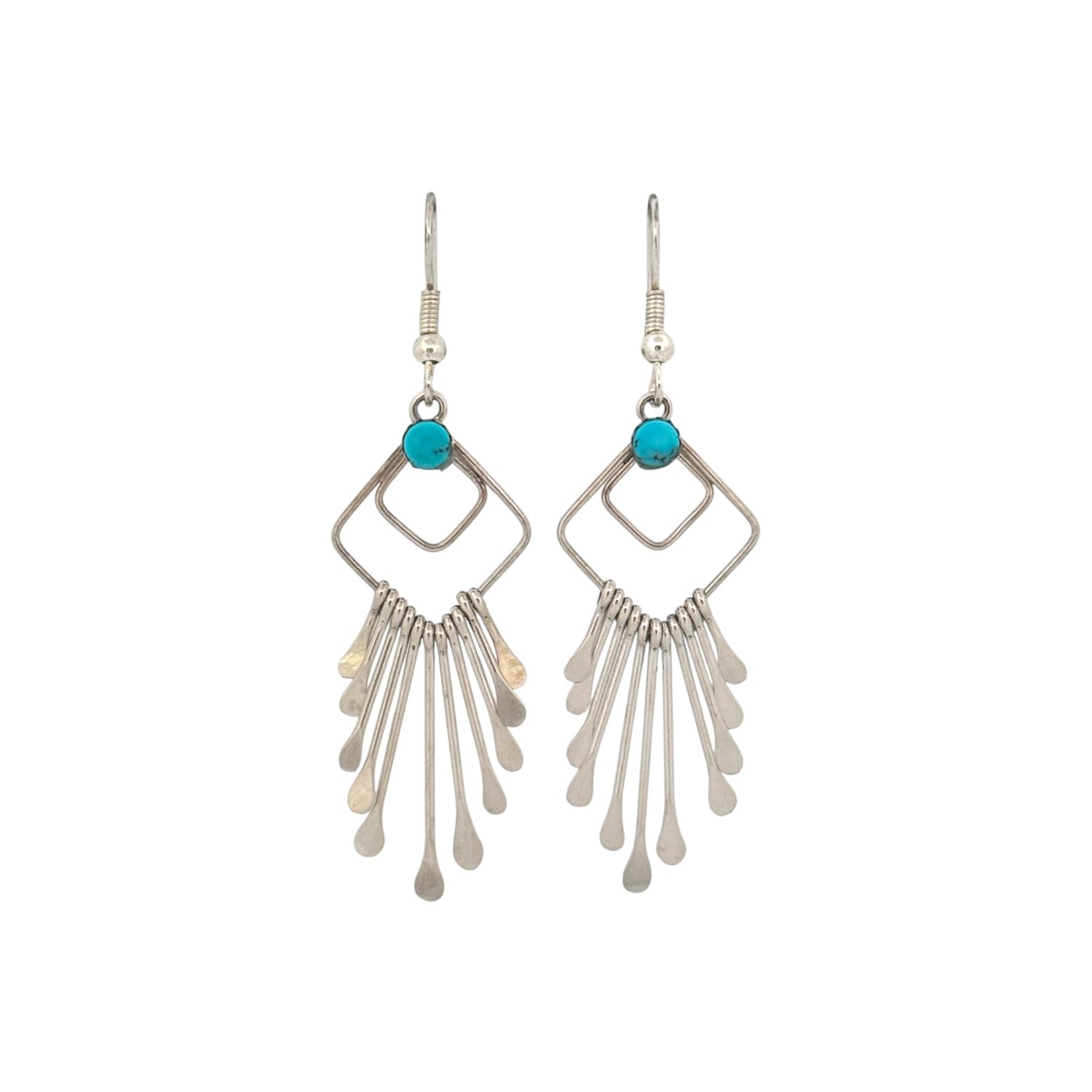 These striking earrings by Navajo artist Delmar Armstrong feature Kingman turquoise and sterling silver in a bold, elegant design. Each earring is anchored by a vibrant turquoise stone set above a diamond-shaped silver frame, symbolizing balance and direction. From the base, cascading silver drops fan outward, creating graceful movement and a sense of flow with every step. The polished silver catches the light beautifully, while the turquoise provides a vivid pop of color that celebrates the connection between earth and sky. Armstrong’s craftsmanship blends traditional Navajo silversmithing with a modern flair, resulting in earrings that are both timeless and contemporary. Lightweight yet dramatic, they are perfect for special occasions or for adding Southwestern artistry to everyday wear.