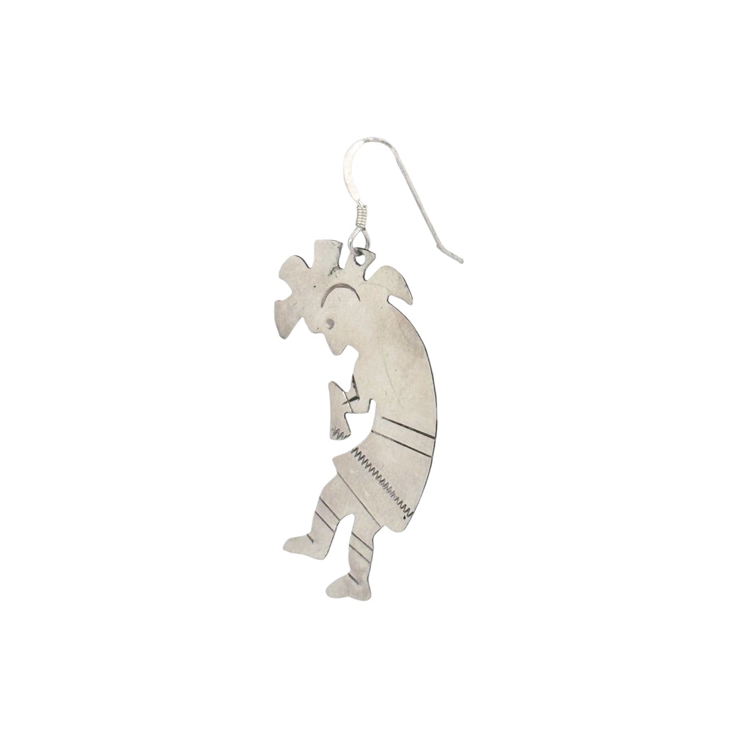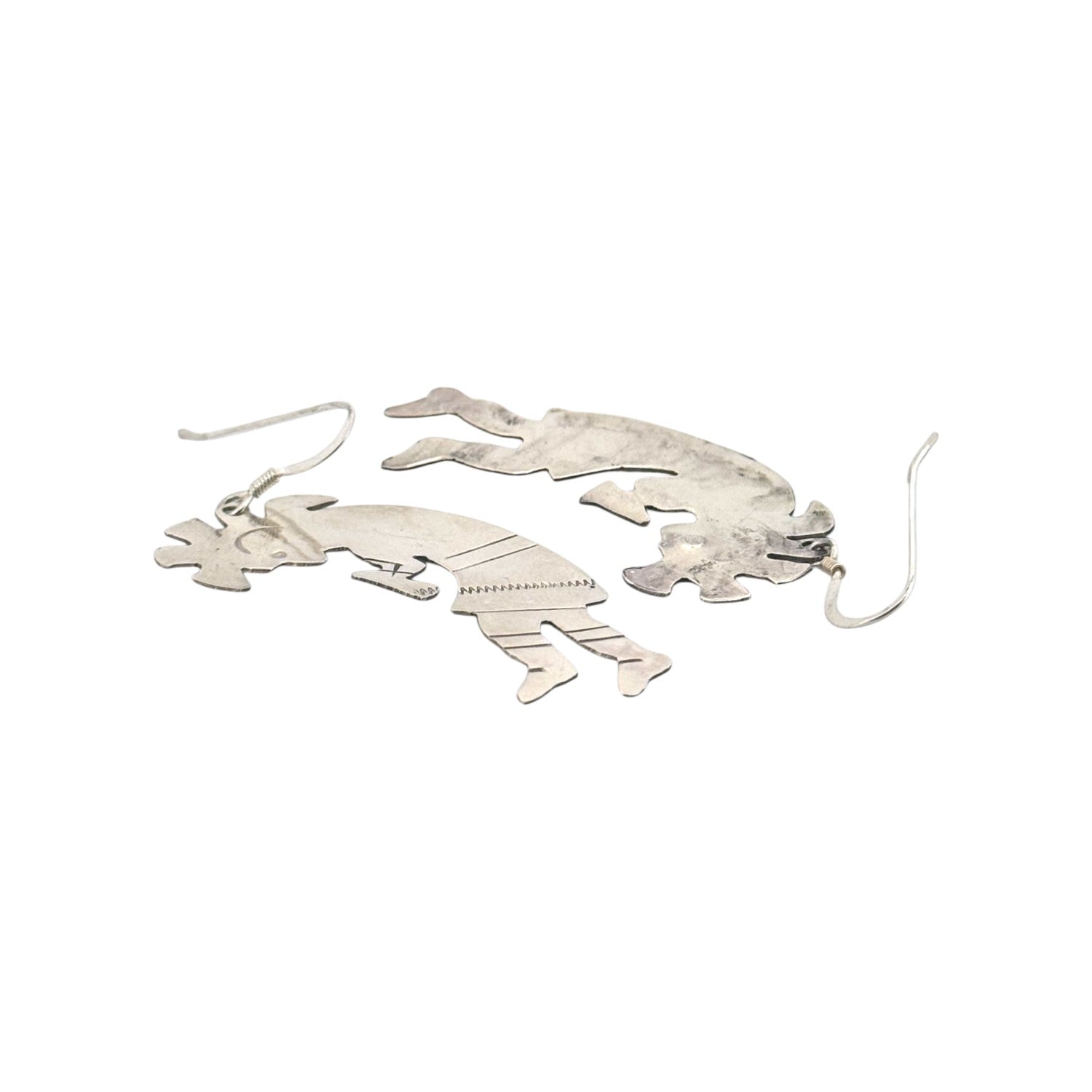 These sterling silver earrings by Navajo artist Marcus Begay feature the iconic Kokopelli design, a celebrated figure in Southwestern art and tradition. Hand-cut and shaped with precision, each earring captures Kokopelli, the flute player, known as a symbol of fertility, joy, and music. Subtle stamped details on the body and clothing add texture and depth, highlighting Begay’s silversmithing skill. The polished silver surface reflects light beautifully, while the openwork silhouette keeps the earrings lightweight and comfortable to wear. Their playful yet meaningful design makes them both a cultural statement and a versatile accessory. Perfect for those who appreciate Native symbolism, these earrings carry the spirit of storytelling, tradition, and artistry.