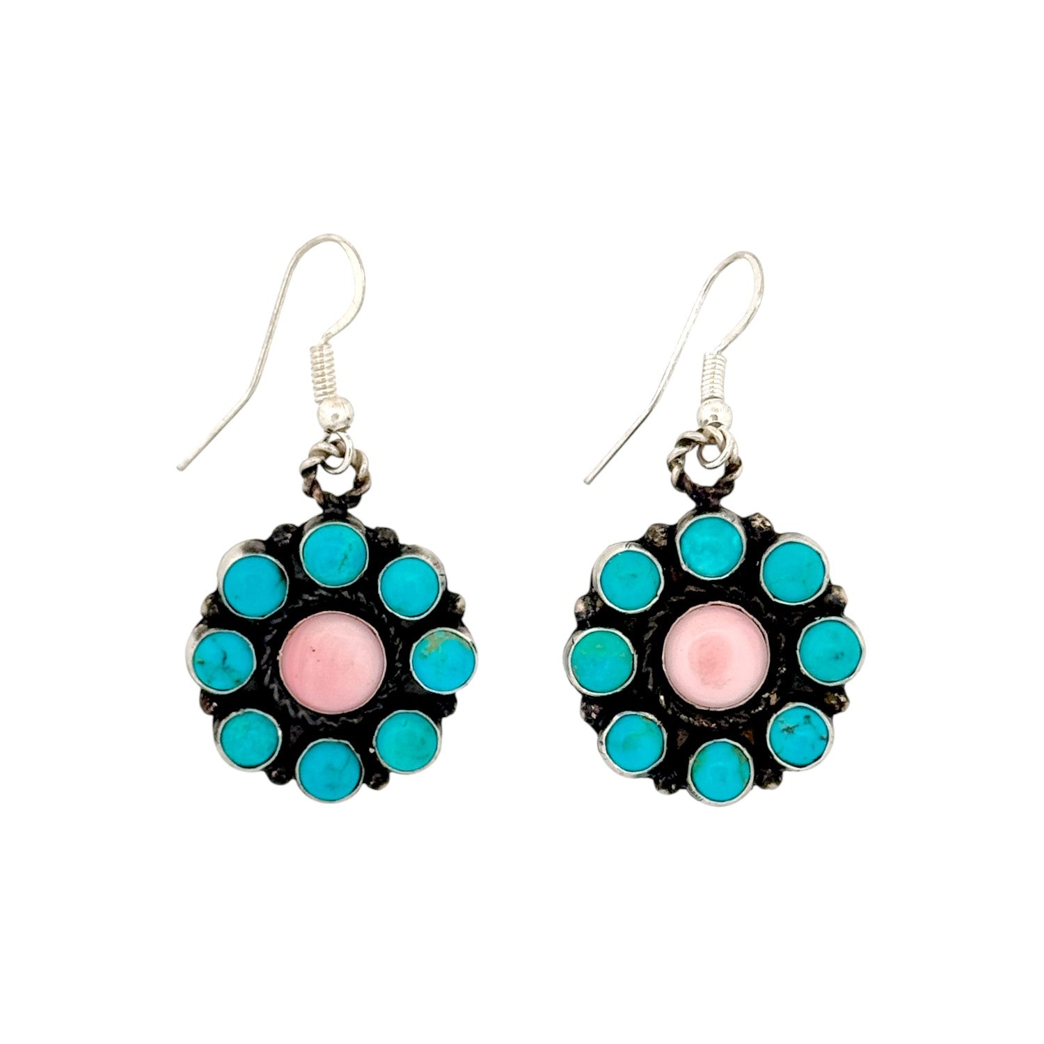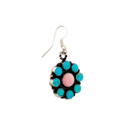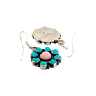 These Navajo handmade earrings by Delvin Brown showcase a vibrant multi-stone design crafted in sterling silver. Each earring features a classic floral cluster pattern, with a soft pink center stone surrounded by brilliant blue turquoise petals. The contrast of colors creates a lively yet balanced composition that reflects harmony and joy, central themes in Navajo artistry. The oxidized silver background highlights the vivid stones while adding depth and character to the piece. Delvin Brown’s expert craftsmanship is evident in the precise stone setting and detailed silverwork, blending traditional techniques with modern appeal.