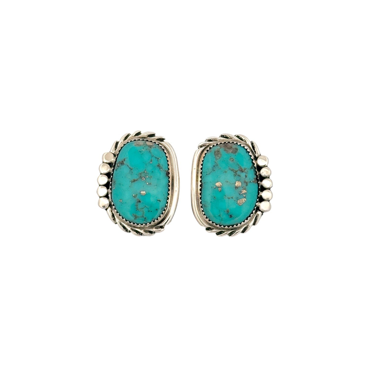 These elegant earrings by Navajo artist Delores Cadman feature rich Persian Turquoise, celebrated for its vibrant blue color and intricate natural matrix. Each stone is set in finely handcrafted sterling silver, framed with Cadman’s signature twisted rope detailing for added depth and refinement. A cluster of polished silver beads enhances the design, bringing a balanced touch of texture and traditional Navajo style. The classic oval silhouette makes these earrings versatile enough for everyday wear while still offering a bold, artisan statement. Beautifully handmade with precision and cultural reverence, they exemplify Cadman’s renowned craftsmanship and timeless Southwestern elegance.