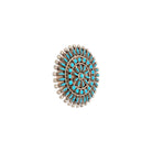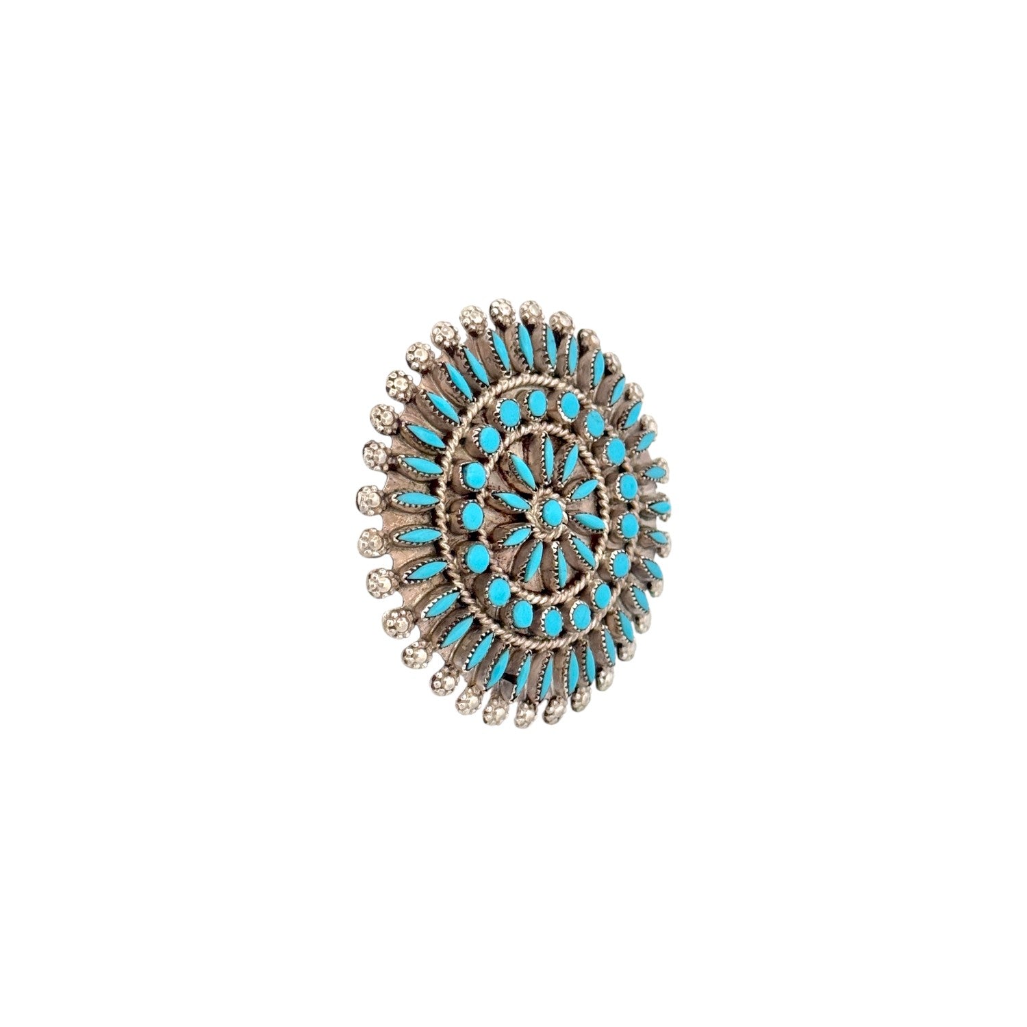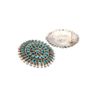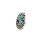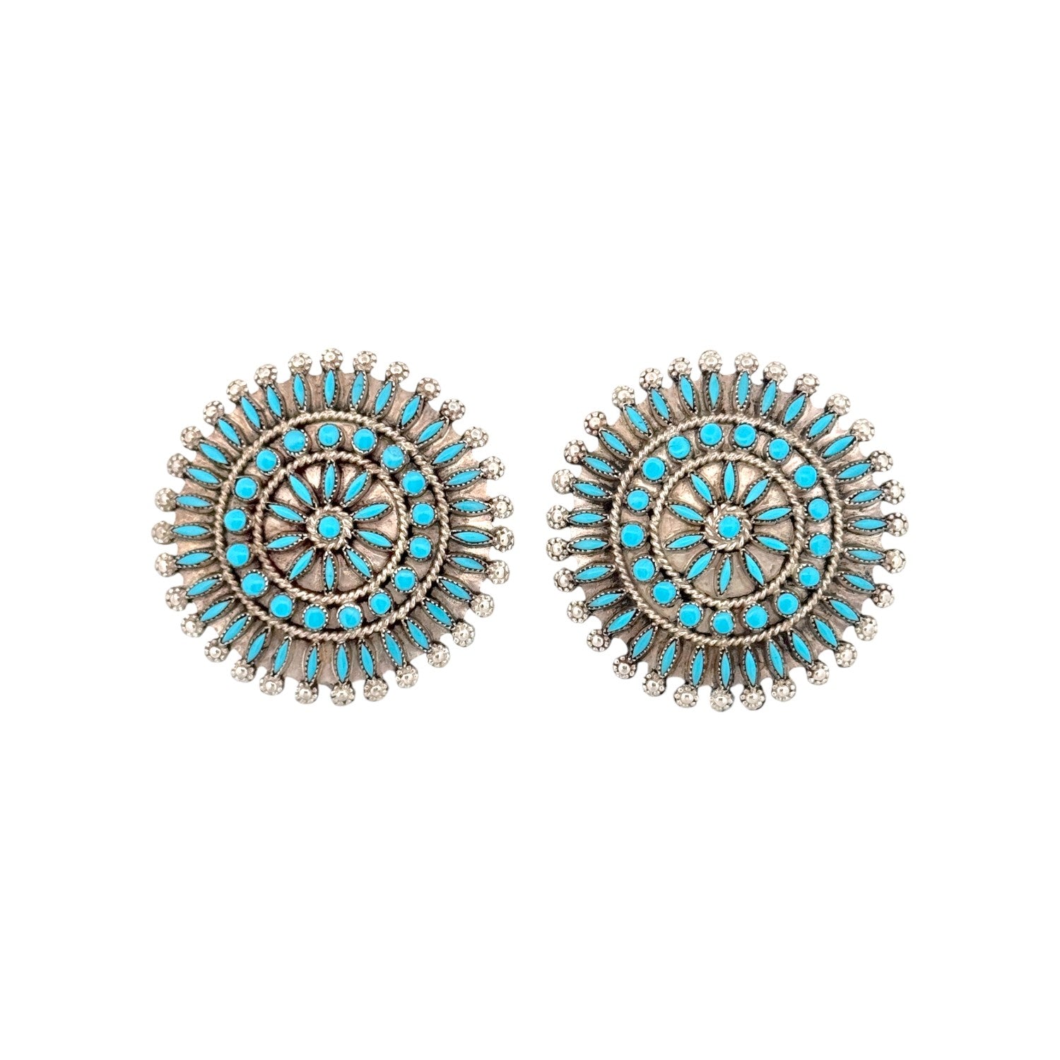 These exquisite earrings by Zuni artist Merlinda Chavez feature the iconic Sleeping Beauty Turquoise, prized for its pure, sky-blue color. Each stone is delicately hand-cut into needlepoint and petit point shapes, arranged in a radiant sunburst pattern that showcases Chavez’s exceptional precision and artistry. The sterling silver settings are meticulously handcrafted, providing a perfect balance of texture and symmetry. Bold yet elegant, these earrings embody classic Zuni design with a refined, timeless beauty. Handmade with remarkable skill, they stand as a striking tribute to one of the most celebrated turquoise sources in the Southwest.
