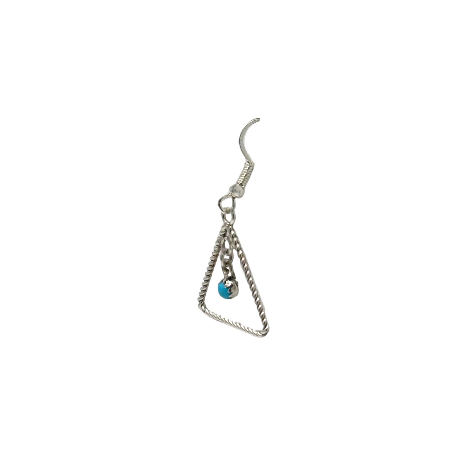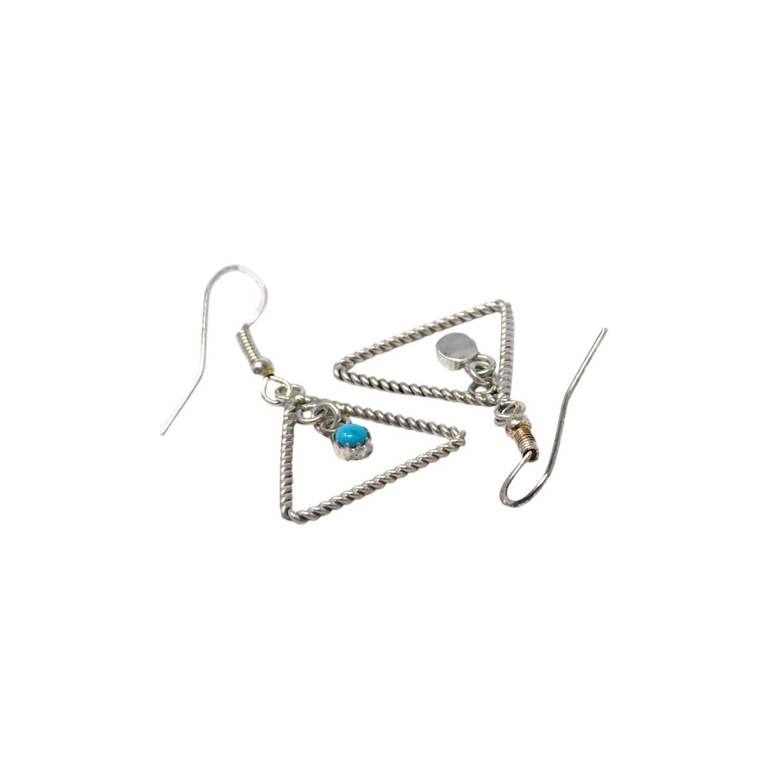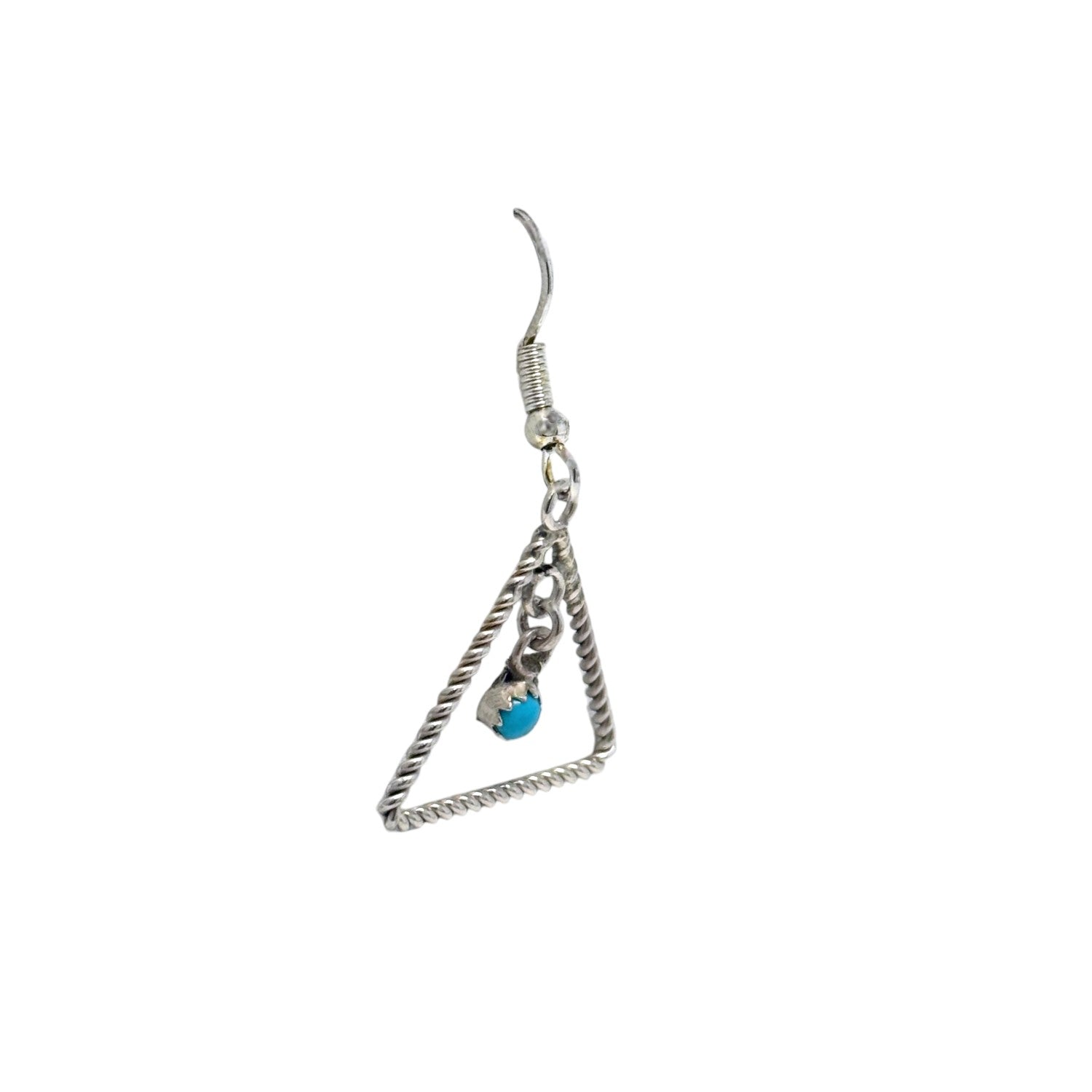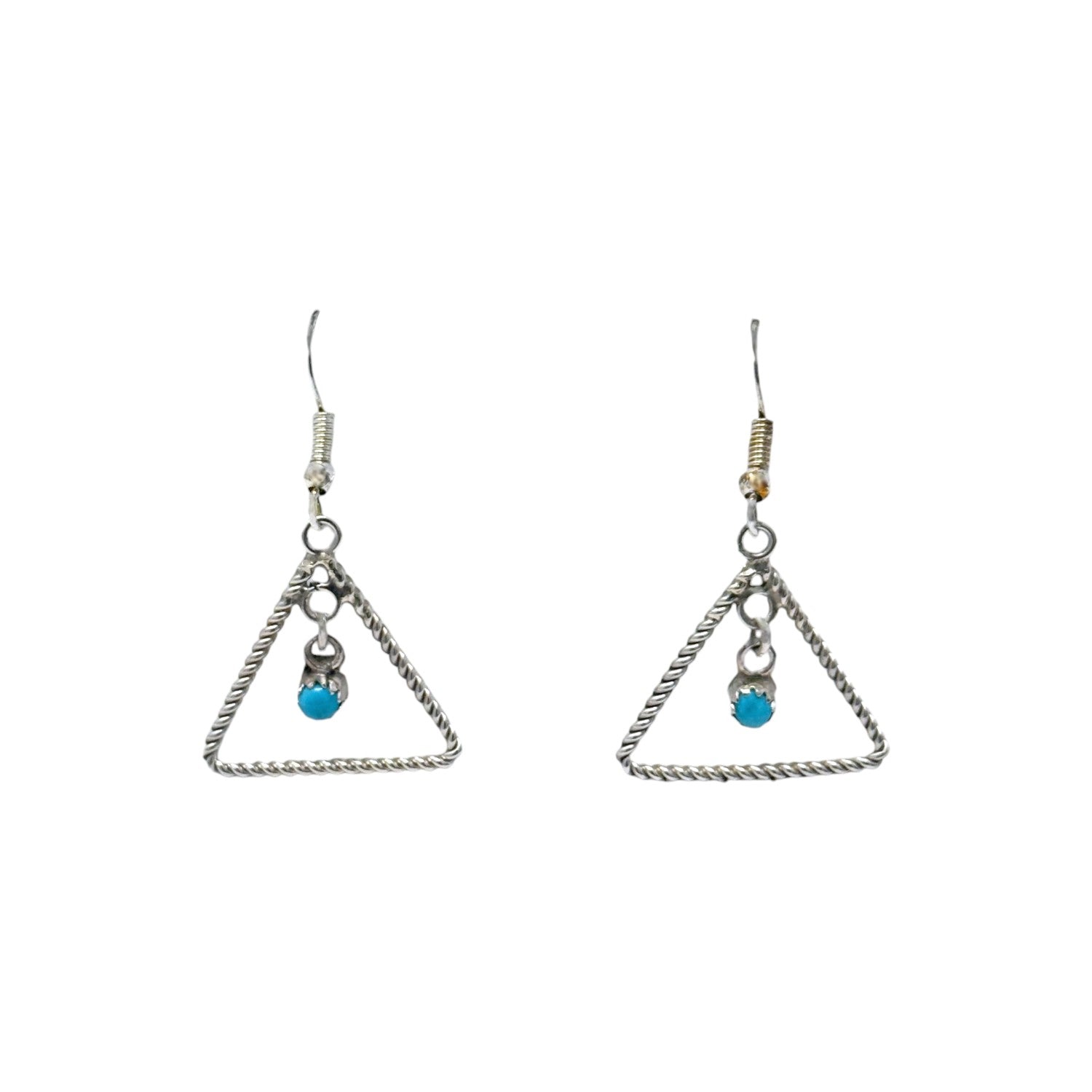 These sterling silver earrings by Navajo silversmith Sylvia Chee are an elegant balance of simplicity and tradition. Each earring is crafted in a triangular drop form with a twisted silver frame, highlighting a single Sleeping Beauty turquoise stone that dangles gracefully at the center. Known for its pure sky-blue hue, Sleeping Beauty turquoise is highly sought after for both its beauty and cultural significance, symbolizing protection and harmony. The oxidized detailing enhances the contrast, bringing depth to the silverwork and emphasizing the vibrant turquoise. Lightweight and versatile, these earrings move gently with the wearer, making them ideal for both daily wear and special occasions.
