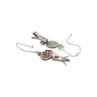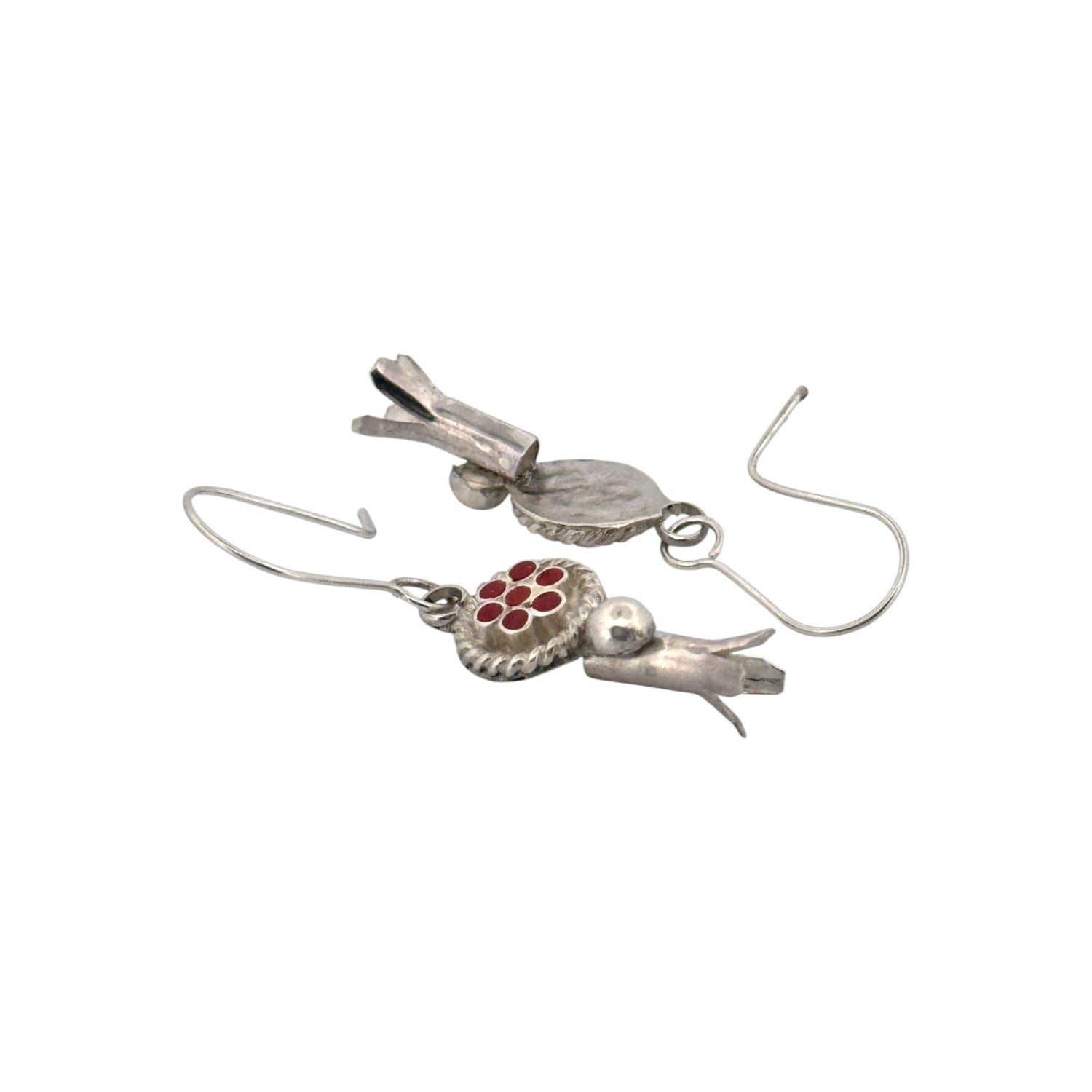 These Zuni handmade earrings by Devin Guam capture the artistry and tradition of Southwest jewelry design. Each earring features a circular sterling silver medallion inlaid with small coral stones arranged in a delicate flower pattern. A twisted silver border frames the coral, adding depth and dimension to the design. Below, a silver dangle element provides graceful movement, giving the earrings a playful yet elegant touch. The natural coral brings a bold red hue, symbolizing life, vitality, and protection in Native jewelry traditions. Lightweight and versatile, these earrings are perfect for daily wear or as a unique statement piece. Crafted with precision and care, they reflect the meticulous lapidary skills for which Zuni artisans are celebrated.