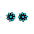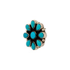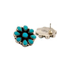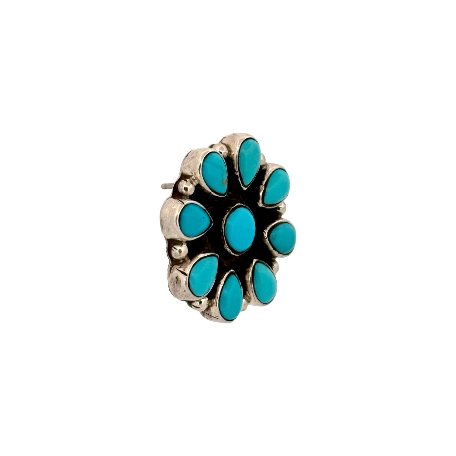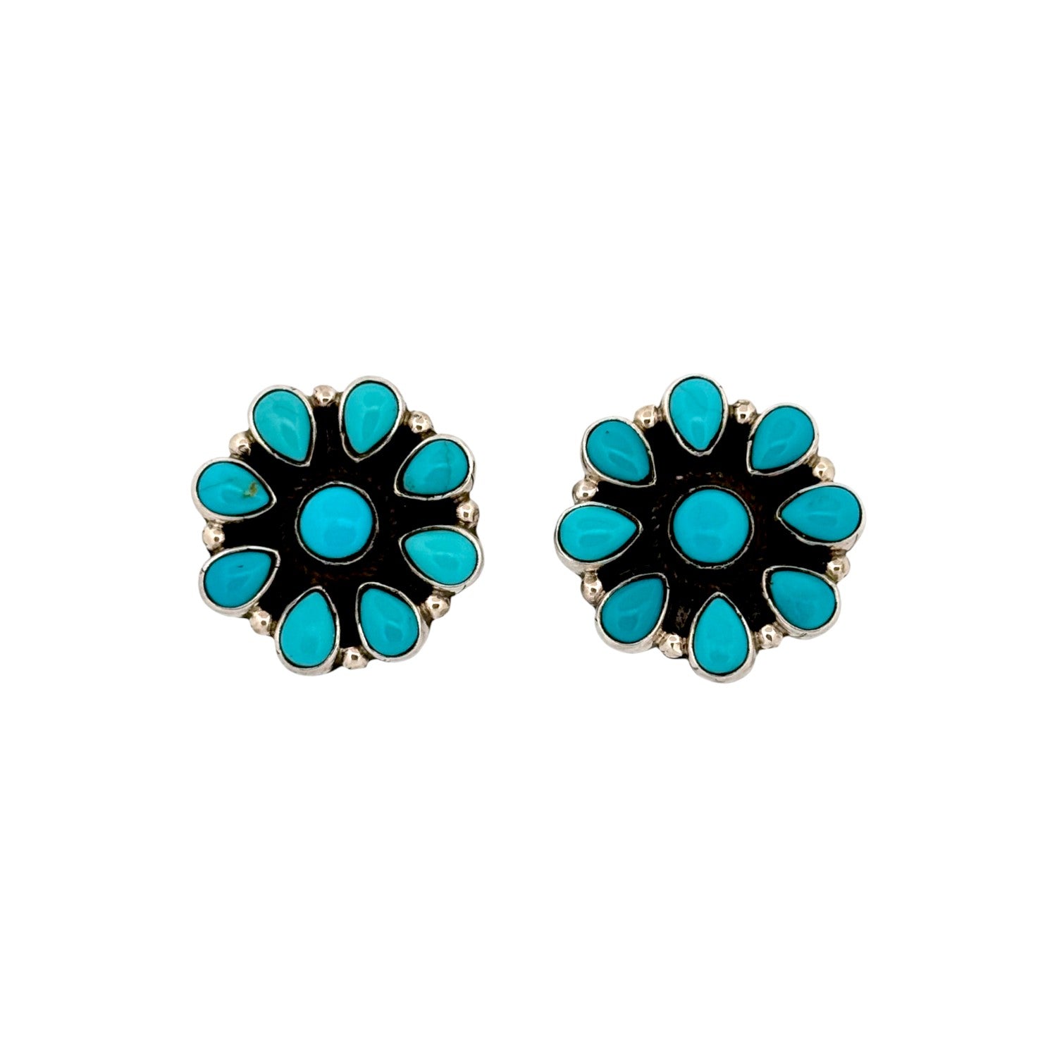 These earrings are a beautiful Navajo handmade creation by artisan Geraldine James. Fashioned from sterling silver, each earring is set with vibrant Kingman turquoise stones arranged in a radiant cluster design. The round center stone is surrounded by teardrop-shaped Kingman Turquoise, forming a classic flower pattern that symbolizes beauty and harmony in Navajo artistry. The high polish of the silver contrasts perfectly with the bright blue stones, giving the earrings a bold yet elegant presence. Lightweight and versatile, they are perfect for both everyday wear and special occasions. Geraldine James’s craftsmanship shines through in the balance of symmetry, stone placement, and traditional Navajo design elements.