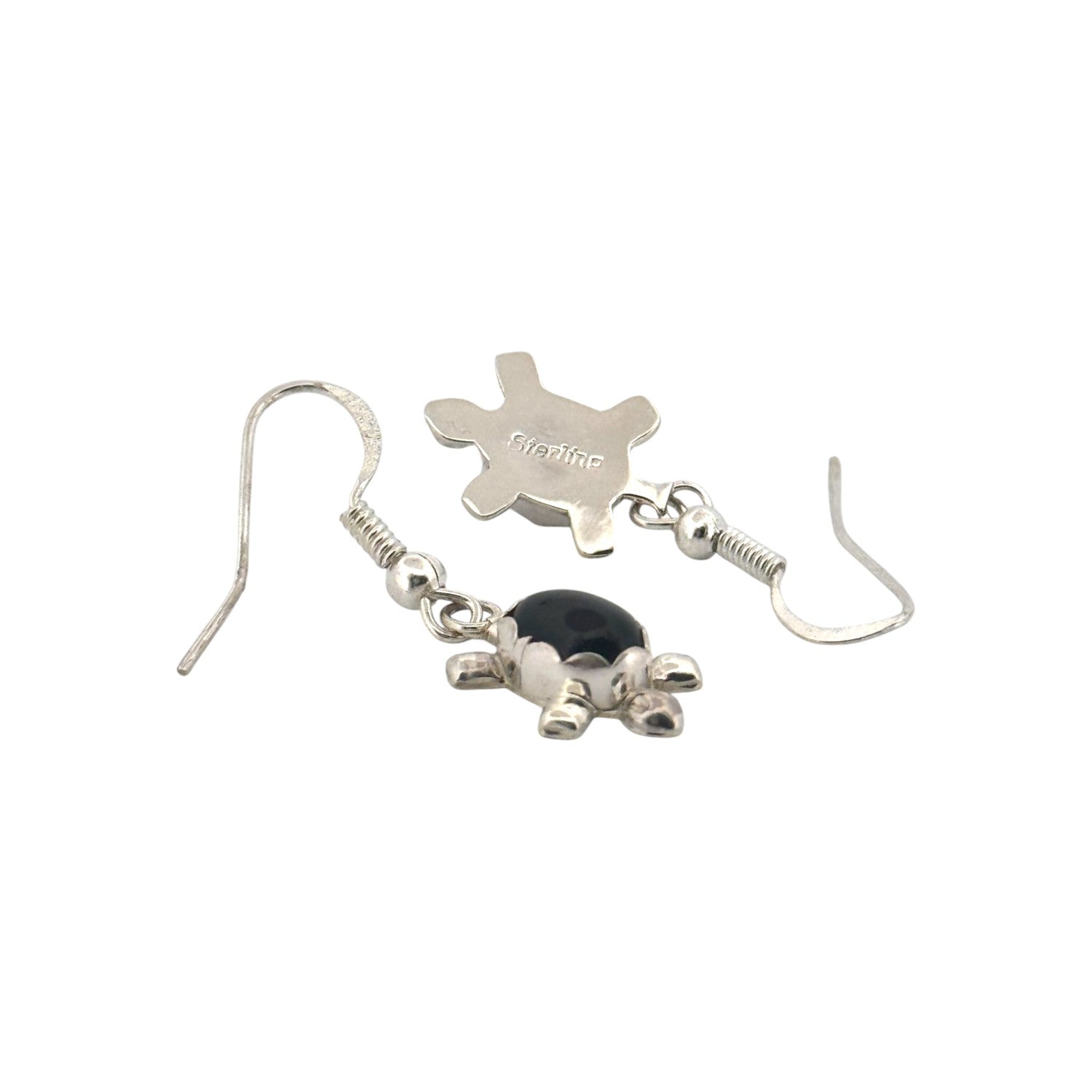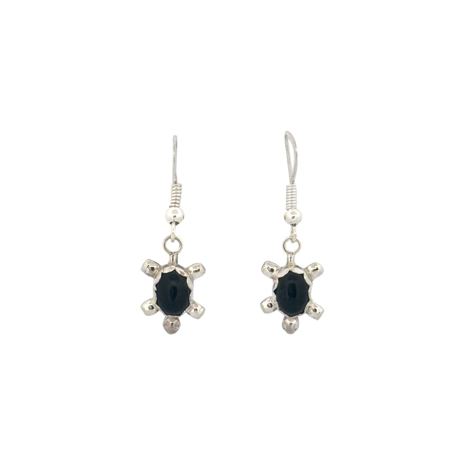 These delightful earrings by Navajo artist Theresa Kinsel feature black onyx set in sterling silver with a symbolic turtle design. The deep black onyx stones are smoothly polished and cut into an oval shape, forming the body of the turtle. Surrounding each stone, silverwork shapes the head, legs, and tail, giving the earrings a playful yet meaningful style. In Navajo tradition, the turtle is often associated with endurance, protection, and a deep connection to the earth. The contrast between the bold black onyx and the bright sterling silver creates a striking visual balance. Lightweight and versatile, these earrings are easy to wear daily while still carrying cultural depth and artisan beauty.
