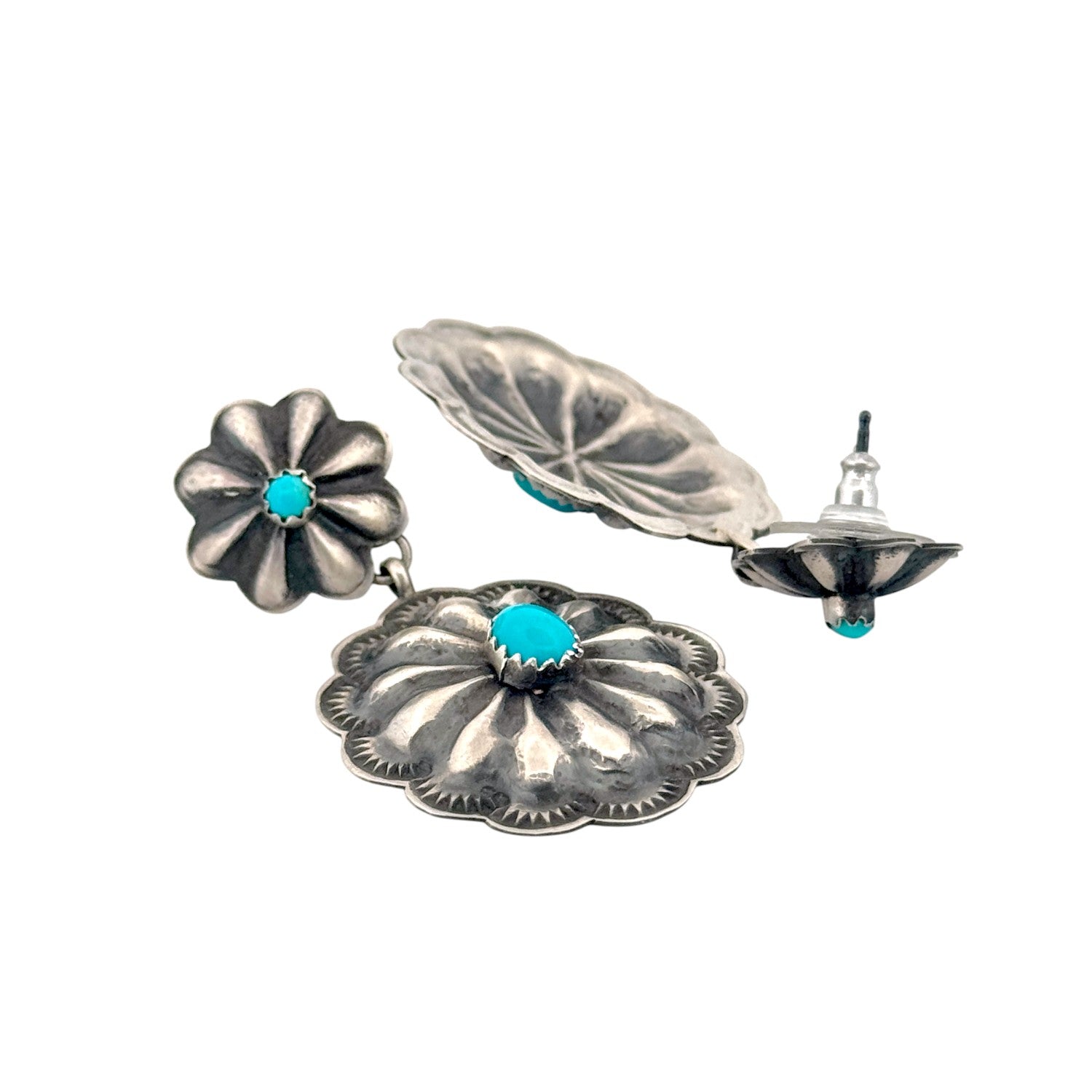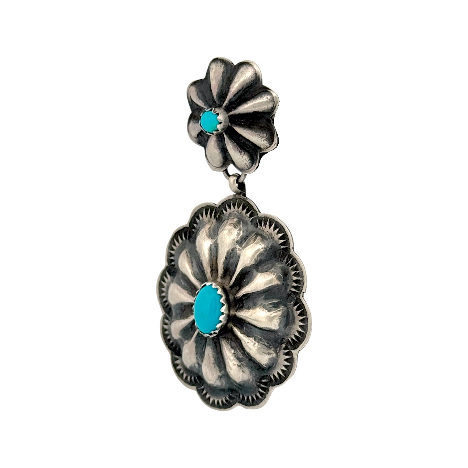 These elegant sterling silver earrings by Navajo artist Rita Lee showcase her refined craftsmanship and timeless design sense. Each earring features two radiant Kingman turquoise stones; one at the center of a smaller flower and another within a larger concho-style blossom below. The deep stamping and repoussé work bring texture and depth, creating a beautiful contrast between polished silver and oxidized detailing. The floral motif, a symbol of growth and beauty, is a recurring element in Lee’s work, reflecting harmony with the natural world.