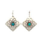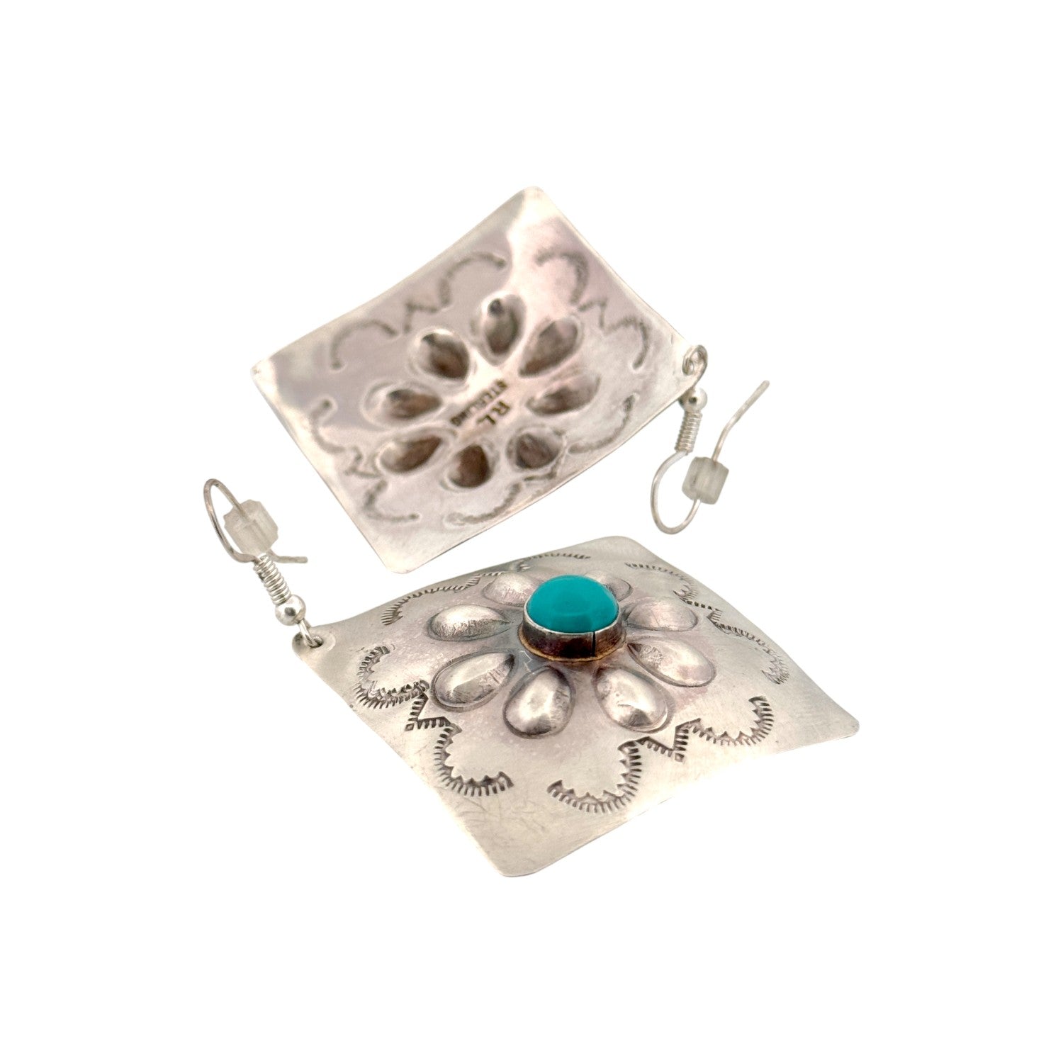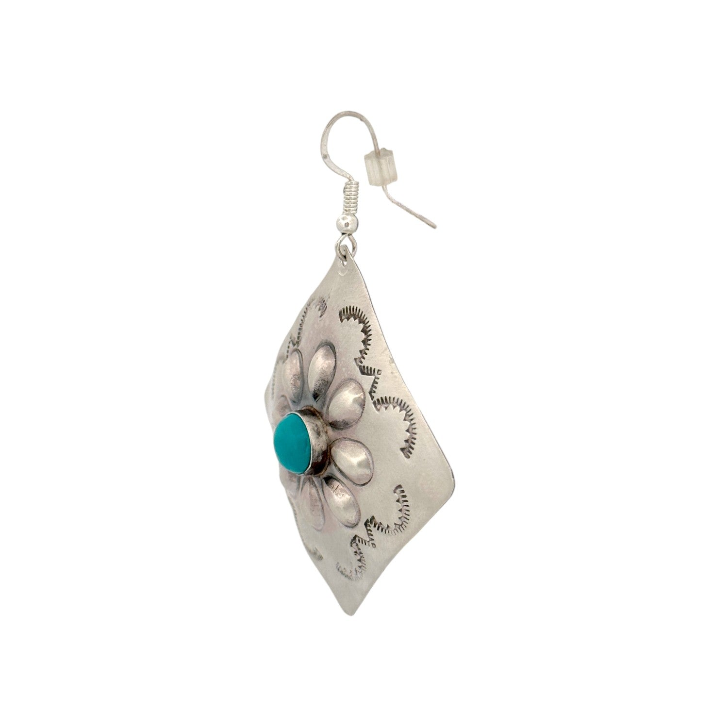 These elegant Navajo handmade earrings by Rita Lee features striking Kingman turquoise set in gleaming sterling silver. Each earring showcases a bold diamond-shaped design, centered with a raised repoussé flower accented by a vibrant turquoise stone. The intricate hand-stamped patterns surrounding the flower highlight Lee’s precision and artistry, creating a perfect balance between traditional Navajo motifs and contemporary flair. The polished silver contrasts beautifully with the oxidized detailing, enhancing depth and texture. Known for her refined craftsmanship, Rita Lee captures both strength and femininity in this timeless design.