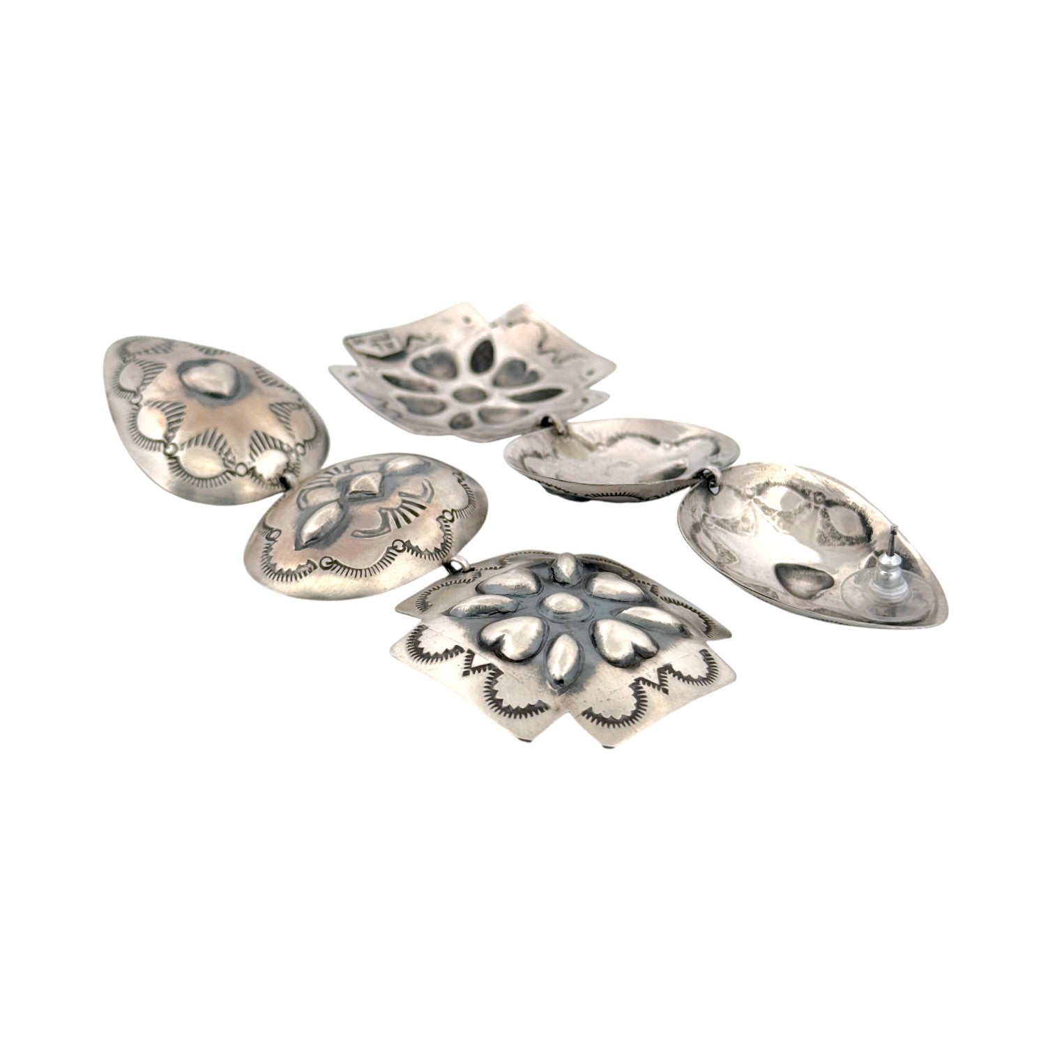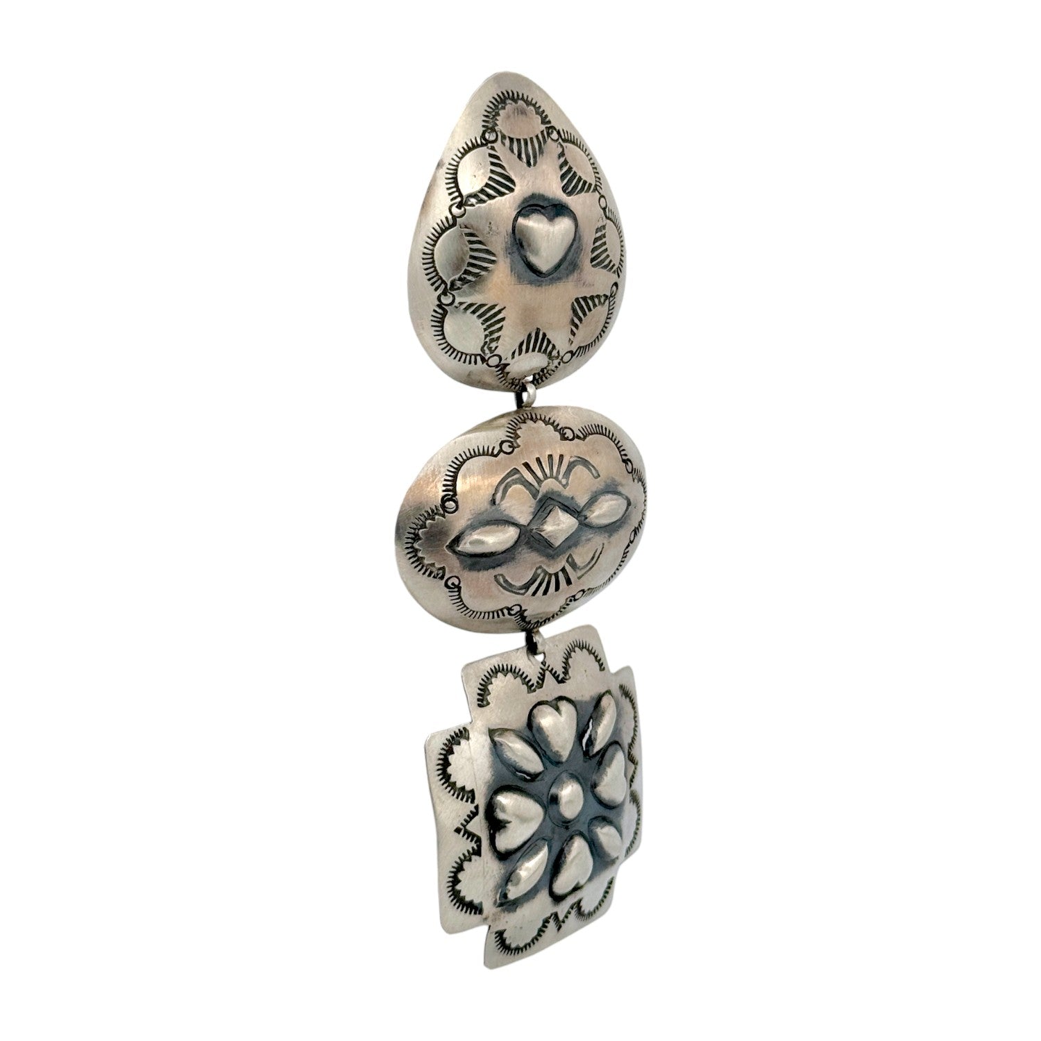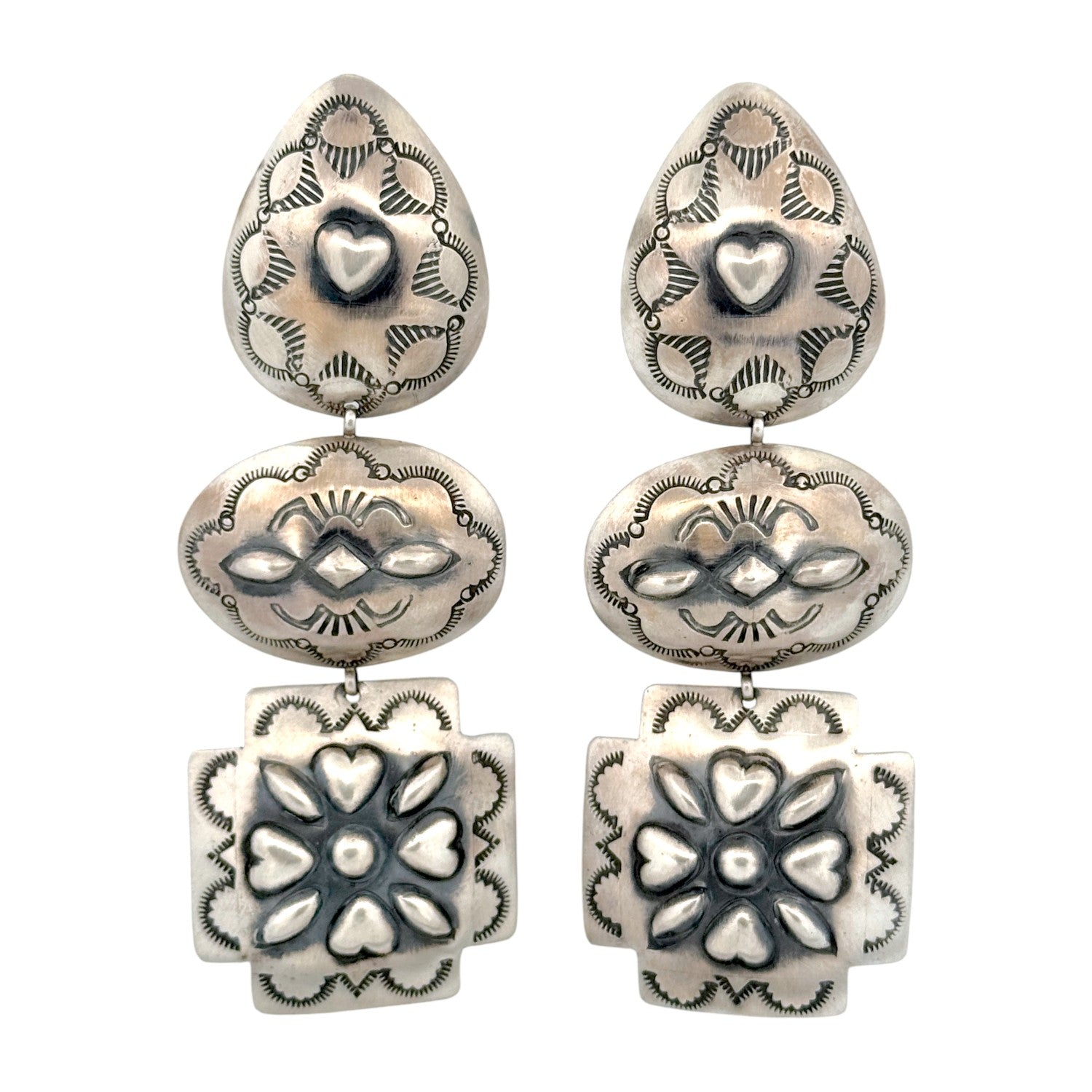 These beautiful Navajo handmade earrings by Rita Lee exemplify her distinctive mastery of sterling silver stamp work and design. Each earring features three linked panels; teardrop, oval, and square each individually hand-stamped with intricate traditional patterns and repoussé accents. The motifs include hearts, florals, and geometric designs, symbolizing love, life, and balance in Navajo culture. The oxidized background enhances the depth of the raised silverwork, giving the earrings a rich, vintage patina. Despite their bold appearance, they are thoughtfully balanced for comfortable wear and graceful movement.