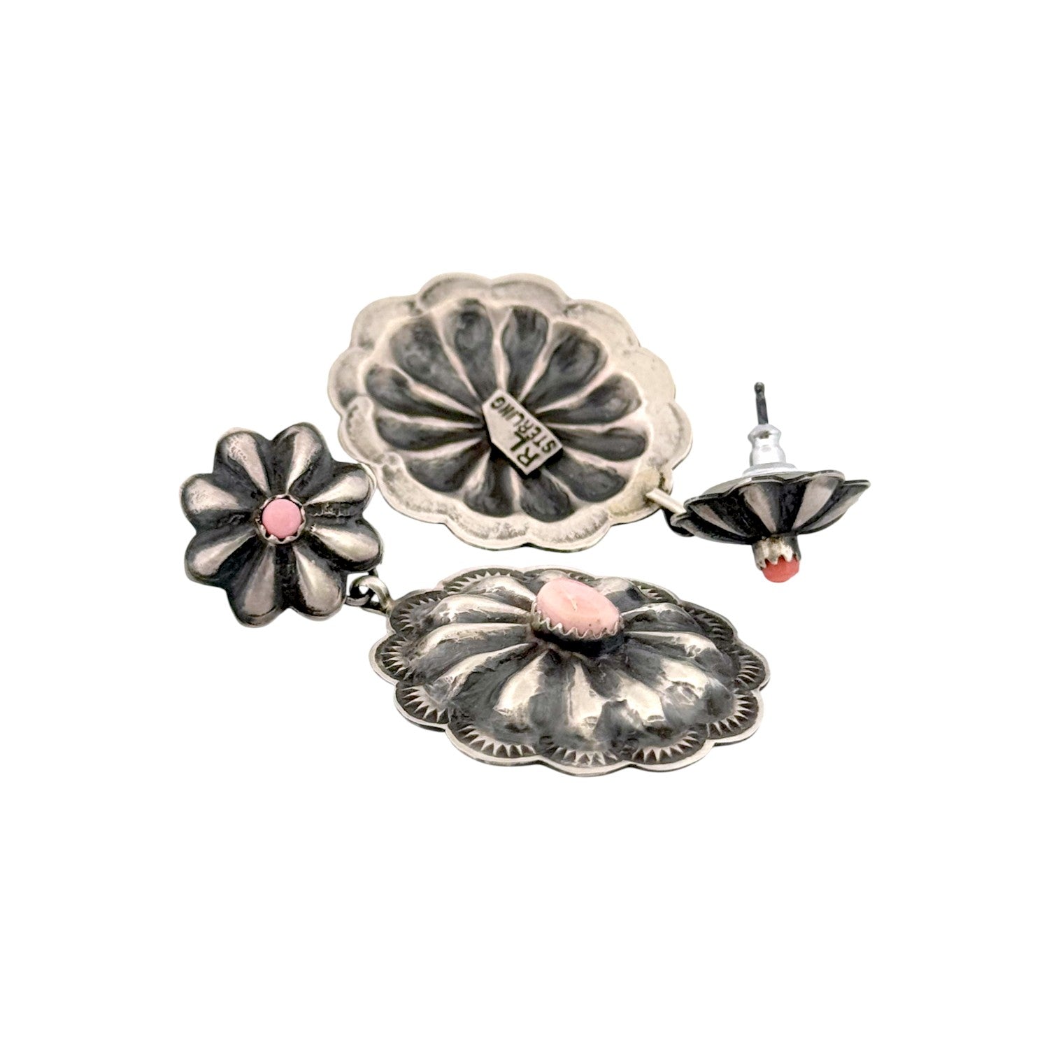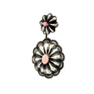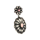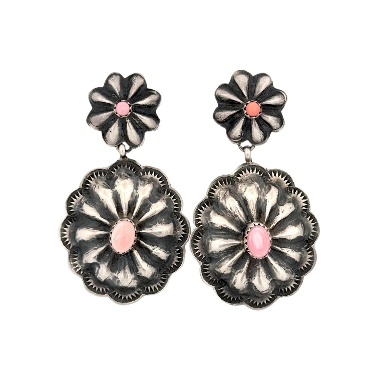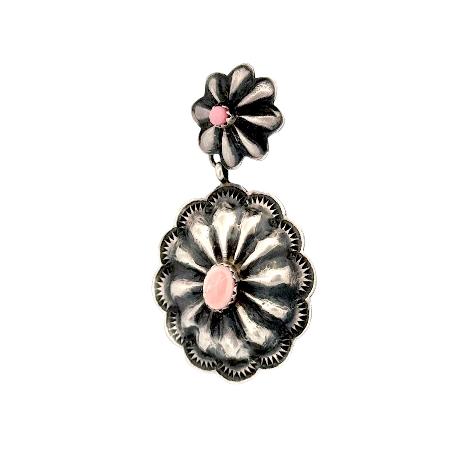 These Navajo handmade earrings by Rita Lee are a beautiful blend of traditional silversmithing and soft, feminine detail. Crafted in sterling silver, each earring features a bold concho-style design with intricate stamping and repoussée work. At the heart of both the top and bottom flowers rests a polished pink conch shell cabochon, adding a delicate pop of color against the oxidized silver. The floral motif captures the spirit of Navajo artistry, symbolizing growth and harmony. Lightweight yet eye-catching, these earrings offer both comfort and statement-worthy style. Rita Lee’s craftsmanship highlights the balance of strength and elegance, making them versatile for both everyday wear and special occasions.