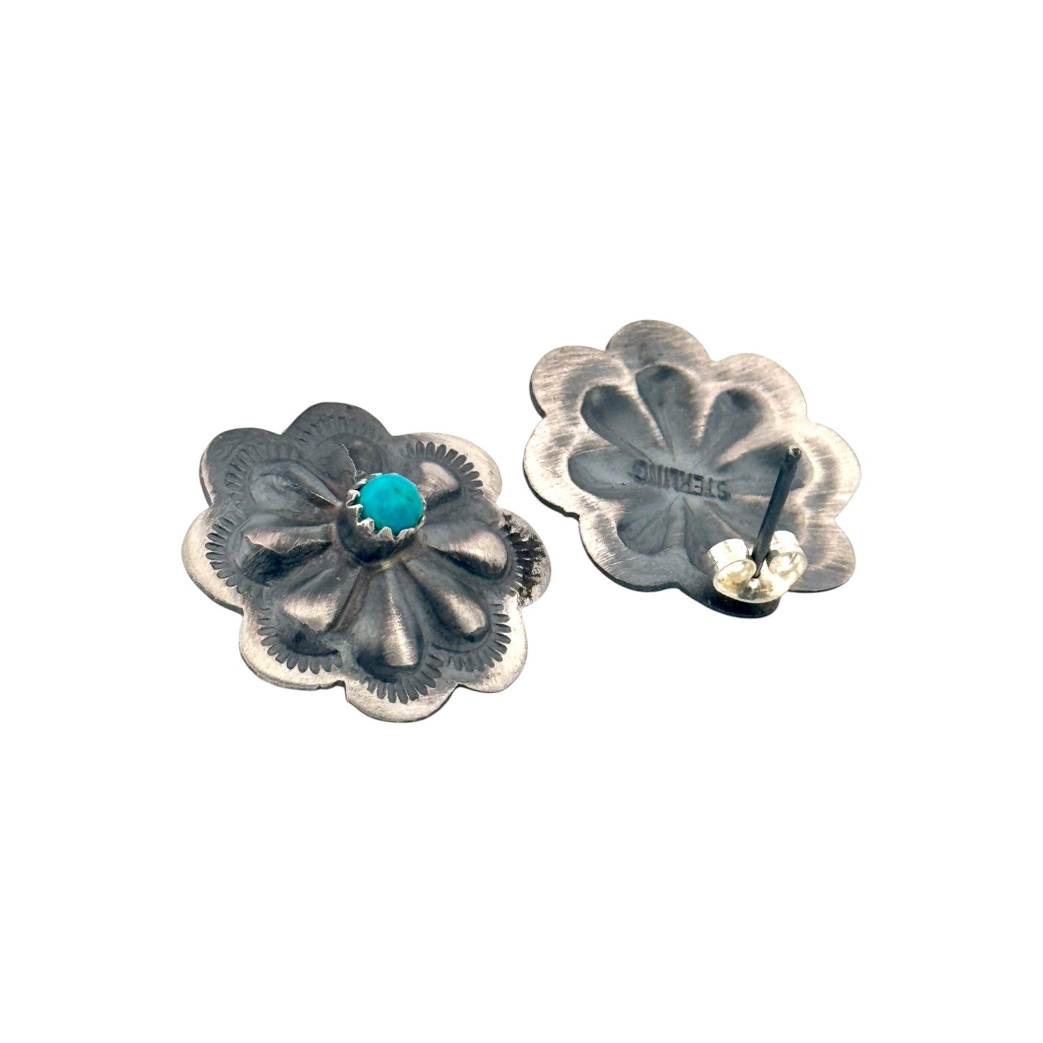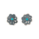 These Navajo handmade earrings by Dale Morgan feature a charming floral design, blending traditional artistry with timeless elegance. Each earring is crafted in sterling silver and adorned with a single round Kingman Turquoise stone at the center, adding a vivid pop of color against the hand-stamped petals. The detailed silverwork highlights Navajo craftsmanship, with oxidized accents enhancing the depth and texture of the design. The turquoise stones, with their signature blue hue and natural matrix, symbolize beauty and protection. Lightweight and versatile, these earrings are perfect for daily wear or special occasions, carrying both cultural significance and style. Their floral motif makes them a celebration of nature and tradition.