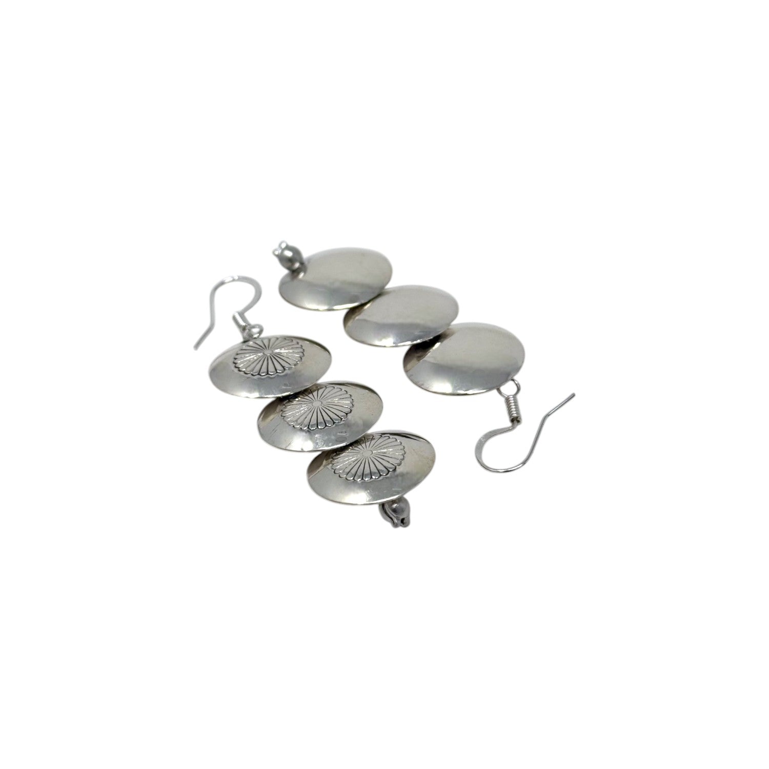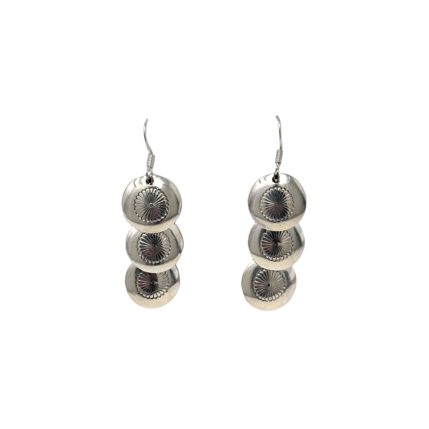 These sterling silver earrings by Navajo silversmith Ina Nez are a bold and elegant expression of traditional craftsmanship. Each earring is composed of three hand-stamped silver conchos, arranged in a cascading design that creates movement and brilliance with every step. The intricate stamp work radiates from the center of each concho, reflecting the precision and artistry passed down through generations of Navajo silversmithing. Lightweight yet eye-catching, these earrings carry both a timeless simplicity and a refined sophistication, making them versatile for everyday wear or formal occasions. The polished silver surface contrasts beautifully with the stamped details, giving depth and texture to the design.