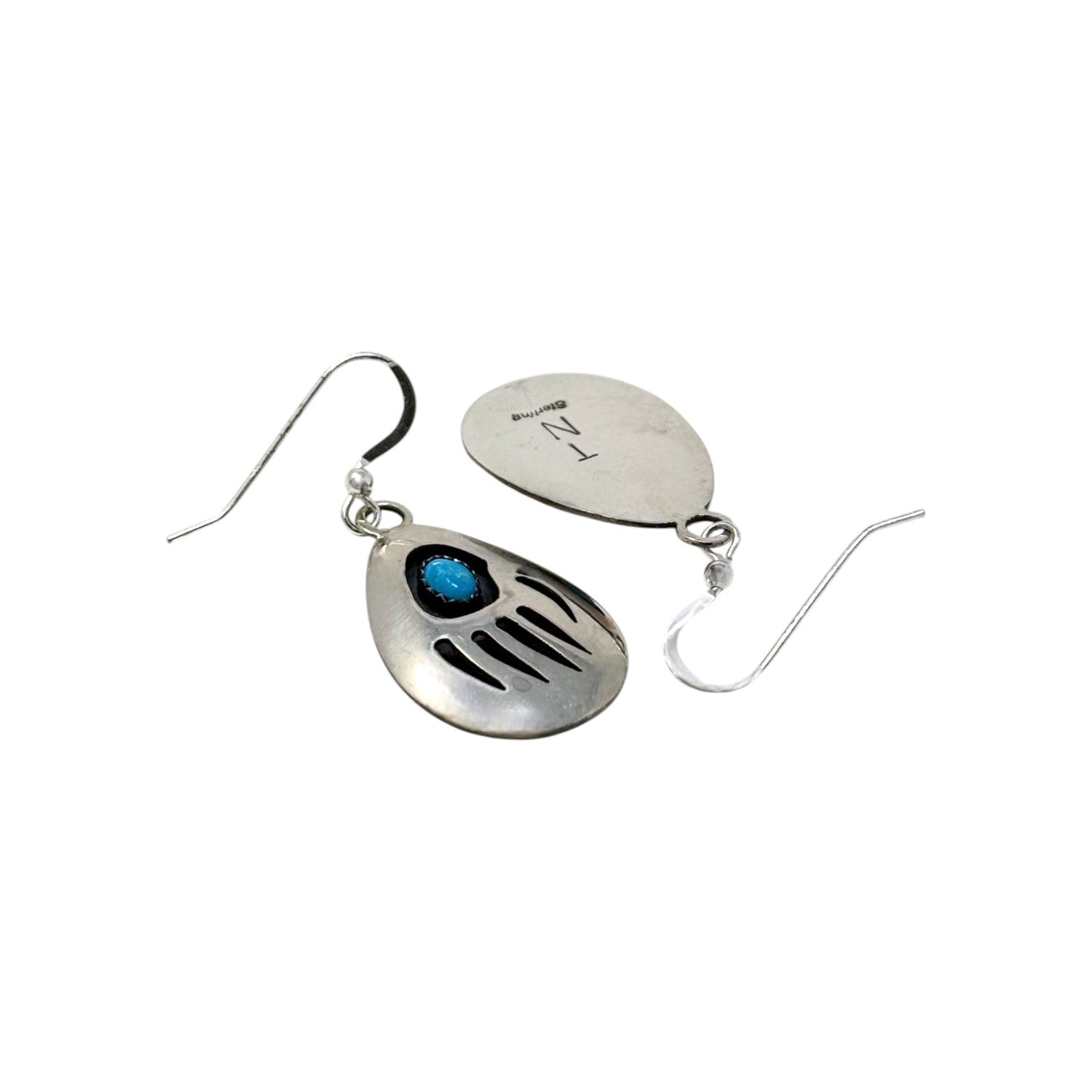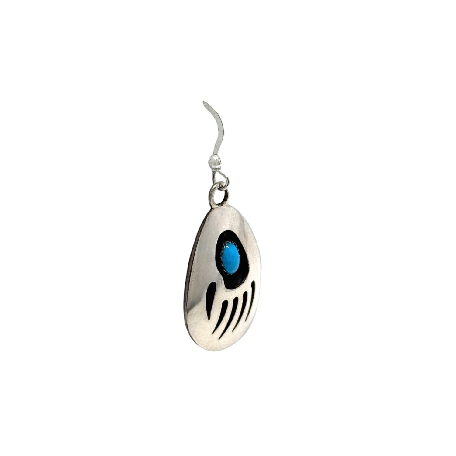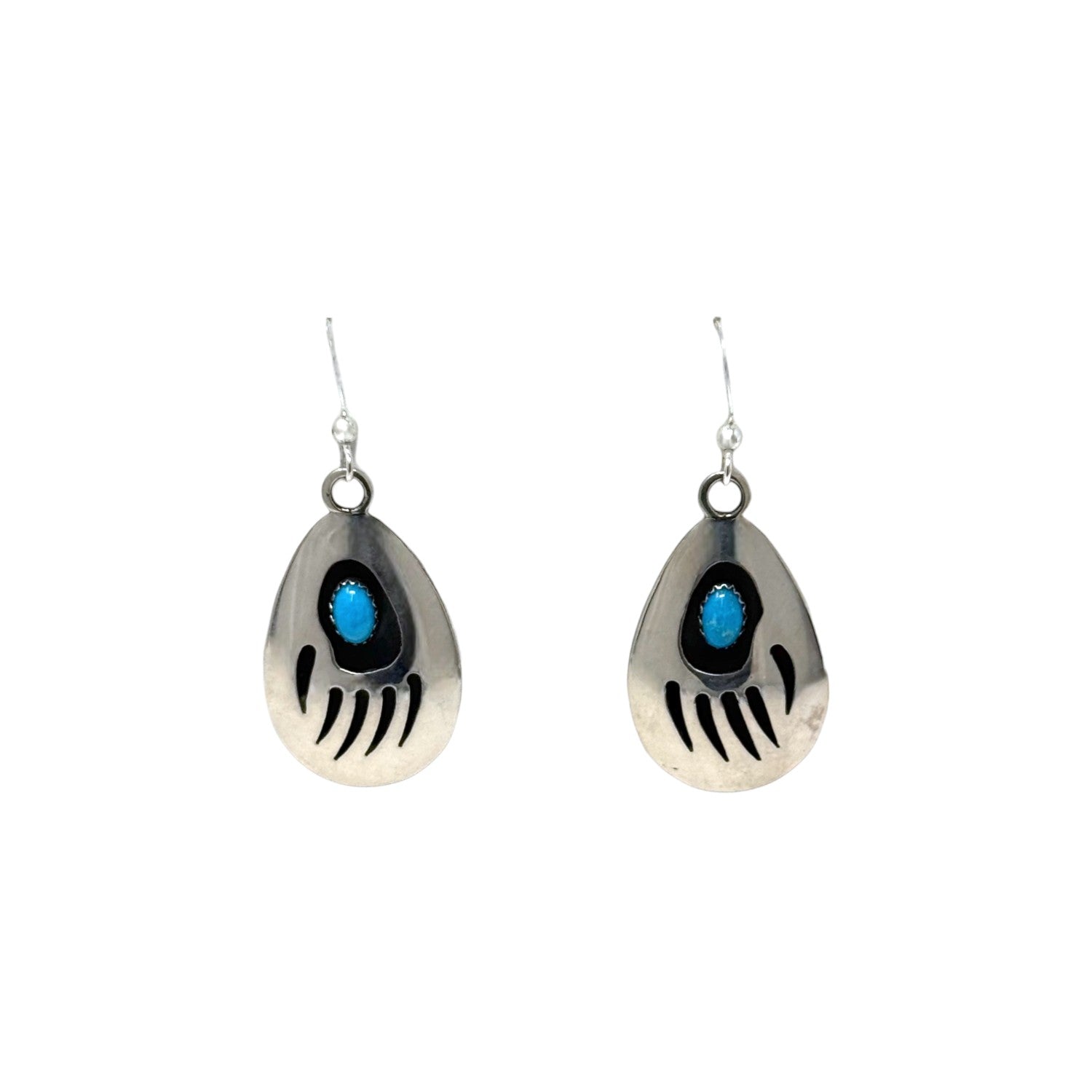 These sterling silver earrings by Navajo silversmith Thomas Nez embody both cultural symbolism and refined craftsmanship. Each teardrop-shaped earring features a Kingman turquoise cabochon, celebrated for its brilliant sky-blue hue and natural character. The turquoise is framed within a bold bear paw design, a powerful Navajo symbol of strength, protection, and guidance. Dark oxidized backgrounds provide striking contrast, highlighting both the stone and the carefully cut silverwork. Lightweight yet impactful, these earrings move gracefully, making them ideal for everyday wear or as a meaningful statement on special occasions.