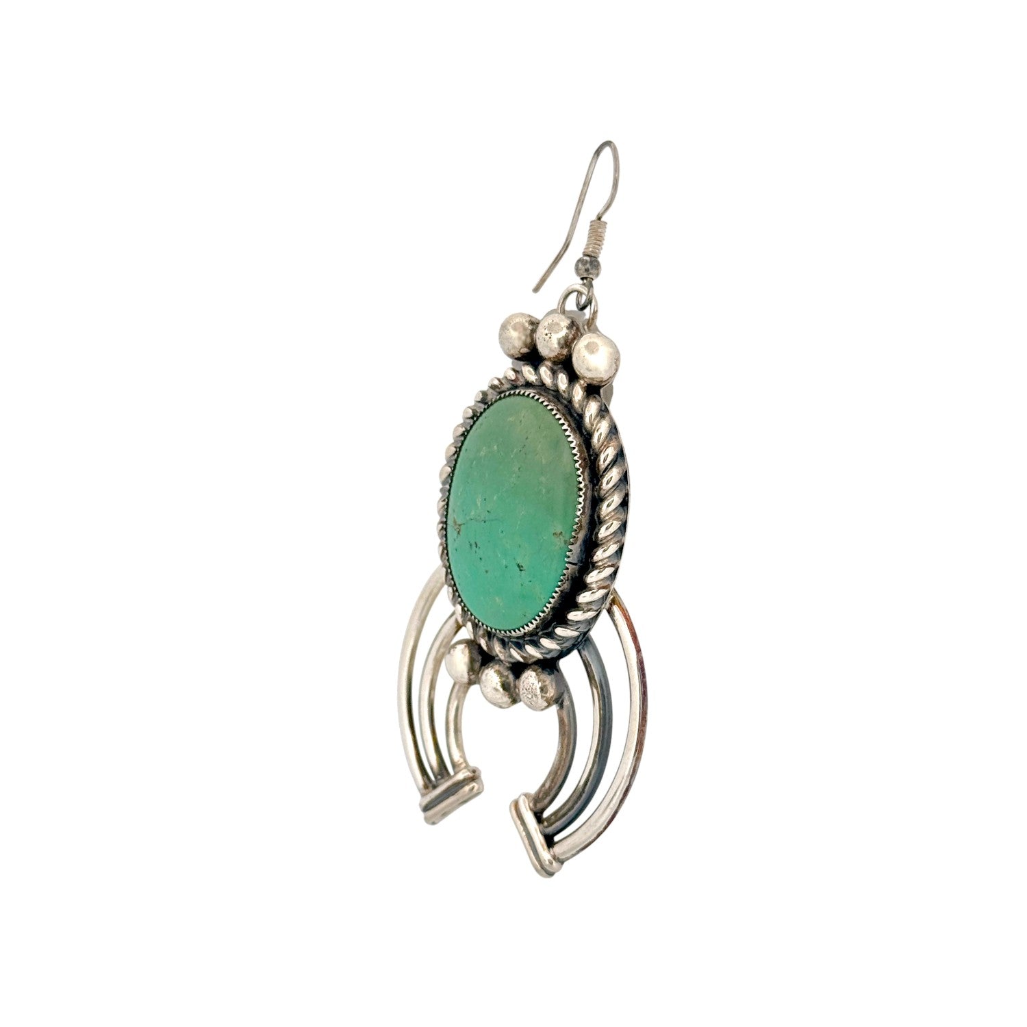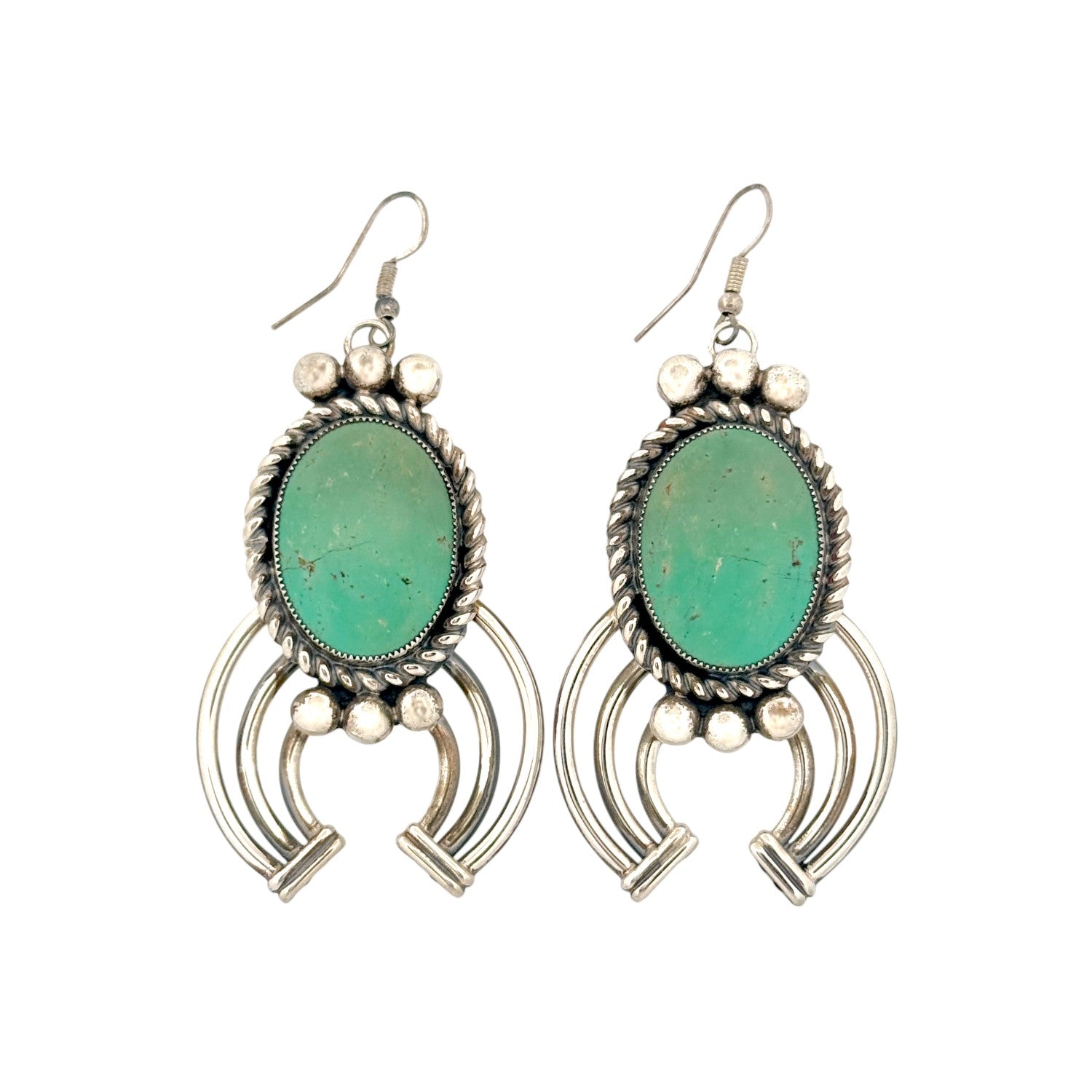 These stunning earrings by Navajo artist Limbert Perry feature captivating Royston Turquoise, known for its rich green hues and natural character. Each stone is beautifully framed in hand-twisted sterling silver rope work, showcasing Perry’s mastery of traditional Navajo silversmithing. Triple-arc silver drops and polished bead accents create graceful movement and an elegant, balanced silhouette. The design blends bold Southwest style with refined artistry, making these earrings a standout piece for any jewelry collection. Handmade with care and cultural reverence, they embody the timeless spirit of Navajo craftsmanship.