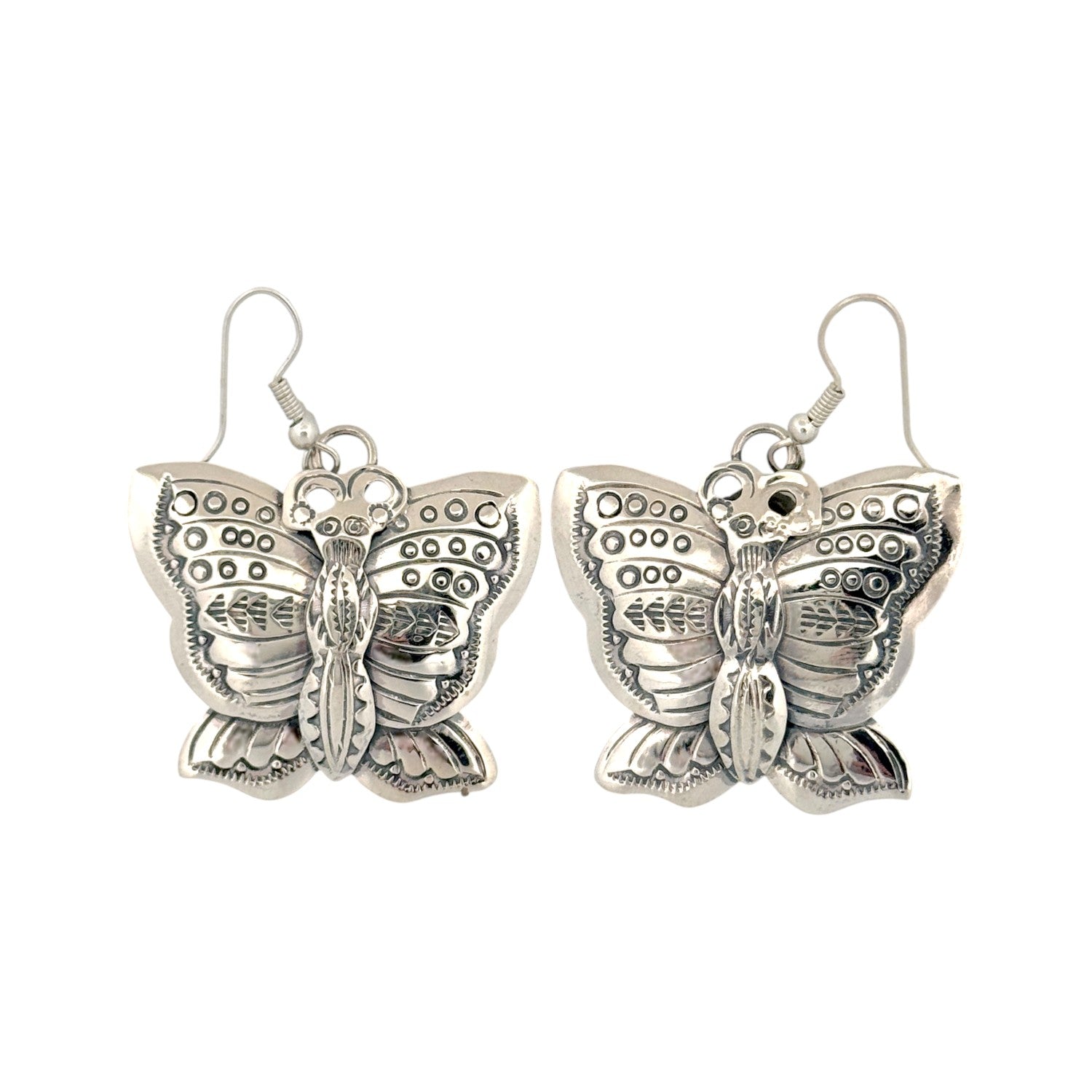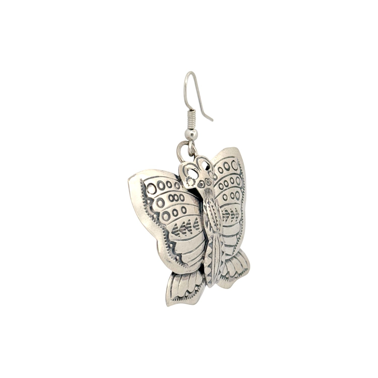 These beautifully detailed sterling silver earrings by Navajo artist Limbert Perry celebrate transformation and grace through the symbolic form of the butterfly. Each earring is meticulously hand-stamped and formed, showcasing Perry’s precision and artistic vision. The wings are adorned with intricate patterns that catch the light, giving the butterflies a lifelike sense of movement and depth. The oxidized accents emphasize the fine craftsmanship, while the polished surfaces add a radiant shine. Suspended from French hooks, these earrings are lightweight and comfortable, perfect for everyday wear or special occasions.
