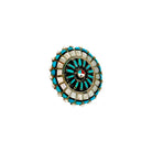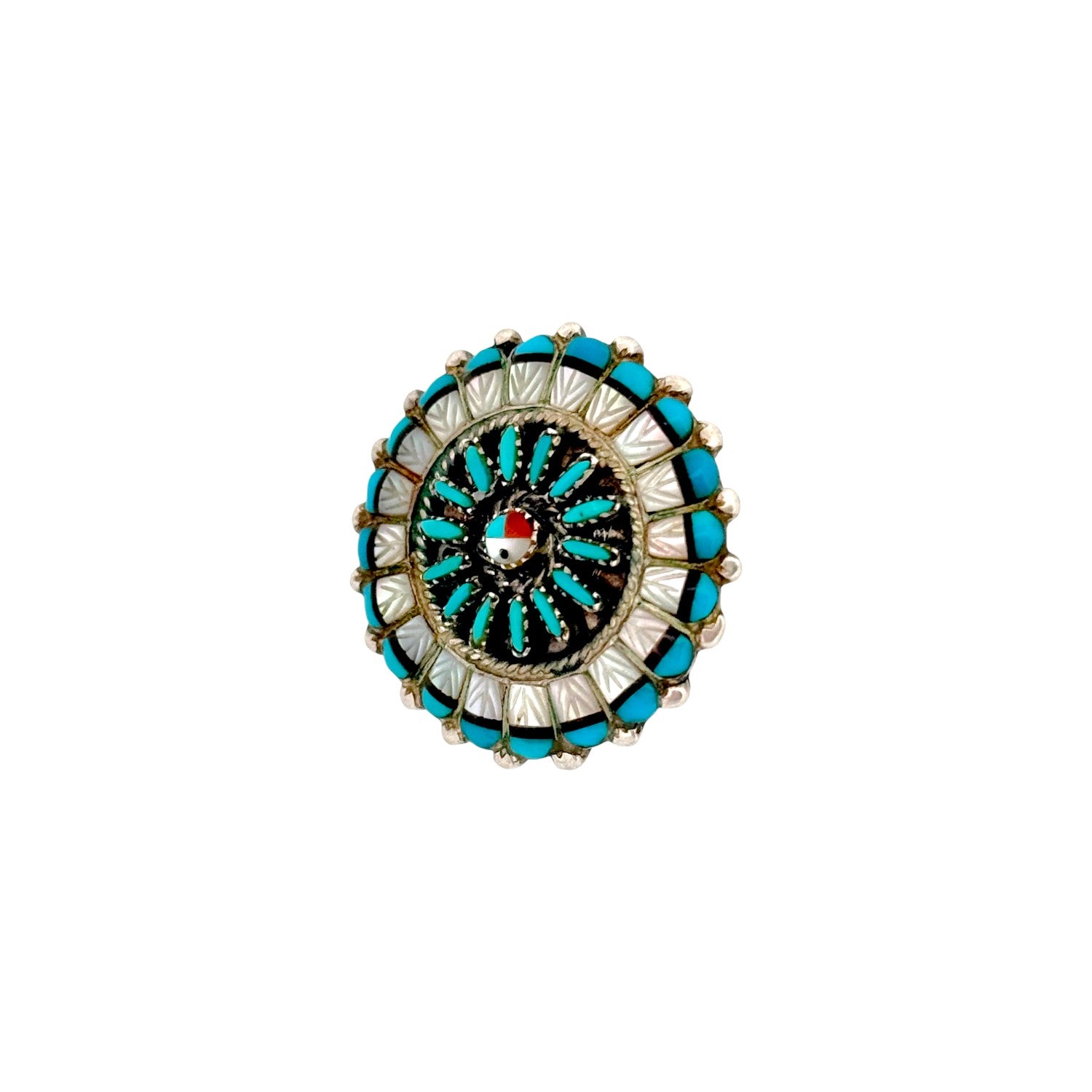 These vintage Zuni handmade earrings from the 1980s are a stunning example of traditional cluster inlay work. Crafted in sterling silver, each circular earring features a radiant sunburst design made from Sleeping Beauty turquoise, abalone shell, jet, and coral. The fine inlay work forms a vibrant mosaic, with the center showcasing the classic Zuni sun face symbol. Surrounding the sun face, alternating patterns of turquoise and abalone create a dynamic play of color and light. The use of jet and coral adds striking contrast, enhancing the intricate details of the design. With their bold circular shape and vibrant hues, these earrings embody the artistry and cultural symbolism of Zuni jewelry. Both collectible and wearable, they reflect the precision and creativity that make 1980s Zuni pieces highly sought after.