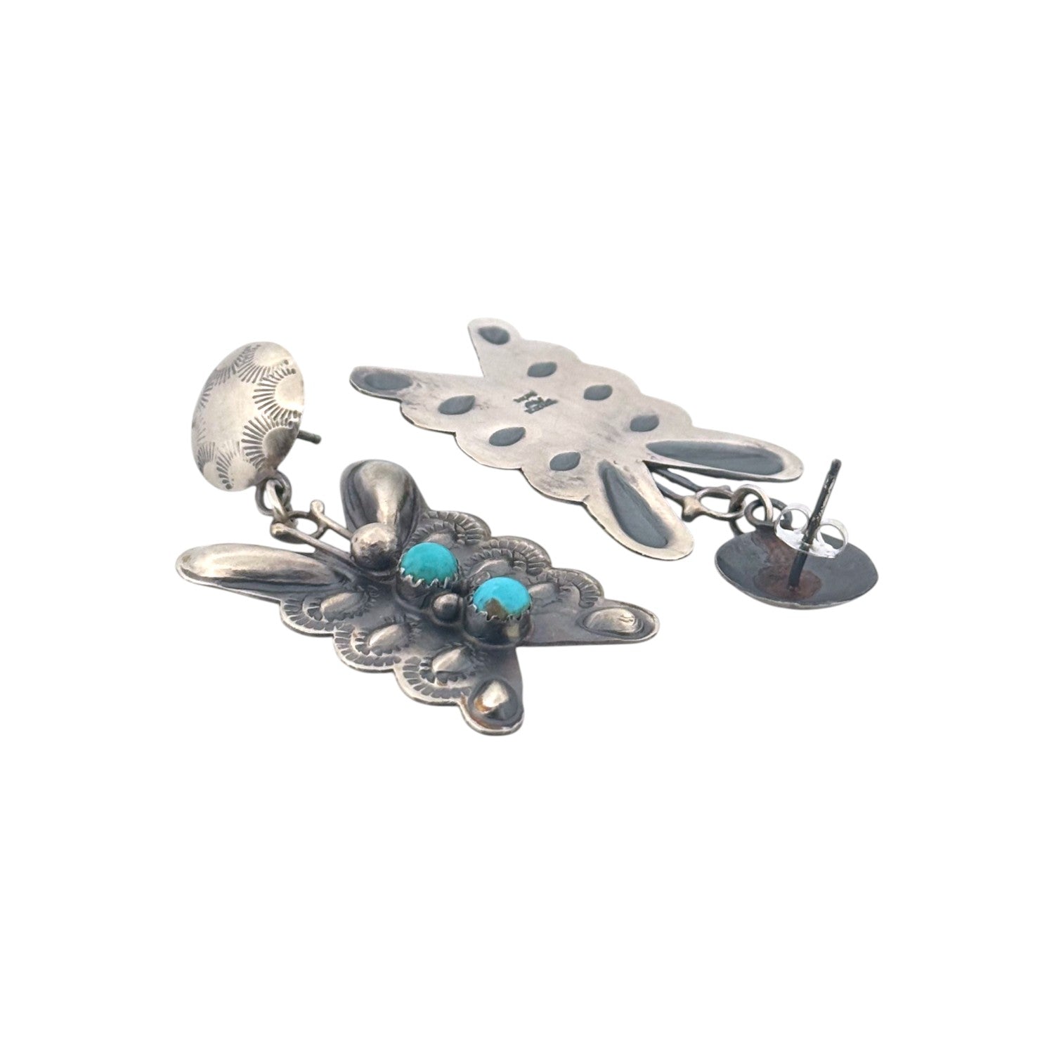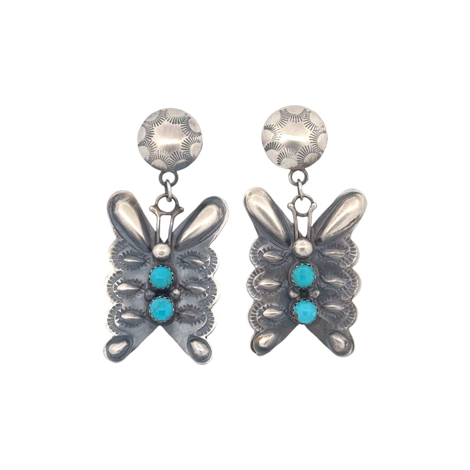 These captivating earrings by Navajo artist Tim Yazzie embody both elegance and symbolism. Handcrafted in sterling silver, the design takes the form of a butterfly, a traditional symbol of transformation, beauty, and renewal in Native culture. Intricate stamp work and silver repoussé details bring dimension and texture to the wings, enhancing their lifelike quality. Set at the center are two vibrant Kingman Turquoise stones, their rich blue tones standing out beautifully against the polished silver. The round stamped studs add balance and continuity, seamlessly connecting the design. Lightweight yet bold, these earrings make a striking statement while honoring traditional Navajo silversmithing techniques.