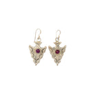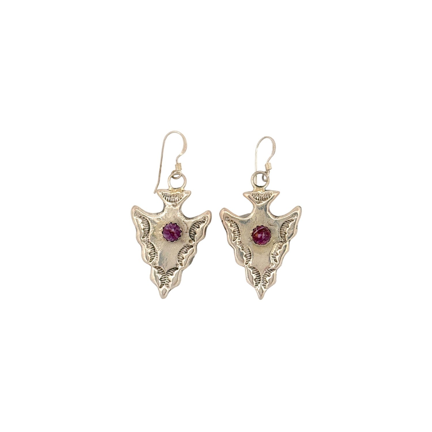 These distinctive earrings by Navajo artist Celcia Yazzie showcase rich purple spiny oyster shell, set at the center of beautifully crafted sterling silver arrowhead motifs. Each piece is hand-stamped with intricate detailing, creating depth and texture that accentuate the symbolic arrowhead shape. The vibrant purple shell adds a bold pop of color, contrasting elegantly against the warm silver finish. Lightweight and gracefully proportioned, these earrings offer both everyday wearable and meaningful artistic expression. Handmade with cultural reverence and skill, they reflect Yazzie’s talent for blending tradition with striking visual appeal.