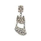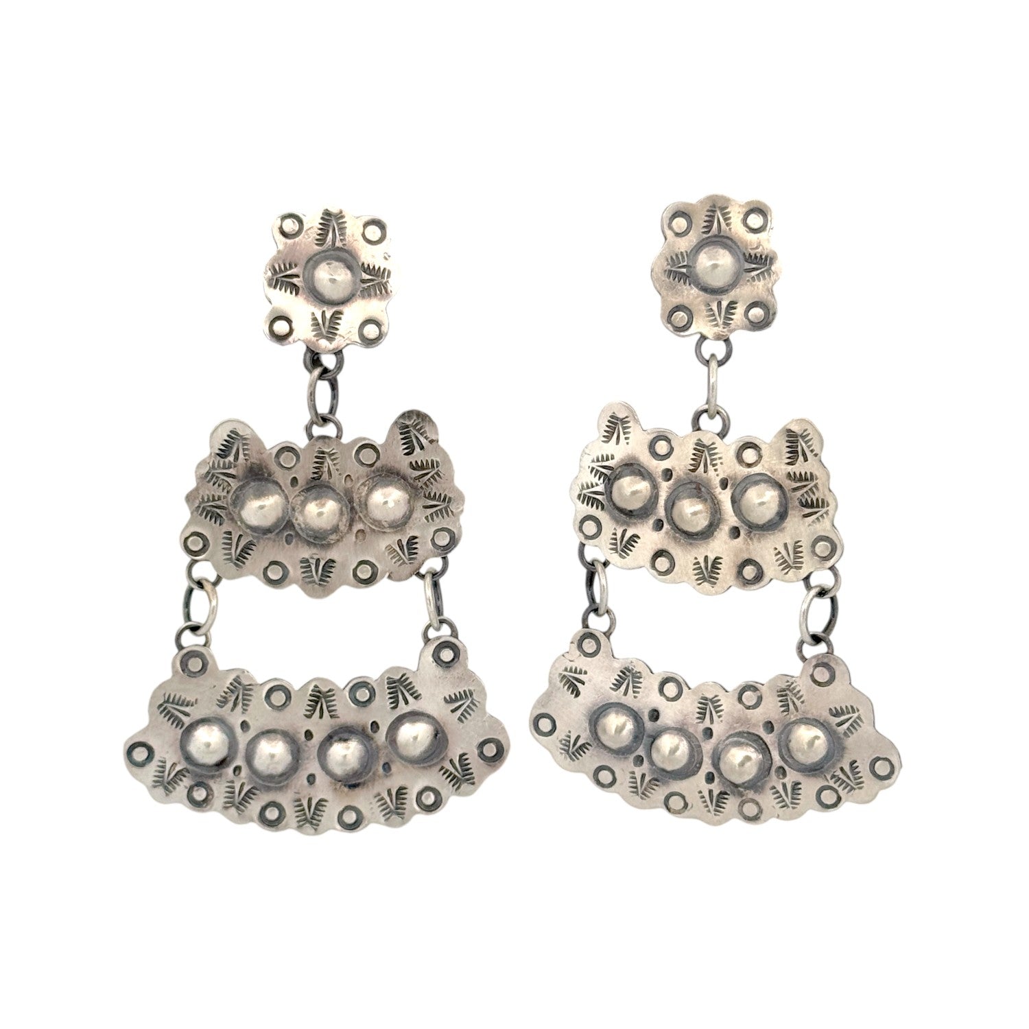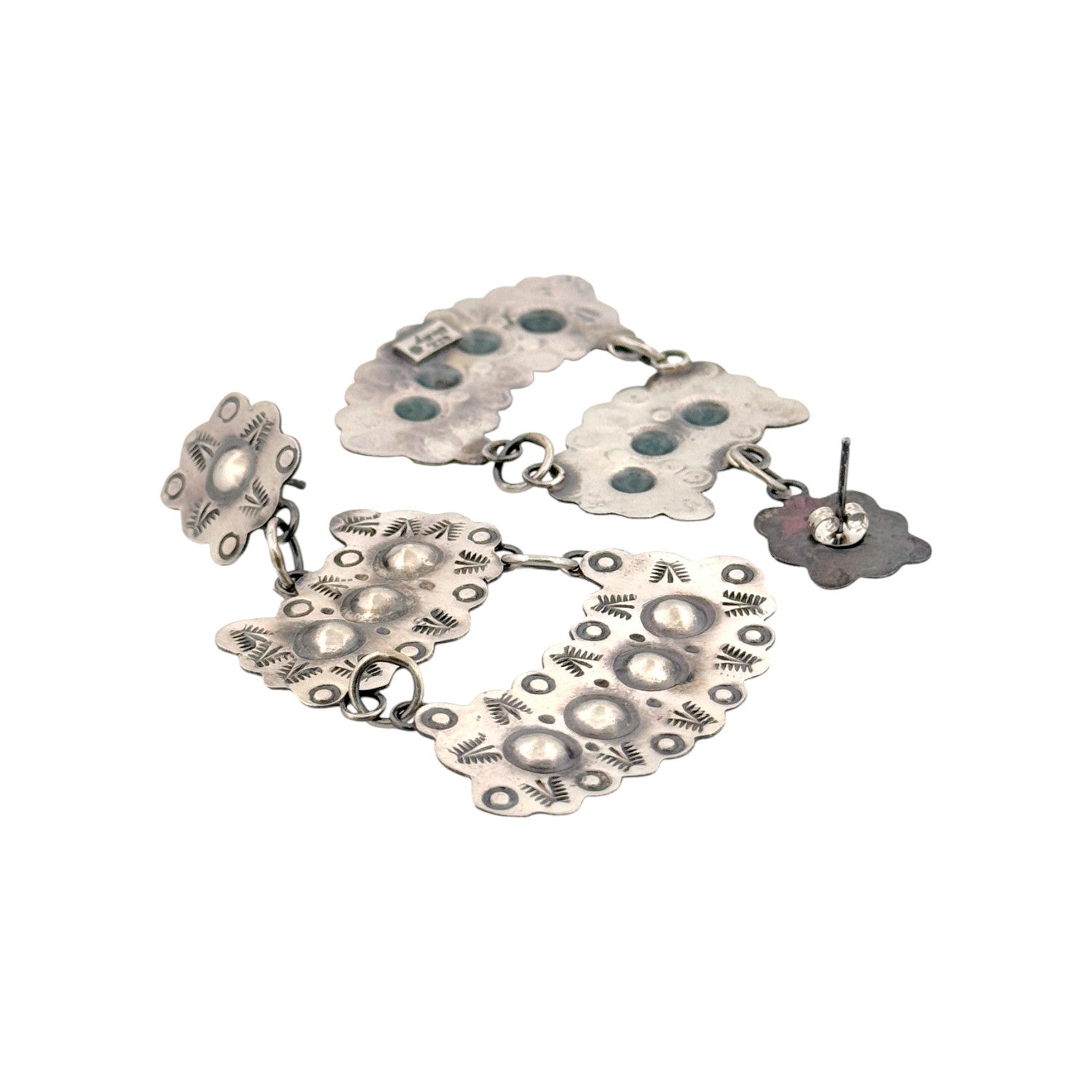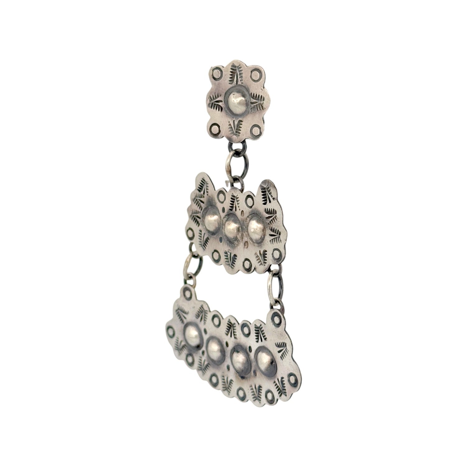 These Navajo handmade earrings by Gabrielle Yazzie highlight her refined skill in sterling silver stampwork and traditional design. Each earring features three linked panels adorned with hand-stamped patterns and raised repoussé domes, creating depth and dimension. The symmetrical motifs reflect classic Navajo symbolism, representing harmony, strength, and beauty. The oxidized background enhances every stamped detail, giving the earrings a vintage patina that emphasizes their handcrafted quality. Despite their intricate design, they remain lightweight and move gracefully when worn. Gabrielle Yazzie’s artistry shines through in the balance of traditional techniques and contemporary elegance.
