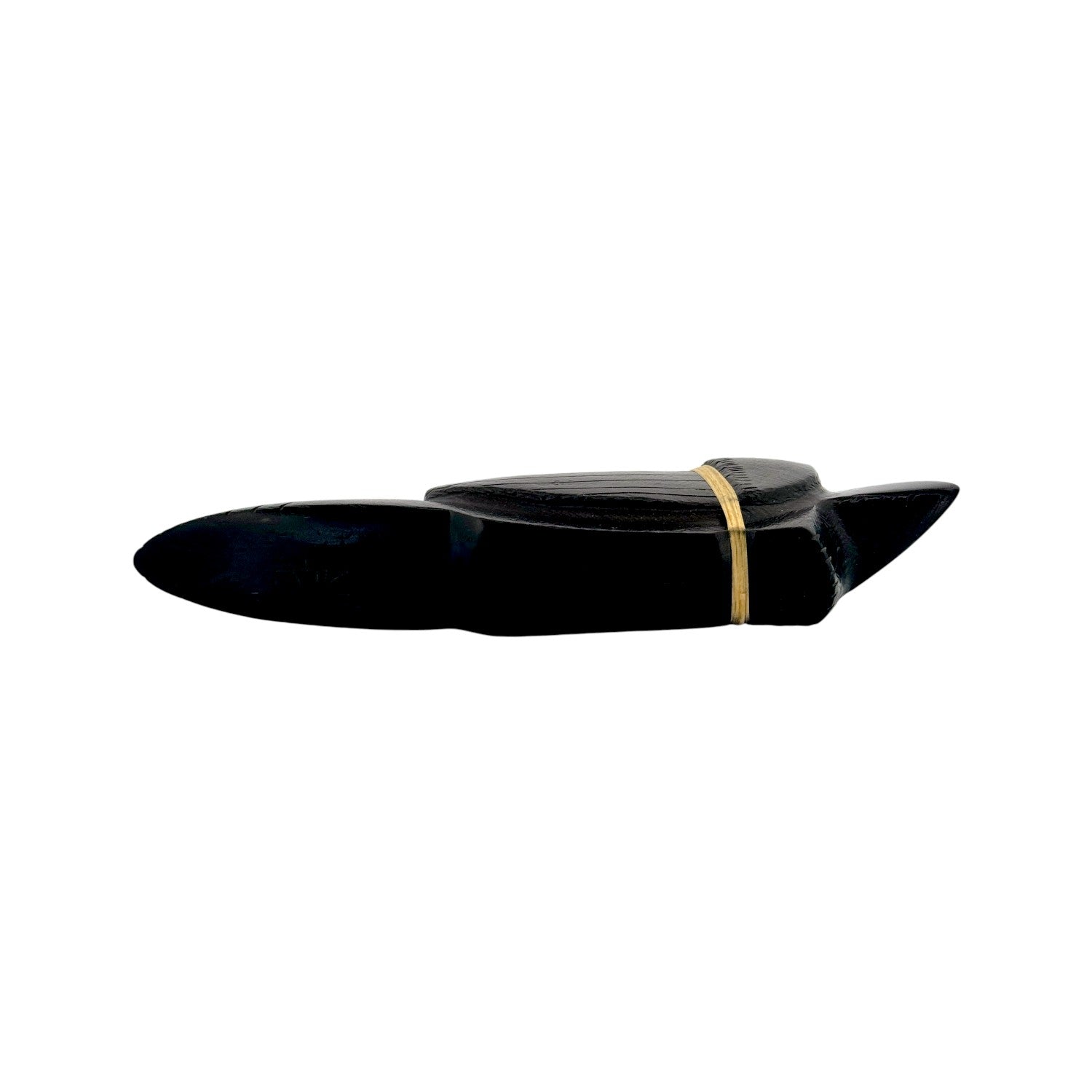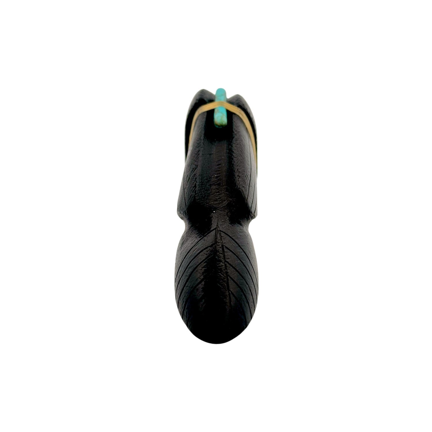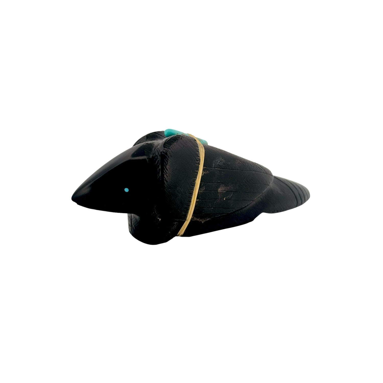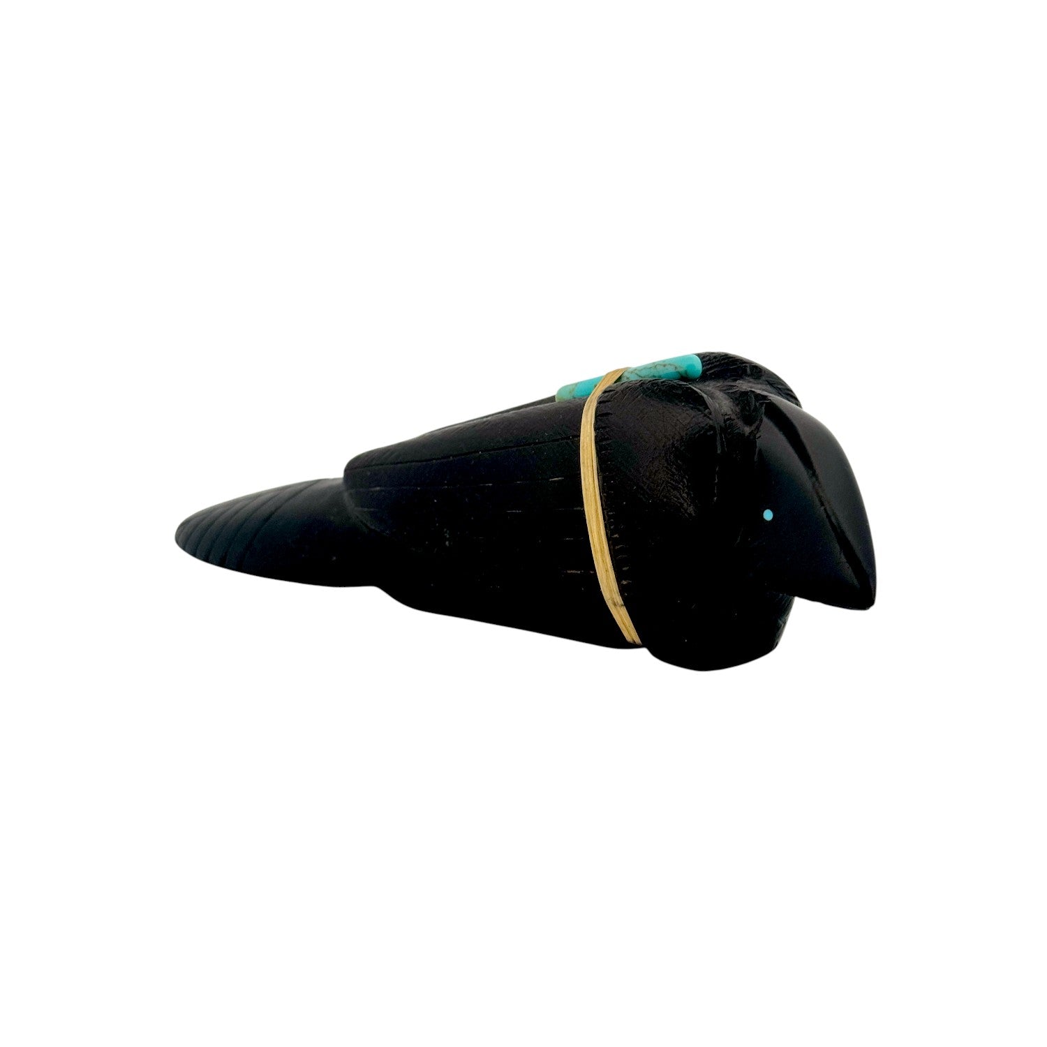 This Zuni hand-carved Raven Fetish by Herbert Halate is sculpted from lustrous black jet, creating a sleek and powerful silhouette. A traditional medicine bundle rests atop its back, featuring vibrant Sleeping Beauty and Kingman Turquoise secured with natural sinew. The bright turquoise accents provide striking contrast against the deep, polished jet surface. Symbolizing honor, protection, and a connection to the Creator, this handcrafted piece beautifully reflects enduring Zuni tradition and artistry.
