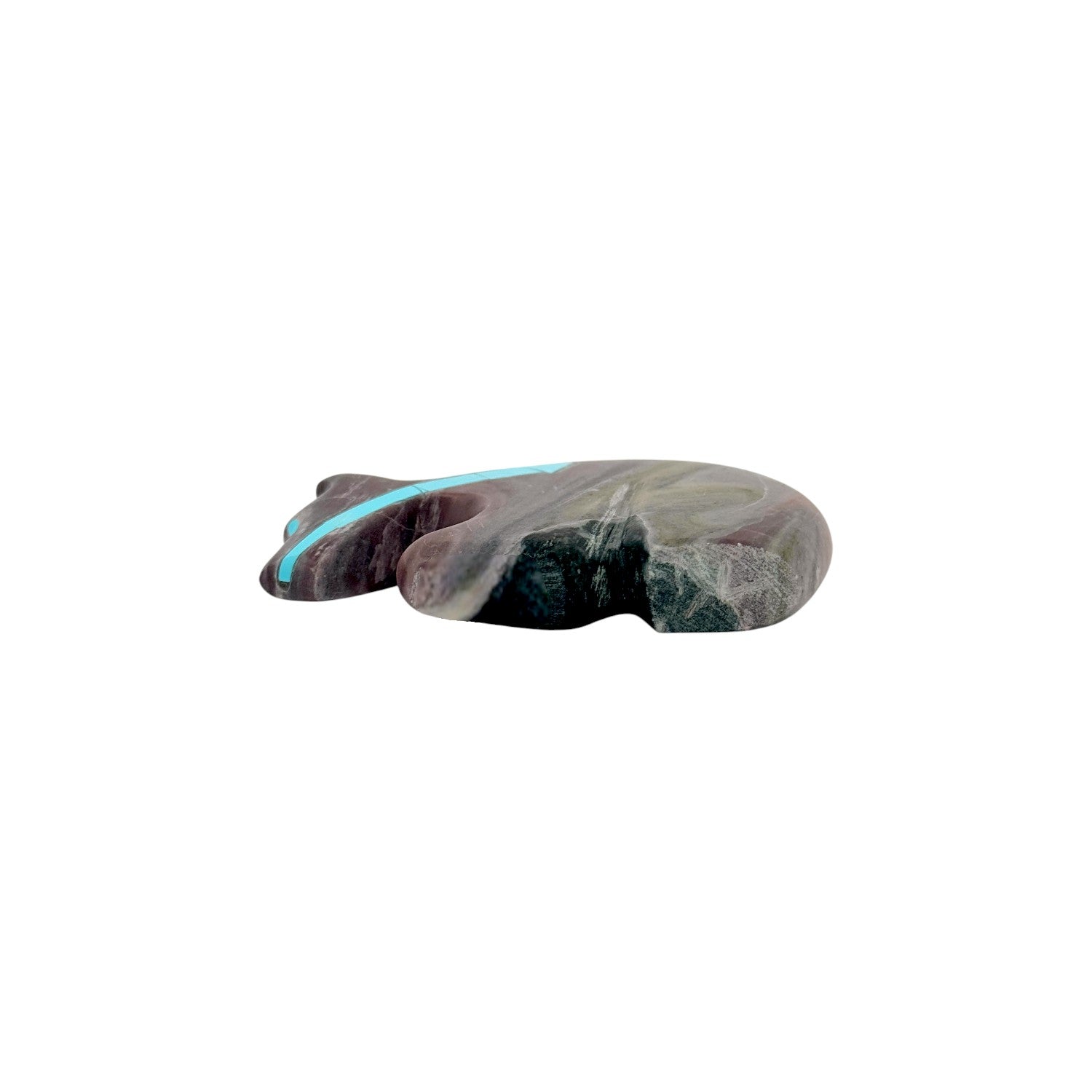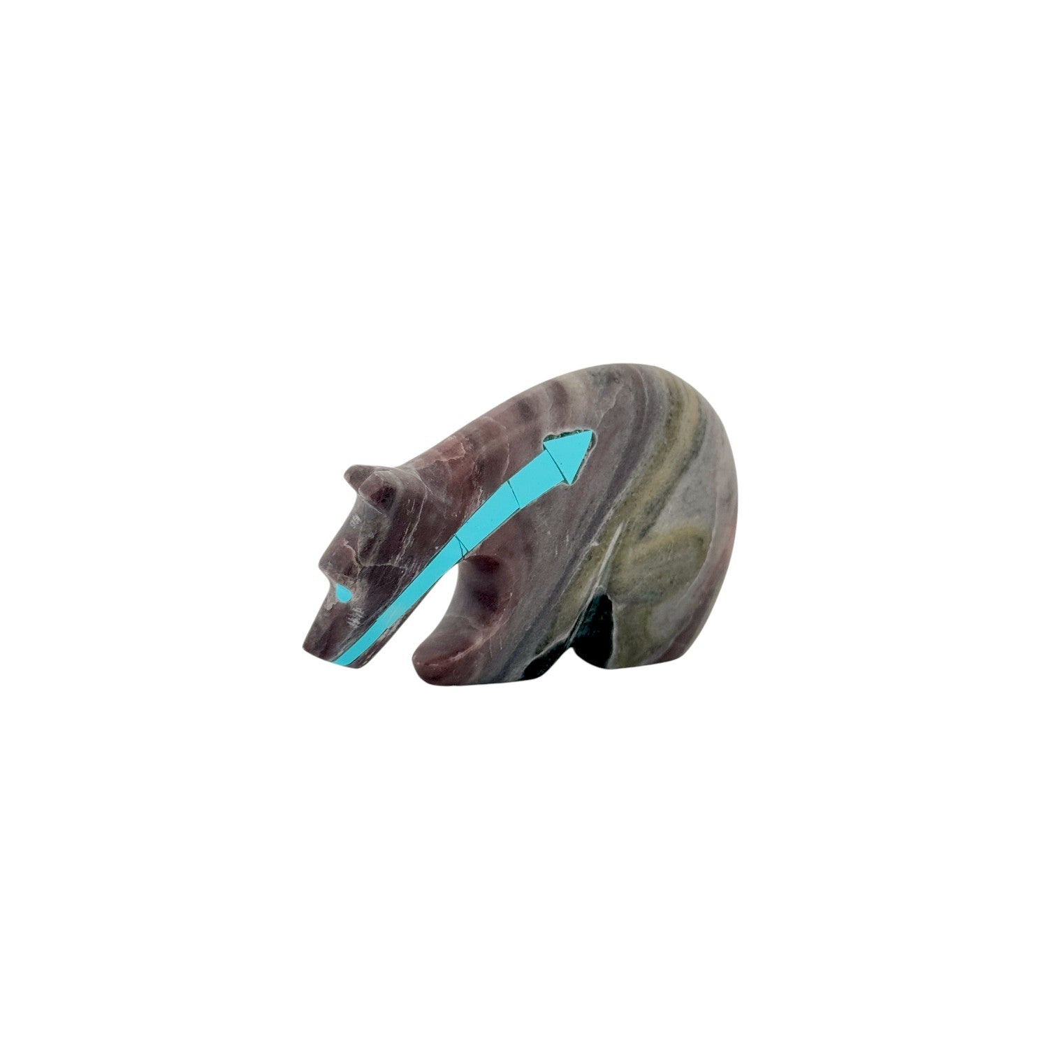 This Zuni hand-carved Bear Fetish by Donovan Laiwakete is sculpted from beautifully banded fluorite, displaying soft hues of purple, green, and smoky gray. The bear’s graceful, forward-leaning posture conveys quiet strength and purposeful movement. A bold inlay of Sleeping Beauty Turquoise forms a striking arrow motif across the body, symbolizing direction, protection, and power. The vivid turquoise contrasts brilliantly against the translucent, naturally layered fluorite. Thoughtfully polished and expertly carved, this handcrafted piece is a distinctive example of contemporary Zuni artistry rooted in tradition.