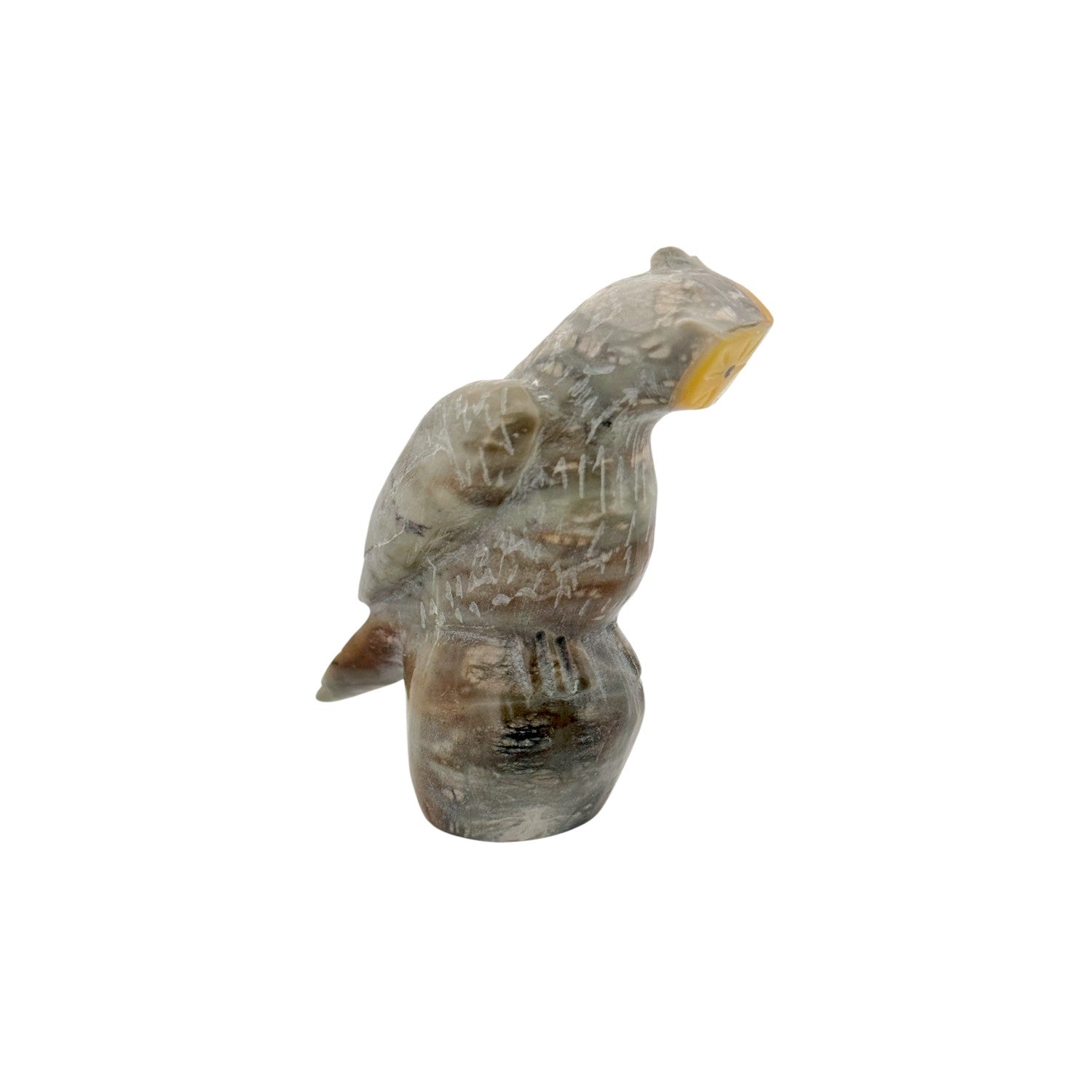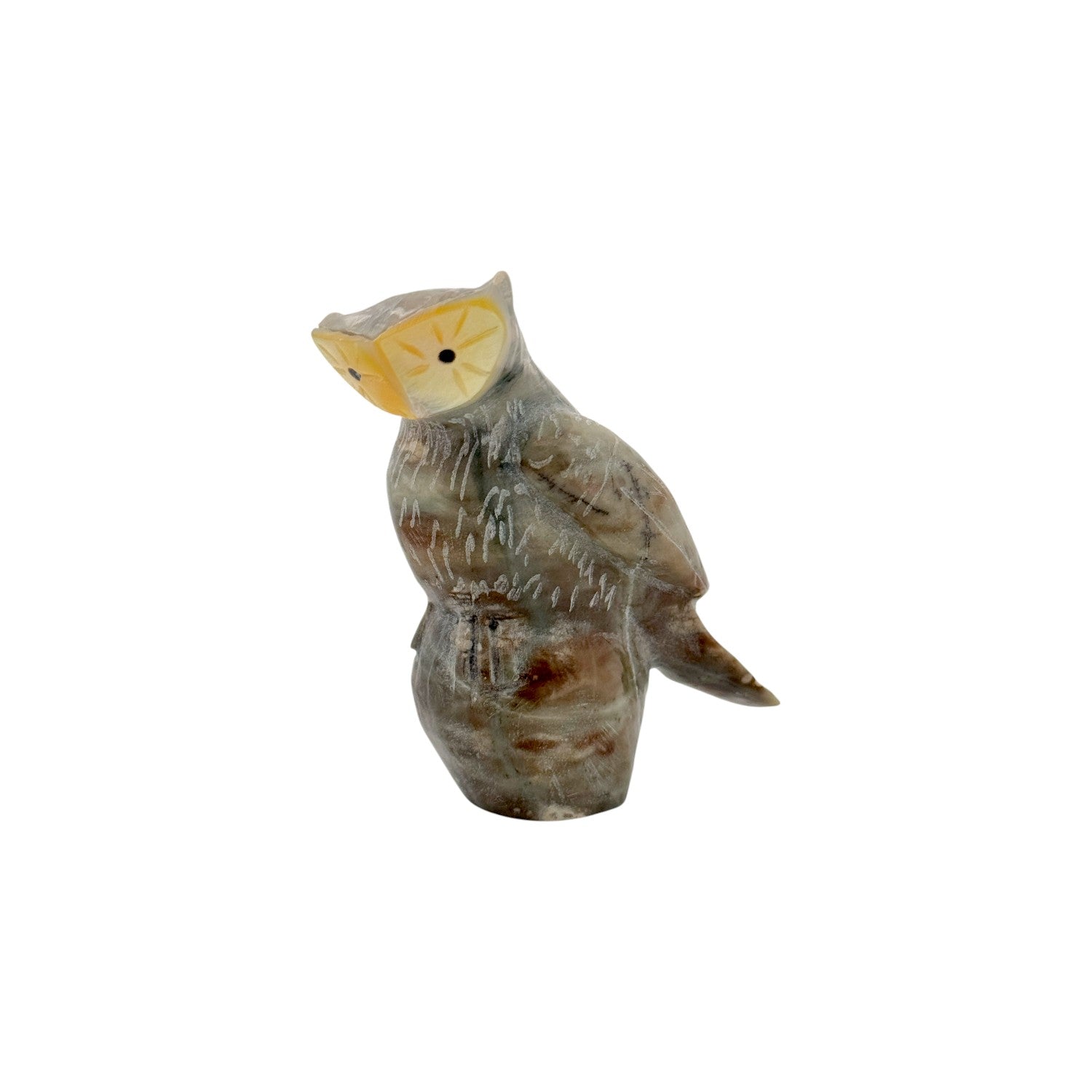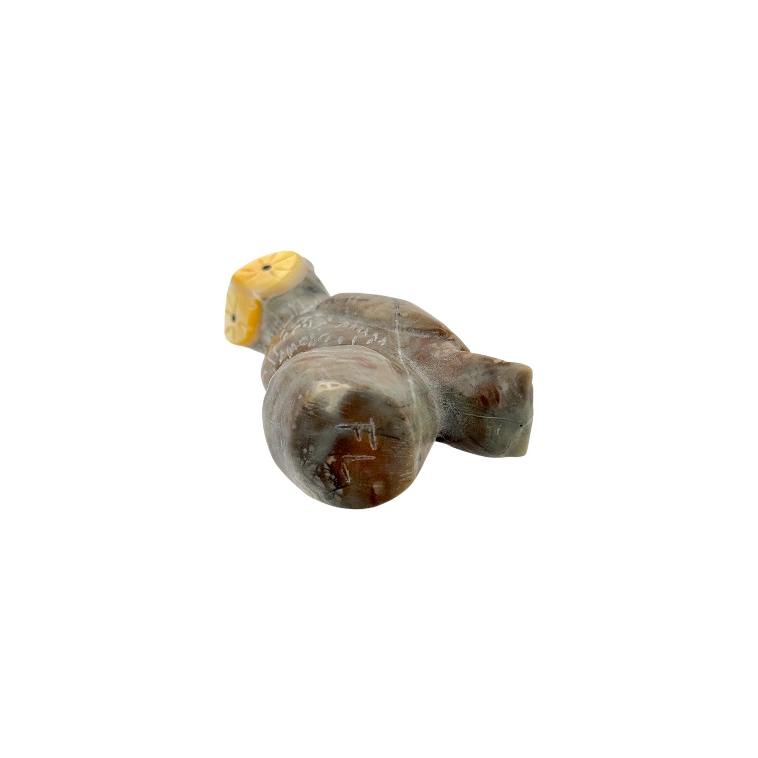 This Zuni hand-carved Owl Fetish by Freddie Leekya is sculpted from softly patterned jasper, featuring natural earthy tones and subtle veining throughout the stone. The owl’s upright posture and rounded form convey quiet wisdom and watchful presence. A beautifully carved yellow shell face forms a striking focal point, with incised detailing that radiates outward like stylized feathers. The warm shell contrasts elegantly against the muted jasper body, enhancing the piece’s visual depth. Symbolizing intuition, protection, and insight, this handcrafted fetish reflects Freddie Leekya’s refined artistry and the enduring tradition of Zuni carving.