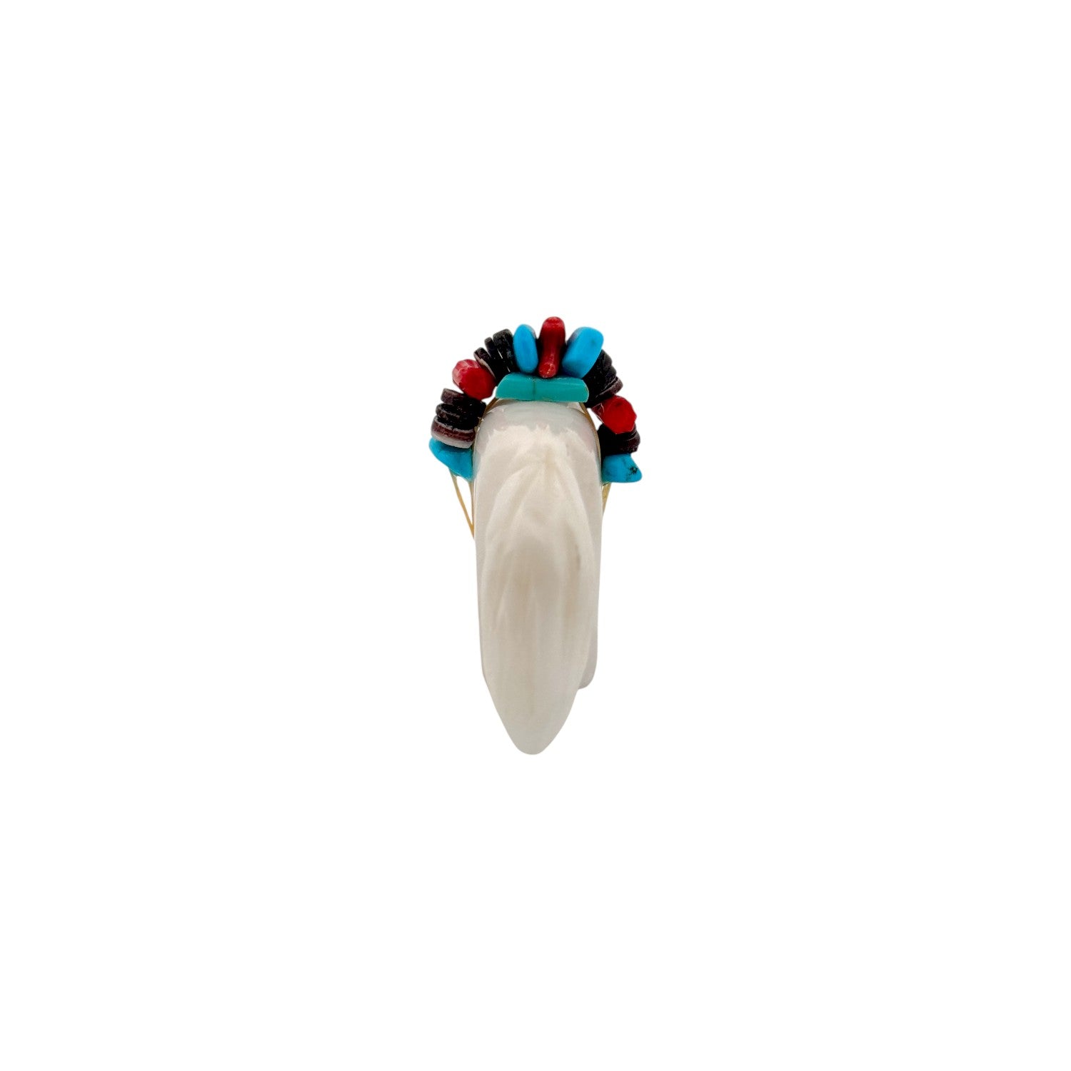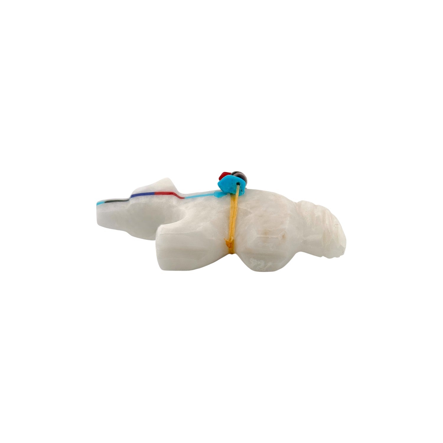 This Zuni hand-carved Bear Fetish by Reynold Lunasee is sculpted from luminous white marble, giving the piece a clean and elegant presence. The bear’s smooth, rounded form is enhanced by inlaid accents of Sleeping Beauty Turquoise and Kingman Turquoise, creating vibrant blue highlights that contrast beautifully with the pale stone. A traditional bundle rests atop the bear’s back, detailed with coral and turquoise elements that add dimension and symbolic meaning. The polished surface showcases Lunasee’s refined craftsmanship and careful attention to proportion and balance. Representing strength, protection, and healing, this striking bear is a timeless expression of Zuni carving tradition.