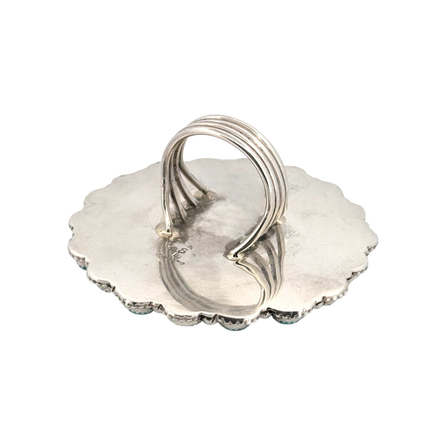 This striking Navajo handmade ring by renowned silversmith Sheila Becenti beautifully combines the vibrant spirit of the Southwest with timeless elegance. Expertly crafted in sterling silver, it features a bold center stone of deep orange spiny oyster, encircled by a radiant halo of natural turquoise, cabochons each hand set with precision and care. The contrast of spiny oyster and cool turquoise evokes the desert sunrise over Navajo lands, a hallmark of Becenti’s refined artistry. Intricate silver beading and meticulous detailing reflect generations of Navajo silversmithing tradition, blending heritage and contemporary sophistication. A true statement piece of authentic Native American jewelry, this ring embodies both cultural legacy and collector’s value.