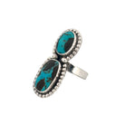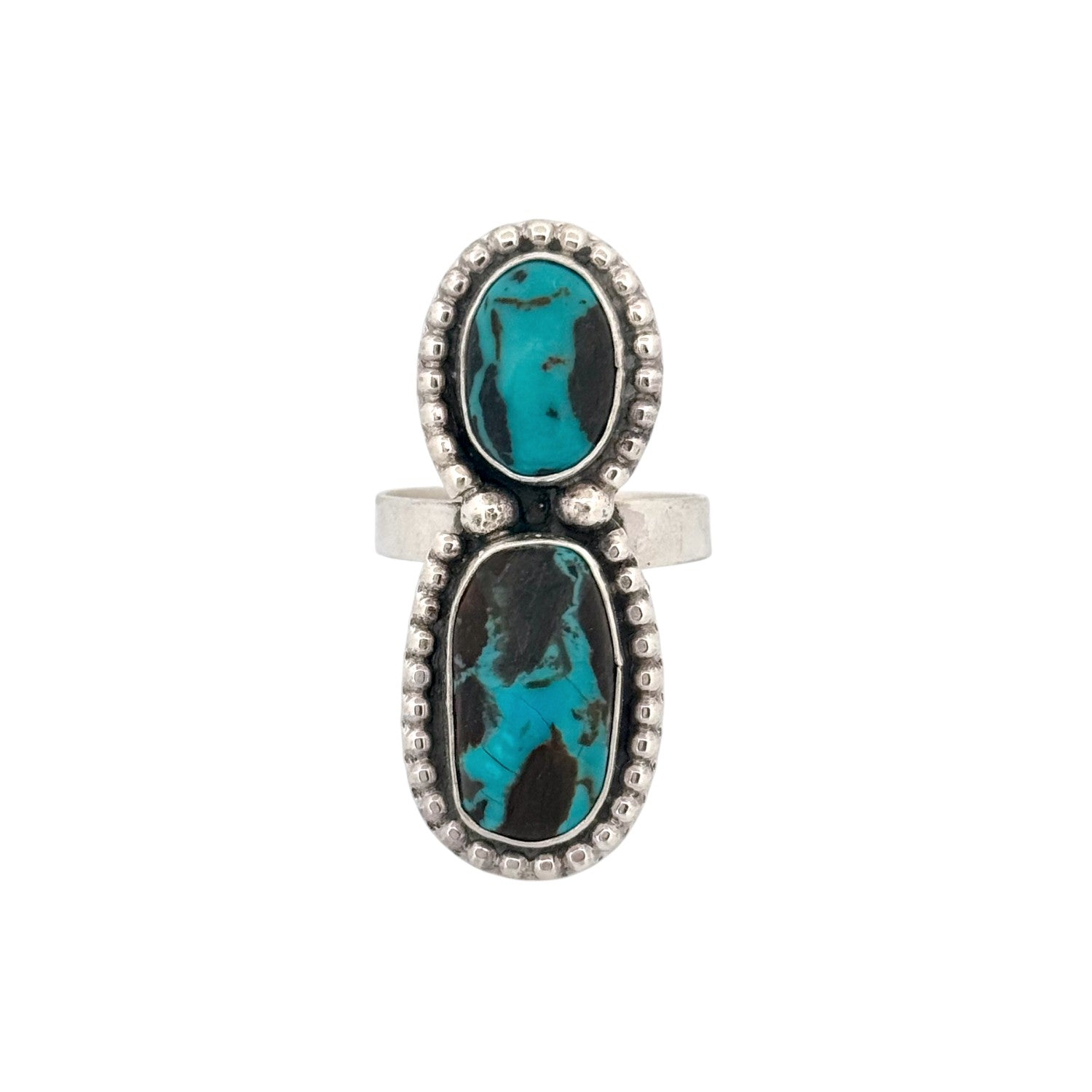 Handcrafted by master Navajo silversmith Sheila Becenti, this Indian Mountain Turquoise ring is a stunning reflection of traditional craftsmanship and timeless Southwest beauty. The ring features two rich Indian Mountain Turquoise cabochons, each showcasing a striking mix of sky-blue tones and deep matrix patterns unique to this rare and highly prized stone. Set in finely polished sterling silver, the stones are framed with elegant silver beadwork that enhances their natural vibrancy and depth. Becenti’s artistry shines through in her balanced design and impeccable attention to detail hallmarks of true Navajo silversmithing excellence. The bold yet graceful vertical layout offers sophistication and versatility, perfect for collectors of authentic Native American jewelry.