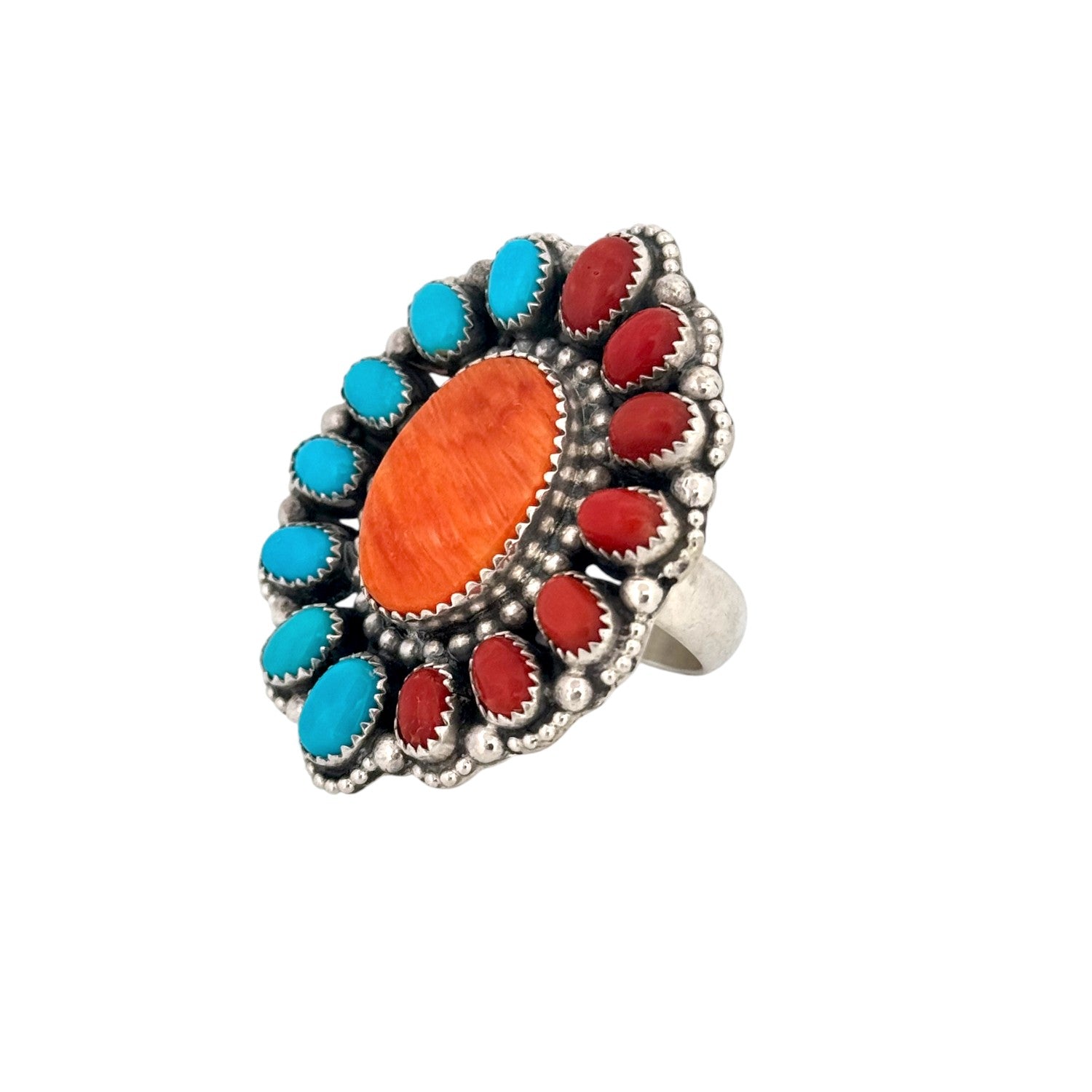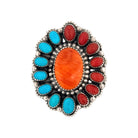 Handcrafted by celebrated Navajo artist Sheila Becenti, this adjustable multi-stone ring is a breathtaking fusion of artistry, heritage, and Southwest elegance. The design features a luminous spiny oyster centerpiece, surrounded by alternating turquoise and coral cabochons, each expertly bezel set in polished sterling silver. Every stone is hand selected for its rich color and character, reflecting Becenti’s deep reverence for the natural materials and traditions of her Navajo heritage. The intricate silverwork and balanced symmetry embody generations of silversmithing mastery, a hallmark of authentic Native American jewelry. Its adjustable band ensures a perfect fit, combining timeless craftsmanship with modern comfort.