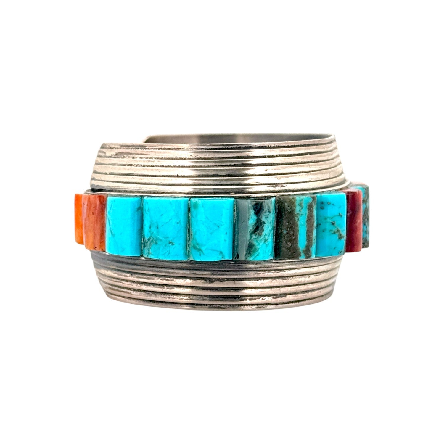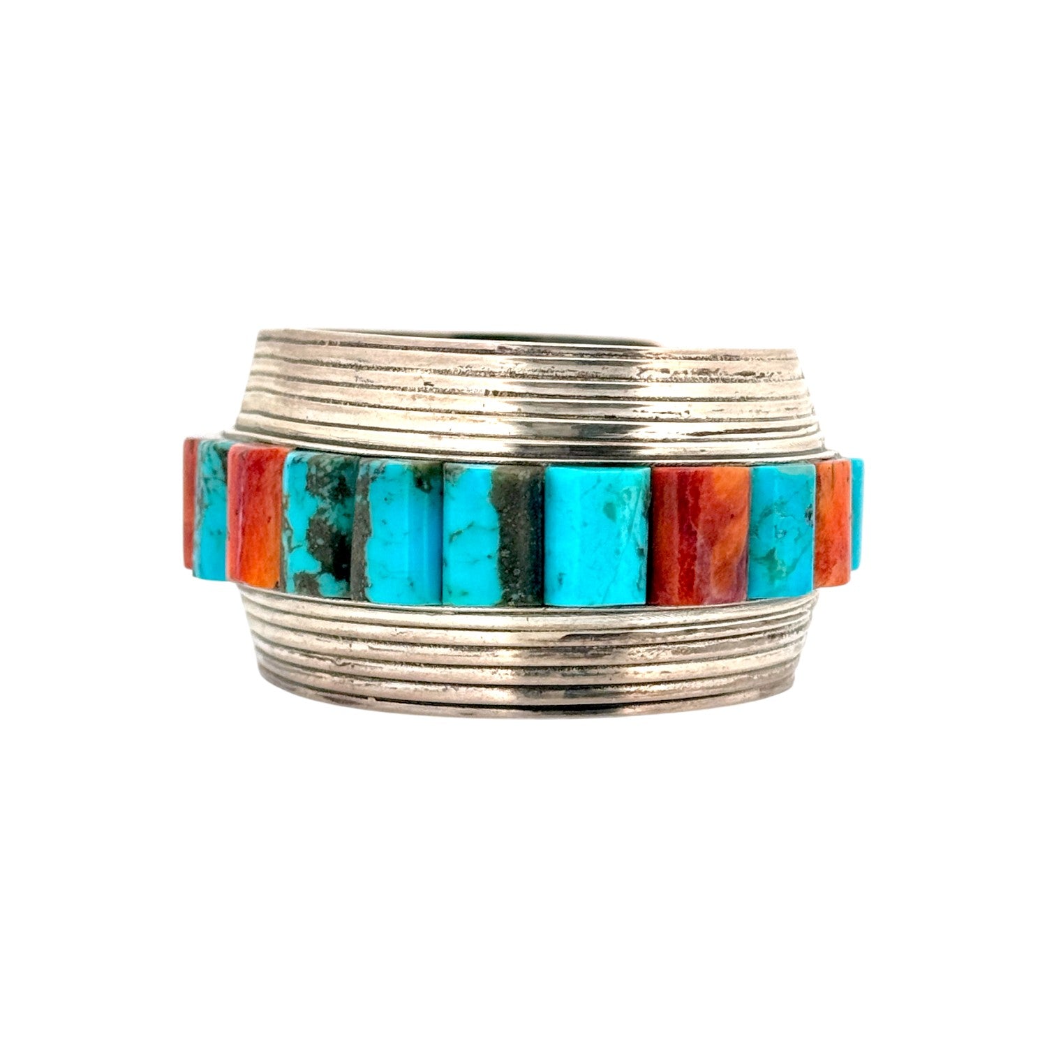 This vintage Navajo handmade bracelet by Melvin Francis exemplifies a refined balance of traditional artistry and modern Southwestern style. Made from sterling silver, the cuff features a striking multi-stone inlay design with alternating panels of vivid Kingman turquoise and fiery spiny oyster shell. The inlay is design by Lester James meticulously hand-cut and fitted, showcasing the artist’s precision and eye for harmony in color and texture. Each stone displays natural matrix patterns, making this piece truly one-of-a-kind. The bracelet’s ribbed silverwork adds a sophisticated structural element, enhancing its bold and contemporary aesthetic, elegant and substantial, it embodies the craftsmanship and heritage of both Melvin and Lester silversmithing.