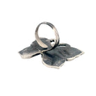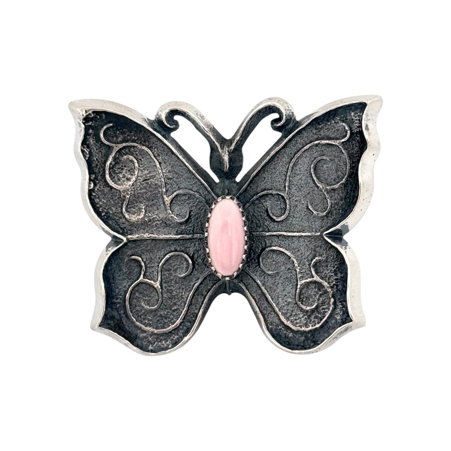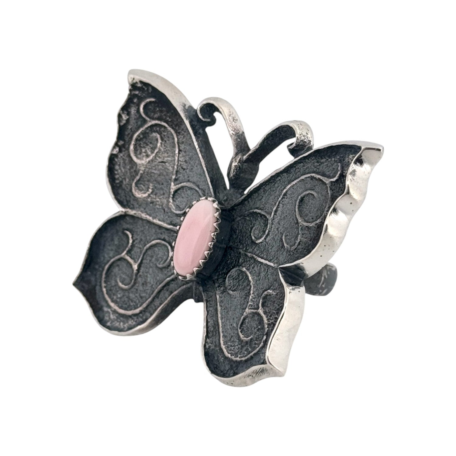 Handcrafted by talented Navajo silversmith Mekechto Jim, this adjustable sterling silver butterfly ring captures both elegance and symbolic meaning. Centered with a soft pink conch shell cabochon, the piece radiates gentle warmth and feminine grace, framed by hand tooled silverwork that forms the wings of a butterfly an enduring Navajo symbol of transformation and beauty. The contrast of the polished stone against the oxidized silver background highlights the intricate scrollwork and masterful texture throughout. Every curve and detail speaks to Jim’s artistry and deep connection to Navajo silversmithing traditions. Designed with an adjustable band, it offers comfort and versatility while maintaining its bold, heirloom presence.