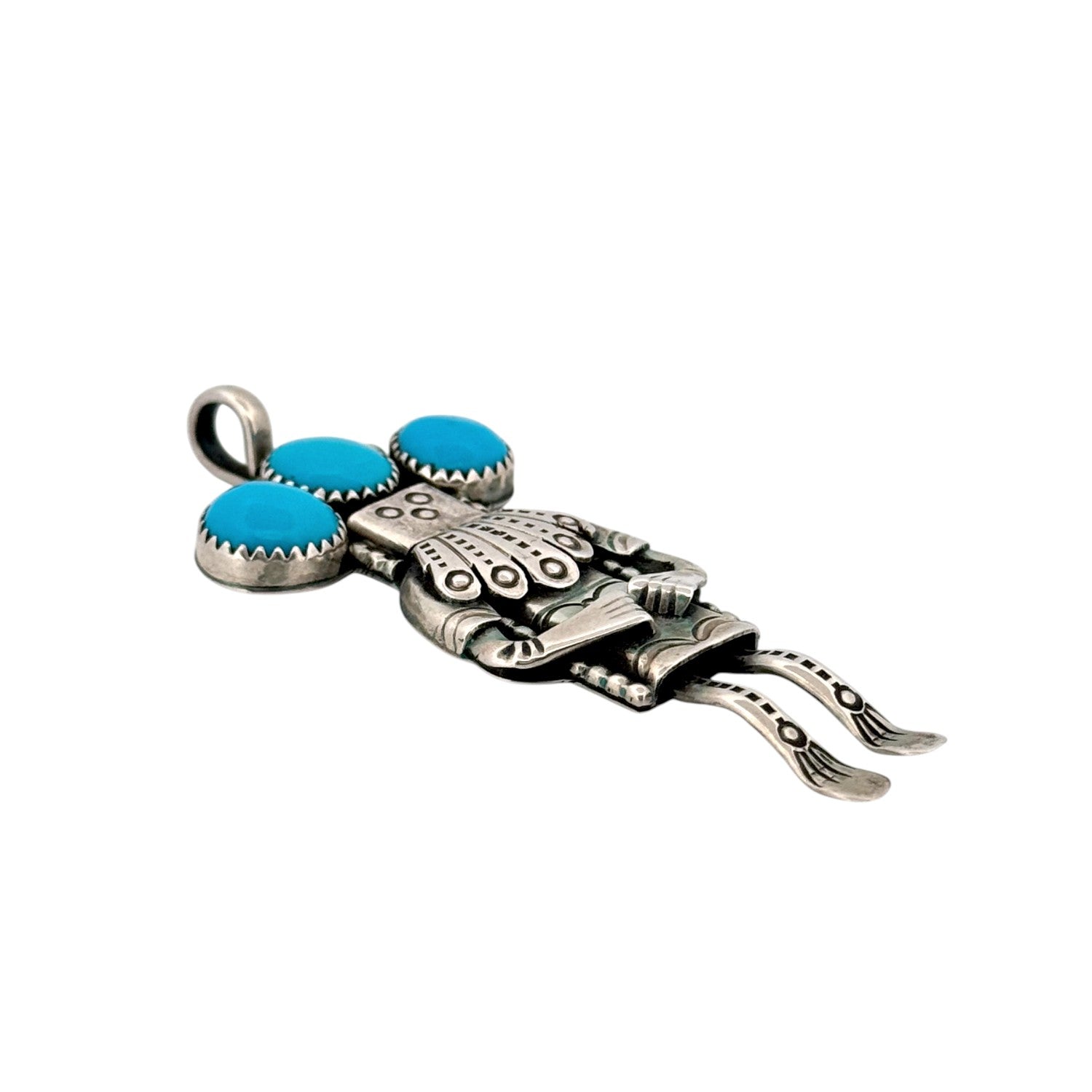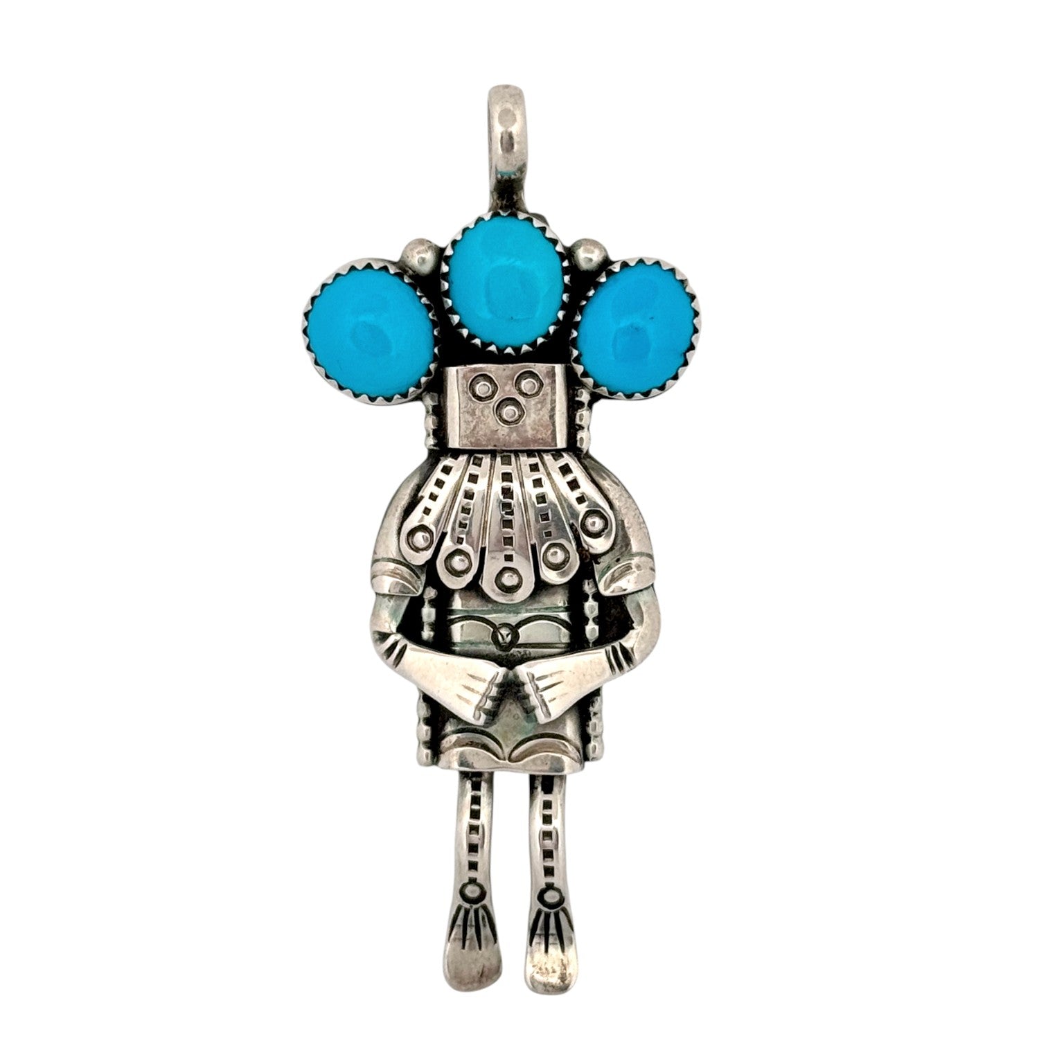 Handcrafted by celebrated Navajo silversmiths Richard and Rita Begay, this sterling silver pendant is a stunning tribute to tradition, craftsmanship, and cultural storytelling. The intricate figure design showcases masterful silverwork, accented with three luminous Sleeping Beauty Turquoise cabochons, prized for their flawless sky-blue hue and pure, matrix-free beauty. Every detail hand stamped patterns, delicate textures, and precise shaping reflects the Begays’ dedication to preserving the artistry and symbolism of Navajo silversmithing. The combination of polished turquoise and oxidized silver creates a captivating contrast, bringing the piece to life with both depth and brilliance. Designed with timeless elegance, it serves as a statement of heritage, spirituality, and refined style.