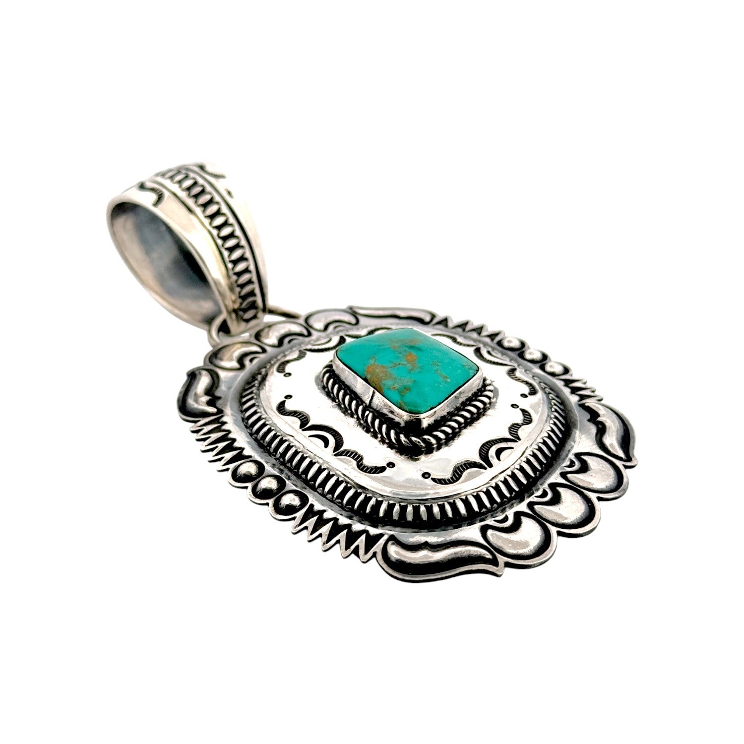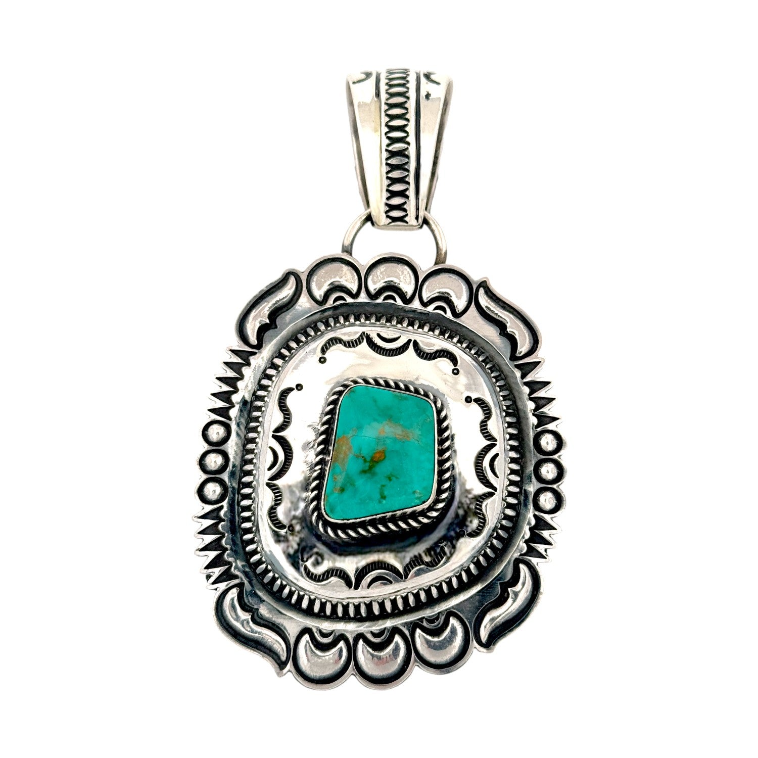 This beautiful pendant by Navajo artist Roland Dixon showcases a vibrant Kingman turquoise stone, celebrated for its brilliant blue color and natural matrix patterns. The stone is set in finely crafted sterling silver, surrounded by Dixon’s signature hand-stamped details that reflect the precision and artistry of traditional Navajo silversmithing. Each mark and curve of the silverwork complements the natural beauty of the turquoise, creating a perfect harmony between metal and stone. The design carries a timeless elegance, blending cultural heritage with a contemporary touch. A bold, polished bale adds balance and functionality, making it ideal for pairing with both chains and traditional beads.