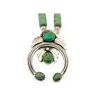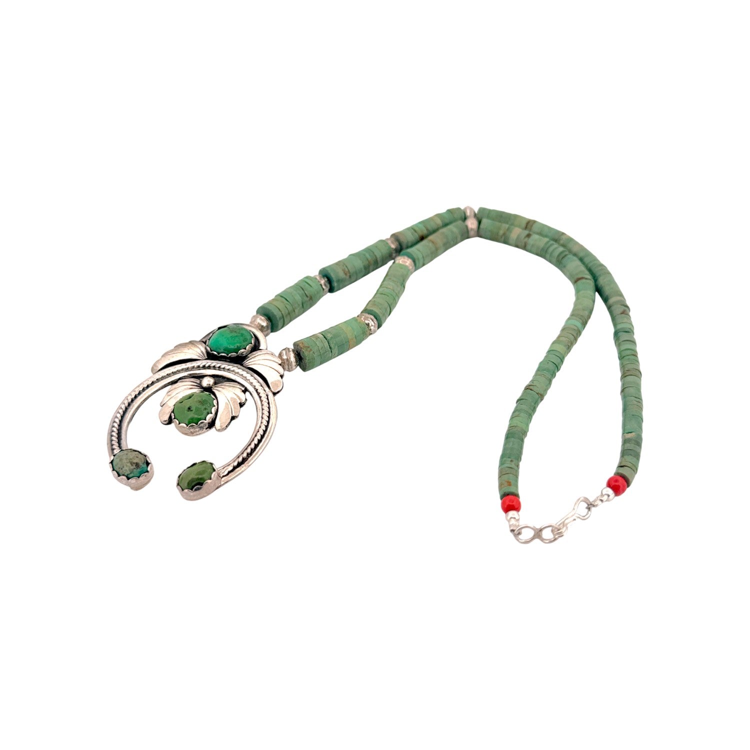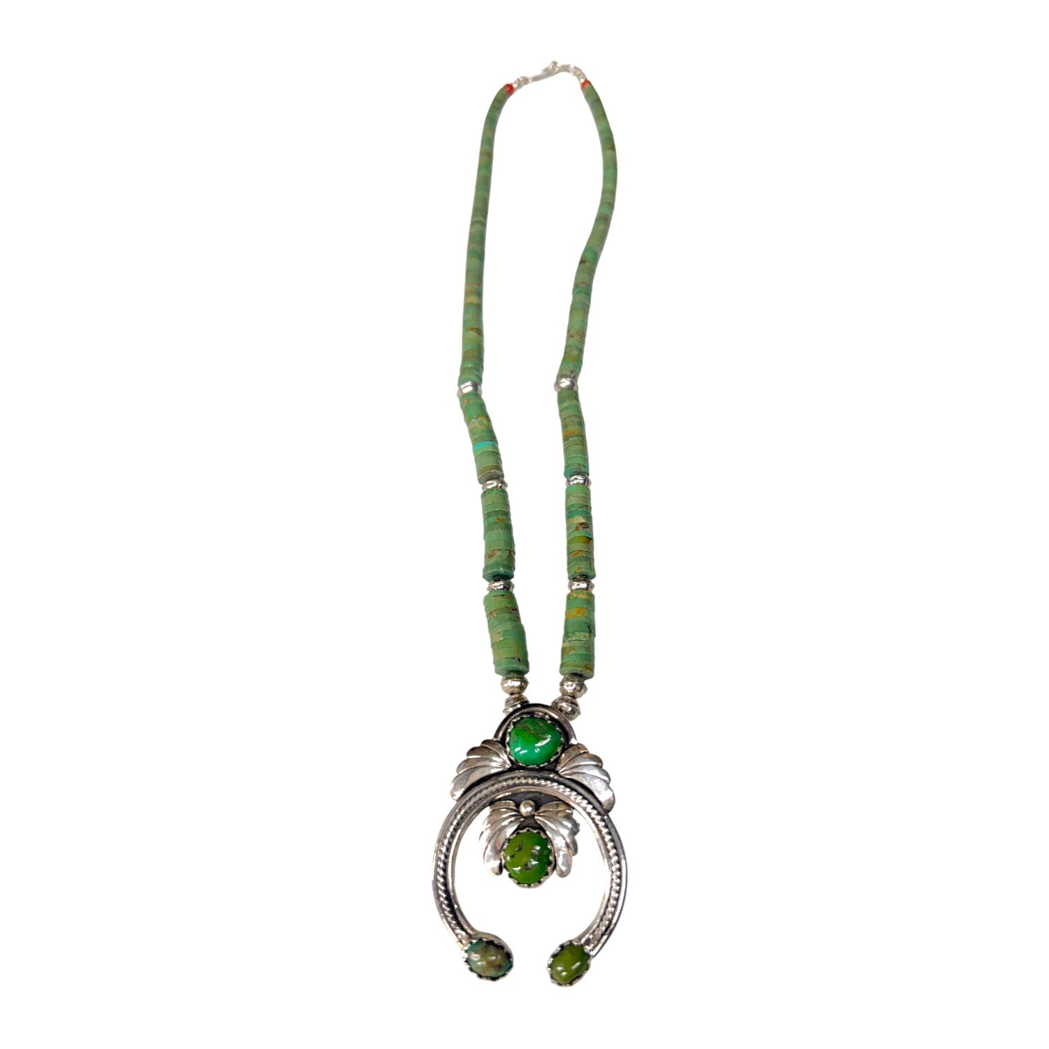 This vintage Navajo handmade necklace, hallmarked LP and crafted circa the early 2000s, is a stunning example of Southwestern artistry. The centerpiece features a sterling silver naja pendant adorned with richly hued Damele turquoise cabochons, known for their distinctive green tones and intricate matrix patterns. The turquoise is beautifully complemented by strands of matching heishi beads, accented with touches of spiny oyster shell for a warm contrast of color. Each silver element is meticulously hand-stamped and shaped, showcasing the maker’s skill and attention to detail. The necklace blends traditional Navajo symbolism with timeless elegance, celebrating the natural beauty of the materials.