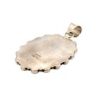 This elegant pendant by Navajo artist Geraldine James beautifully combines the serene hues of Sleeping Beauty turquoise with the earthy depth of natural agate. The large oval agate stone takes center stage, showcasing unique patterns of cream, brown, and black that resemble desert landscapes or stormy skies. Surrounding the centerpiece are meticulously set Sleeping Beauty turquoise cabochons, each radiating a vivid sky-blue brilliance that enhances the pendant’s refined symmetry. Crafted in sterling silver, the piece features fine bezels and subtle hand-stamped detailing that reflect James’s signature Navajo artistry. The contrast between the cool turquoise and the warm, grounding agate creates a captivating balance of color and texture.