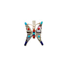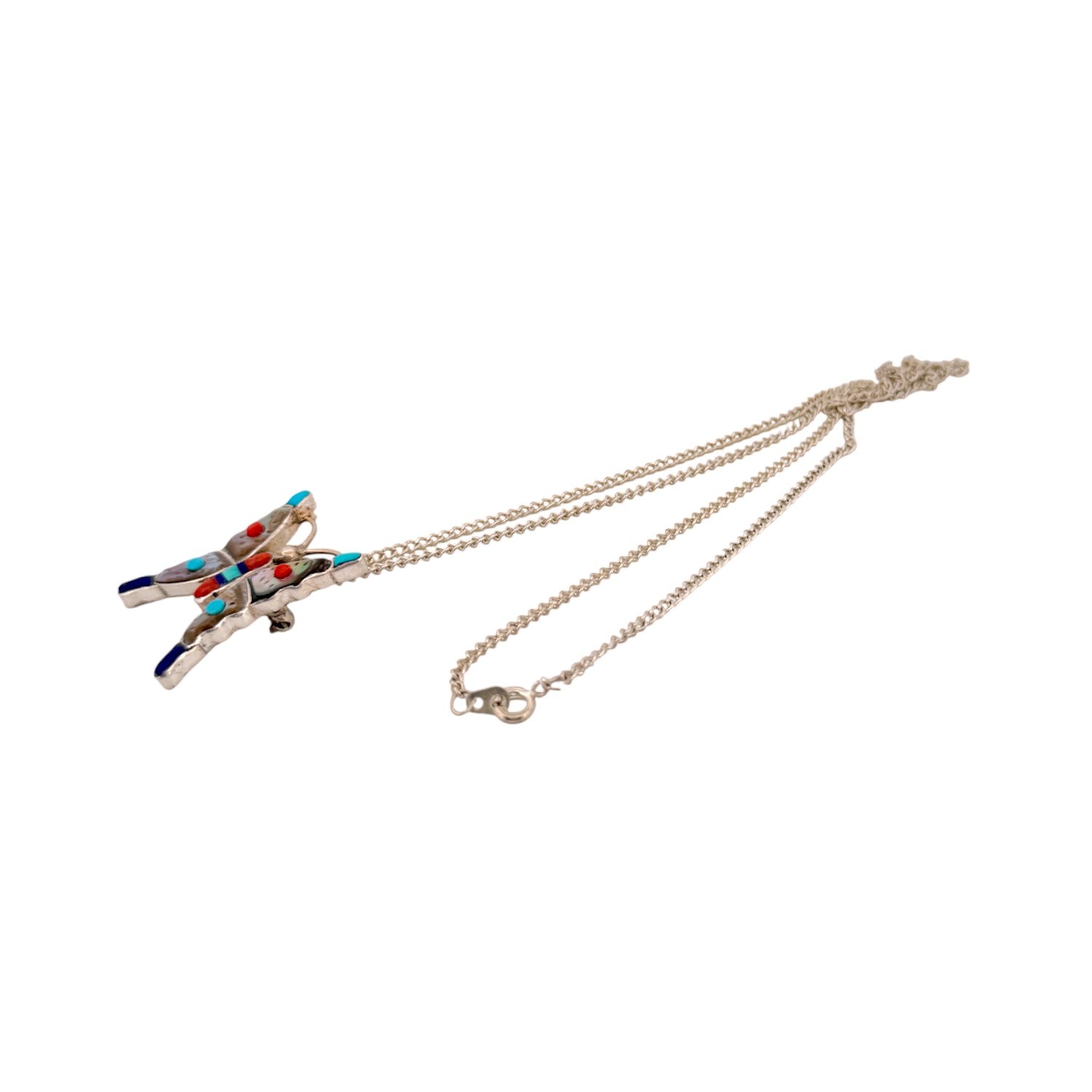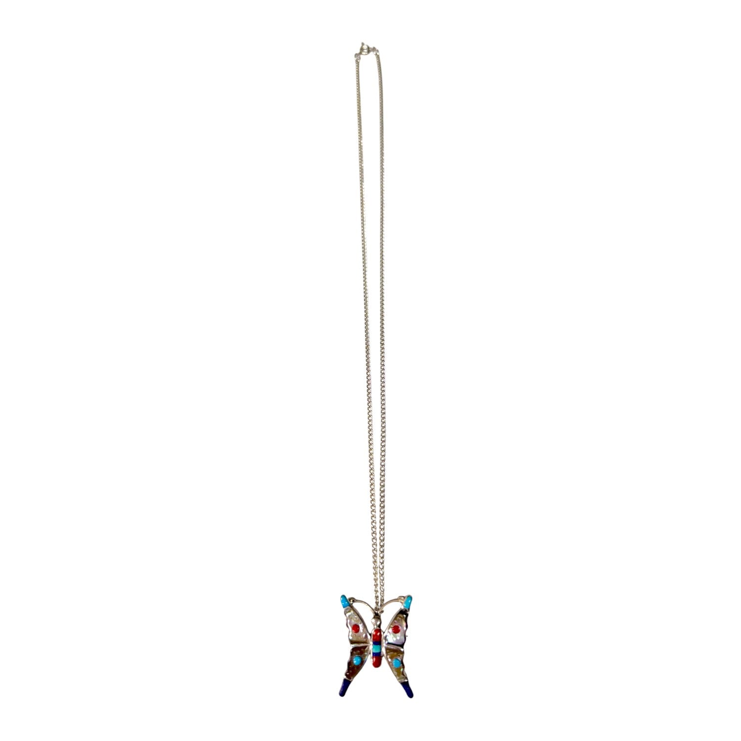 This enchanting necklace by Pitkin Natewa features a beautifully detailed butterfly pendant crafted in sterling silver. Handcrafted by a Zuni artist, the piece showcases intricate inlay work using abalone shell, Sleeping Beauty turquoise, coral, lapis lazuli, and spiny oyster shell. The vibrant stones and shells are precisely set, creating a striking balance of color and movement. Designed as both a necklace and pin, the butterfly motif adds versatility and symbolic elegance. This piece is a fine example of Zuni artistry, celebrated for its precision, storytelling, and rich cultural heritage.