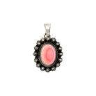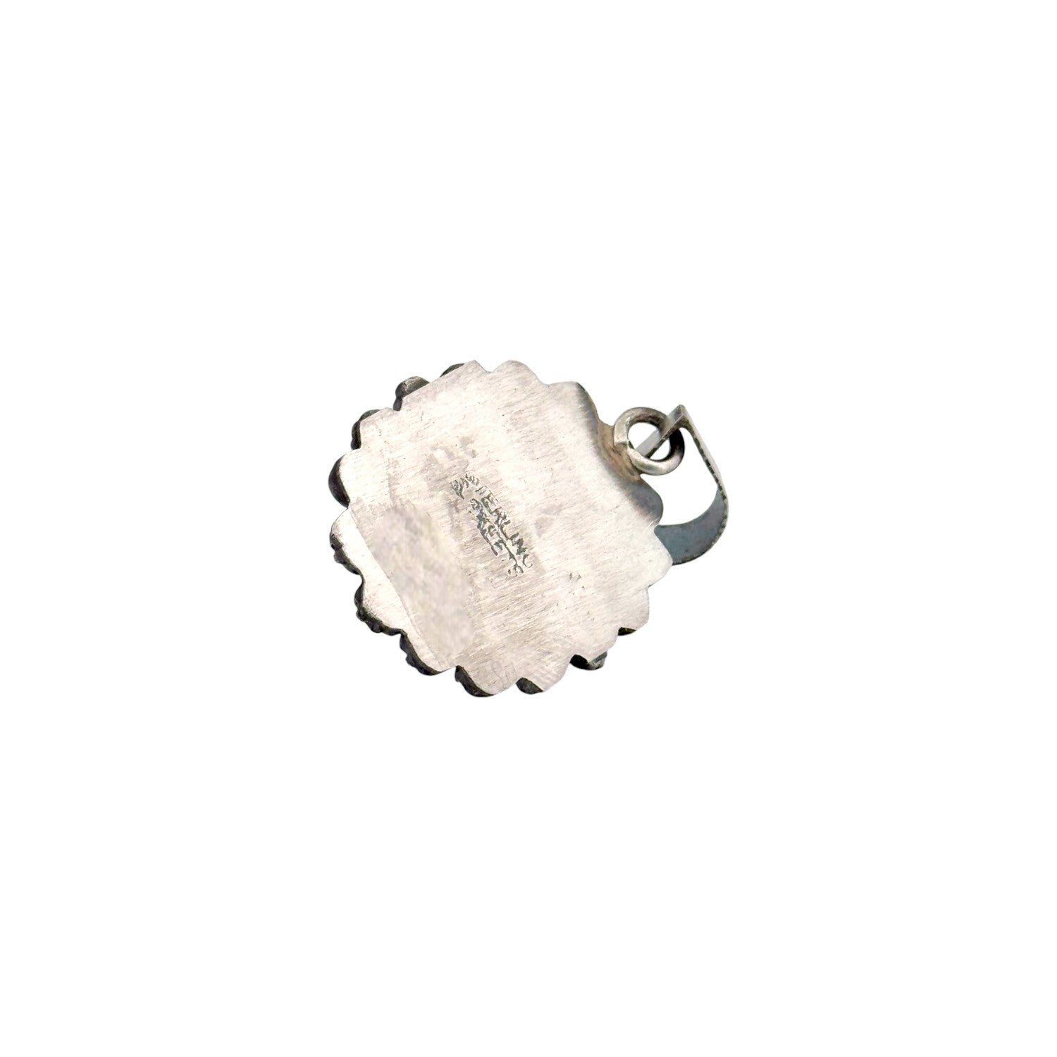 This elegant pendant by Navajo artist Scott Skeets highlights a beautifully polished Pink Conch Shell cabochon, radiating soft blush and coral hues reminiscent of desert sunsets. The shell is set in a finely handcrafted sterling silver frame, accented with traditional Navajo stamp work that creates a radiant starburst pattern around the stone. A twisted silver rope border enhances the centerpiece, adding depth and refined detail to the design. The contrast between the warm, natural pink tones and the oxidized silver background brings a sense of harmony and sophistication. Skeets’s exceptional craftsmanship and balanced composition reflect both traditional Navajo artistry and contemporary elegance.
