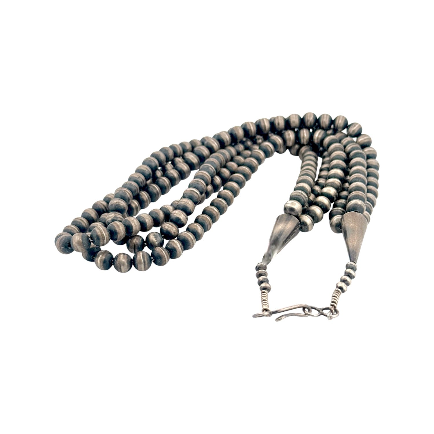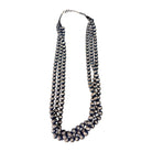 This vintage Navajo handmade necklace, crafted circa the 1970s, is a timeless example of traditional Southwestern silversmithing. Made entirely of sterling silver, the piece features three strands of oxidized Navajo pearls, each hand-formed and polished to achieve a rich patina that speaks to decades of character and wear. The graduated bead sizes create a balanced, elegant flow, while the cone ends and hook clasp highlight the meticulous craftsmanship of the artist. Each bead bears subtle hammer marks and natural variations, emphasizing its handmade authenticity. The design embodies both simplicity and sophistication, allowing it to be worn alone or layered with other Native pieces.