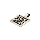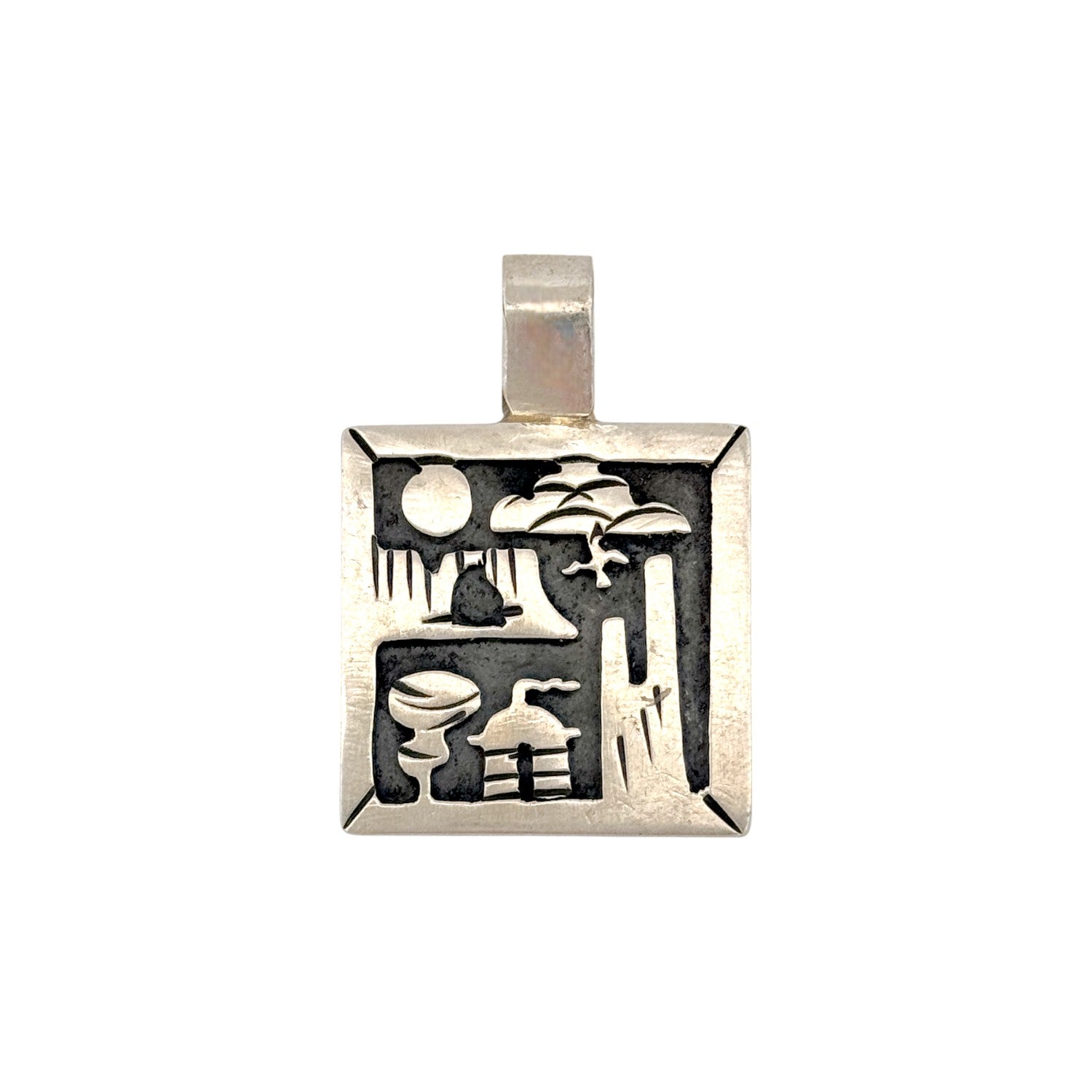 This vintage Navajo pendant from the early 2000s beautifully captures the spirit of the Southwest through detailed hand-carved silverwork. Crafted in sterling silver, the piece features a scenic desert landscape complete with mesas, clouds, cacti, and a rising sun—symbols that honor the connection between the Navajo people and their natural surroundings. The oxidized background enhances the depth of the design, bringing each element to life with striking contrast. Its square shape and clean lines lend a modern touch to a deeply traditional composition. The pendant’s craftsmanship reflects the meticulous handwork and storytelling that define authentic Navajo artistry.