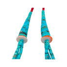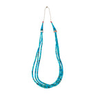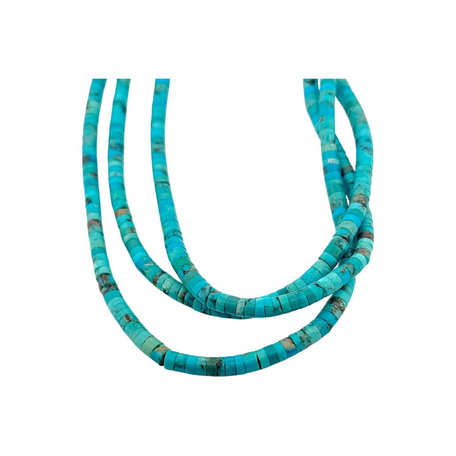 This vintage Navajo handmade necklace showcases the timeless beauty of Kingman turquoise, accented with spiny oyster shell and coral for a vibrant, balanced design. The three-strand heishi style highlights the artist’s expert handwork, with each turquoise bead carefully shaped and polished to reveal its natural matrix and vivid blue hue. Subtle coral and spiny oyster shell accents add warmth and contrast, reflecting the harmony of earth and sea found in traditional Navajo jewelry. Finished with sterling silver cones and a soft string tie, this piece combines authenticity with everyday wearability. The necklace embodies both cultural heritage and refined artistry, celebrating materials sacred to the Navajo people.