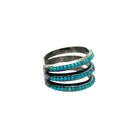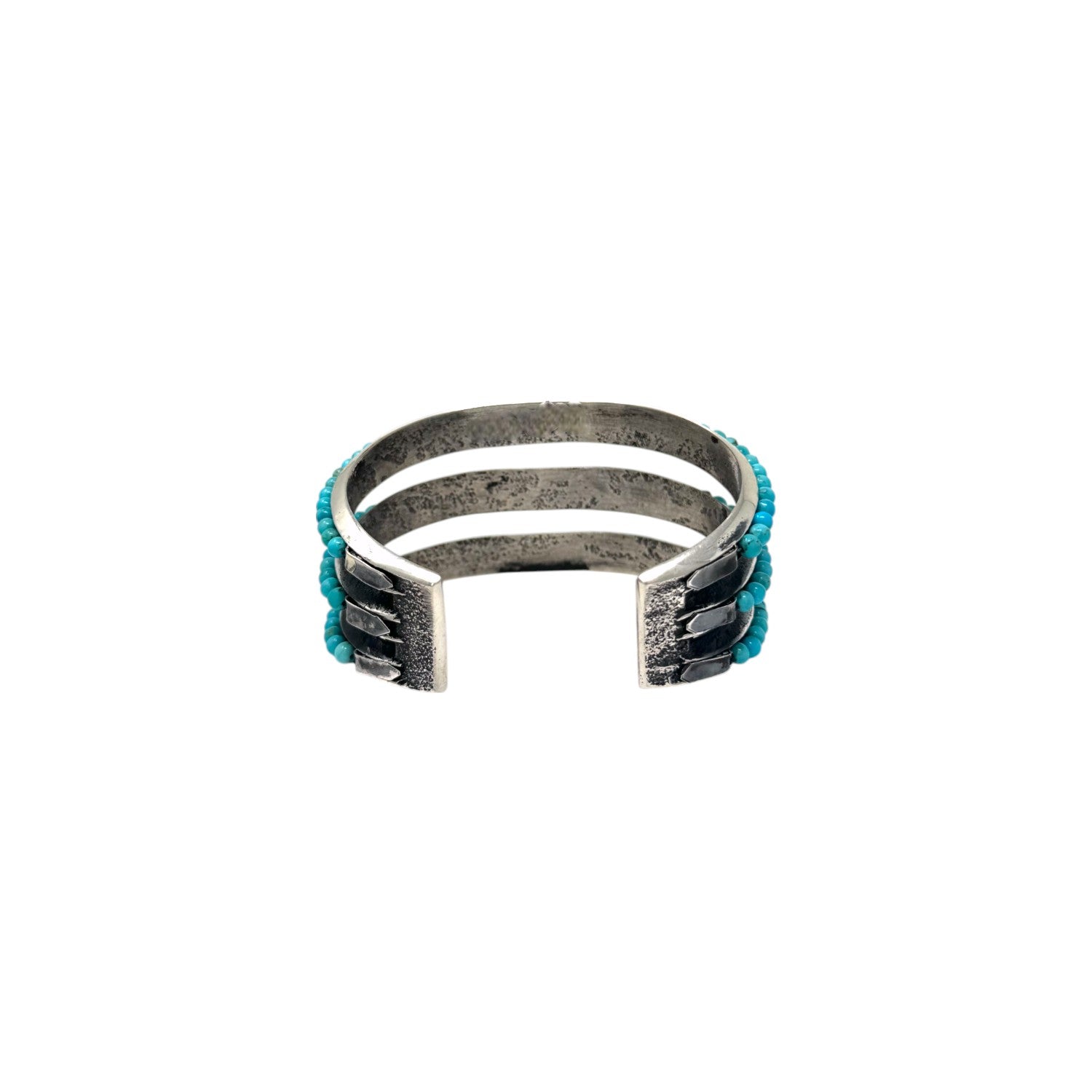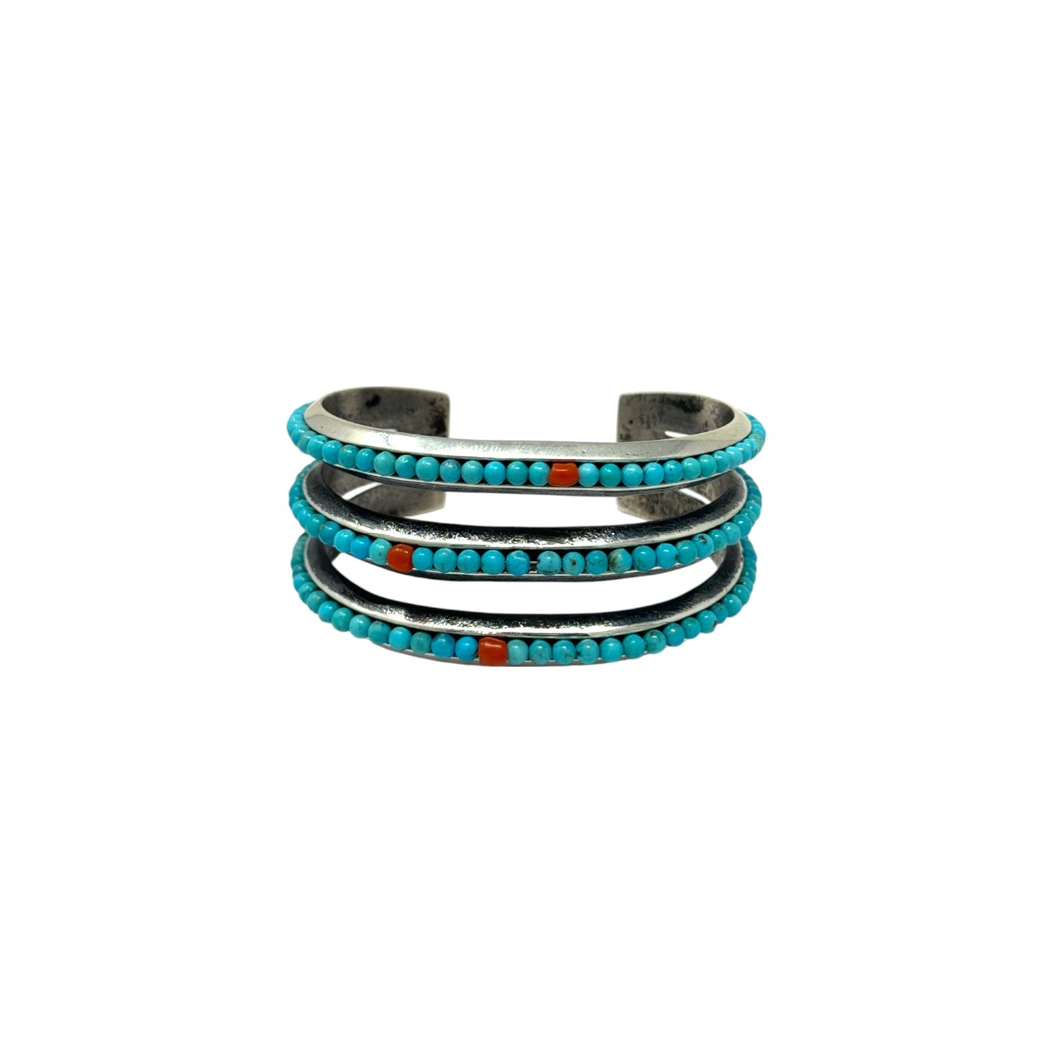 Masterfully handcrafted by renowned Navajo artist Aaron Anderson, this bold cuff bracelet is a striking fusion of tradition and innovation. The design features four sterling silver bands, each beaded with a meticulous row of Kingman Turquoise accented by a vibrant red coral, an iconic pairing in Native American jewelry. The contrast between the deep red and the sky-blue stones evoke the power and harmony of natural elements. The oxidized silver background enhances the rich textures and creates dramatic depth, while the precision work by Aaron reflects expert craftsmanship and modern aesthetic. Known for his unique style and use of tufa casting, Anderson brings a refined edge to this piece while honoring Navajo silversmithing traditions.