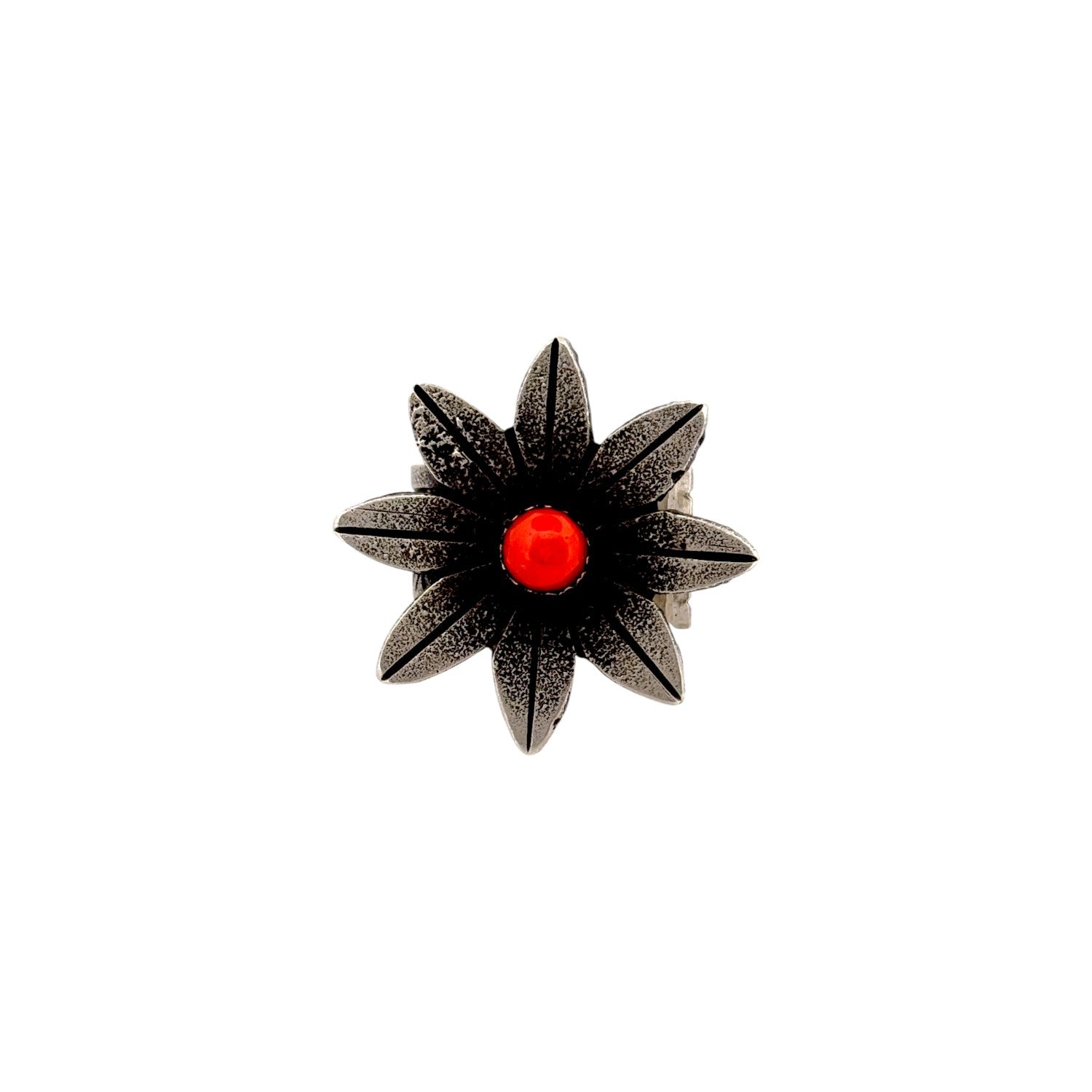 This Navajo handmade ring by Aaron Anderson features a striking coral cabochon set at the center of a bold, star-shaped design. Crafted from sterling silver, the ring showcases Anderson’s signature tufa-cast texture, giving the petals a rich, organic surface. The deep red coral adds a vivid pop of color that contrasts beautifully with the oxidized silver. Each petal is meticulously shaped, creating a dramatic and sculptural presence on the hand. Unique and artistic, this piece exemplifies Anderson’s renowned mastery of contemporary Navajo jewelry.