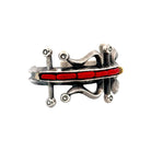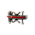 This bold bracelet by renowned Navajo artist Aaron Anderson is a stunning example of tufa cast artistry. Handcrafted from sterling silver, the piece showcases a striking row of rich red coral inlay, accented with a single gold bead for an unexpected touch of brilliance. The bracelet’s sculptural form is defined by flowing curves, open spaces, and raised circular details, giving it a dynamic and architectural presence. The textured silver surface contrasts beautifully with the smooth Coral, highlighting Anderson’s mastery of traditional techniques blended with contemporary design. Each element is carefully balanced, creating a piece that feels both modern and deeply rooted in Navajo heritage. The weight and craftsmanship lend it a powerful presence on the wrist, making it an heirloom-quality work of wearable art.