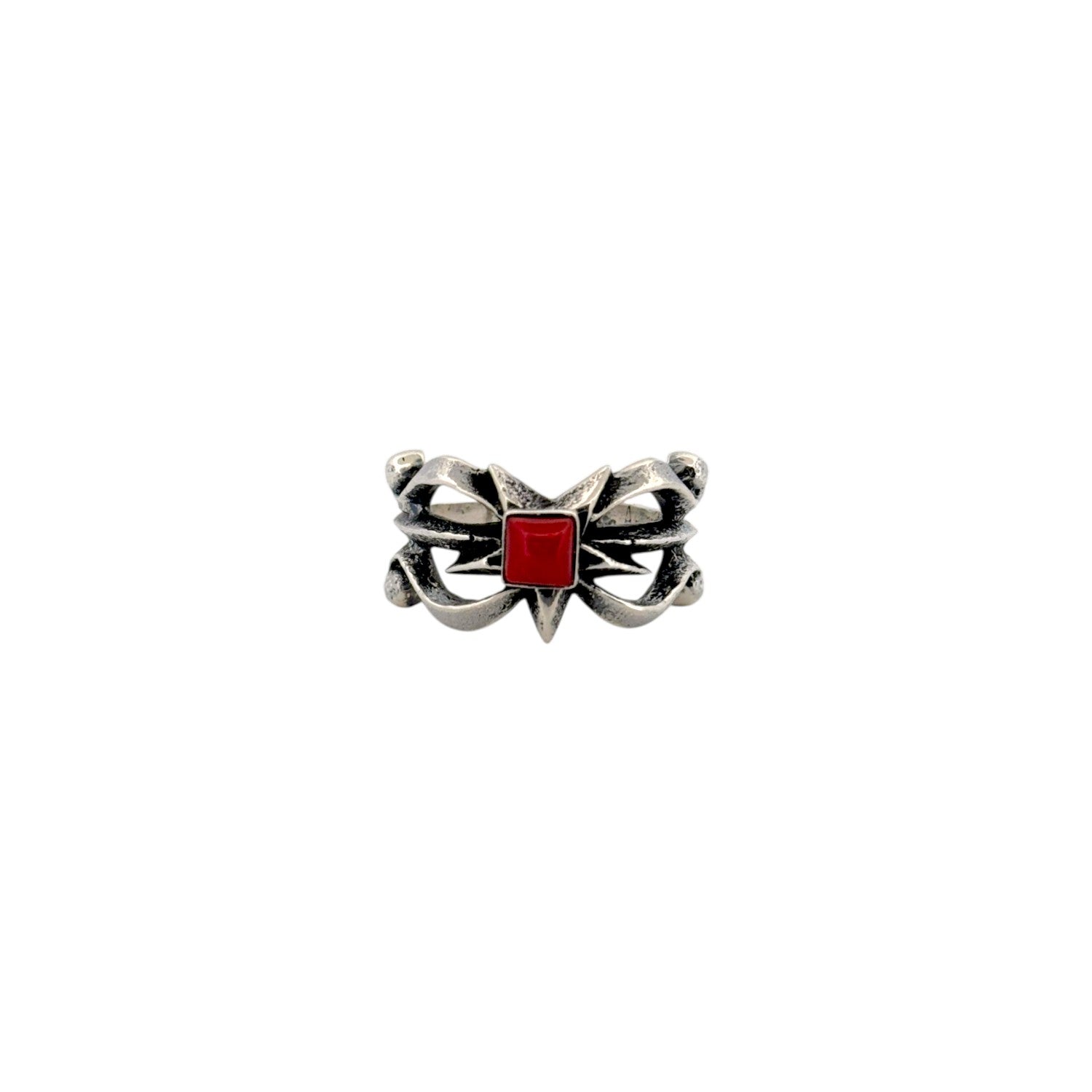 This Navajo handmade ring by Aaron Anderson features a striking sterling silver design accented with a vibrant red coral stone at its center. The square coral cabochon is framed by bold, sculptural silverwork that creates a dynamic starburst-inspired motif. The polished coral contrasts beautifully with the oxidized silver background, highlighting the depth and texture of the design. Known for his distinctive tufa-cast style, Aaron Anderson’s craftsmanship gives the ring a bold yet refined Southwestern character. This unique piece blends traditional Navajo artistry with contemporary design, making it a standout example of Navajo handmade jewelry.