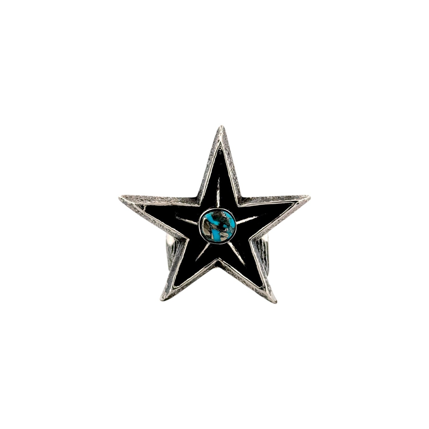 This Navajo handmade ring by Aaron Anderson features a bold star-shaped design crafted from richly textured sterling silver. At the center rests a striking Persian turquoise stone, showcasing vibrant blue hues and a natural matrix that adds depth and character. The star’s recessed areas are darkened to create contrast, emphasizing Anderson’s signature tufa-cast style and precise detailing. Its strong, sculptural form makes this ring both a statement piece and a wearable work of art. Distinctive and expertly crafted, it reflects the innovation and mastery Aaron Anderson is celebrated for in contemporary Navajo jewelry.
