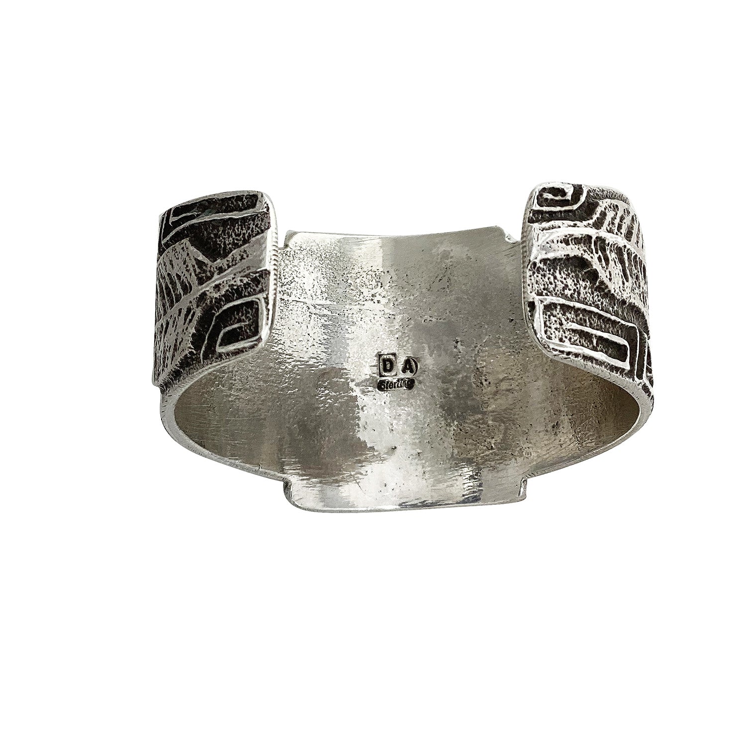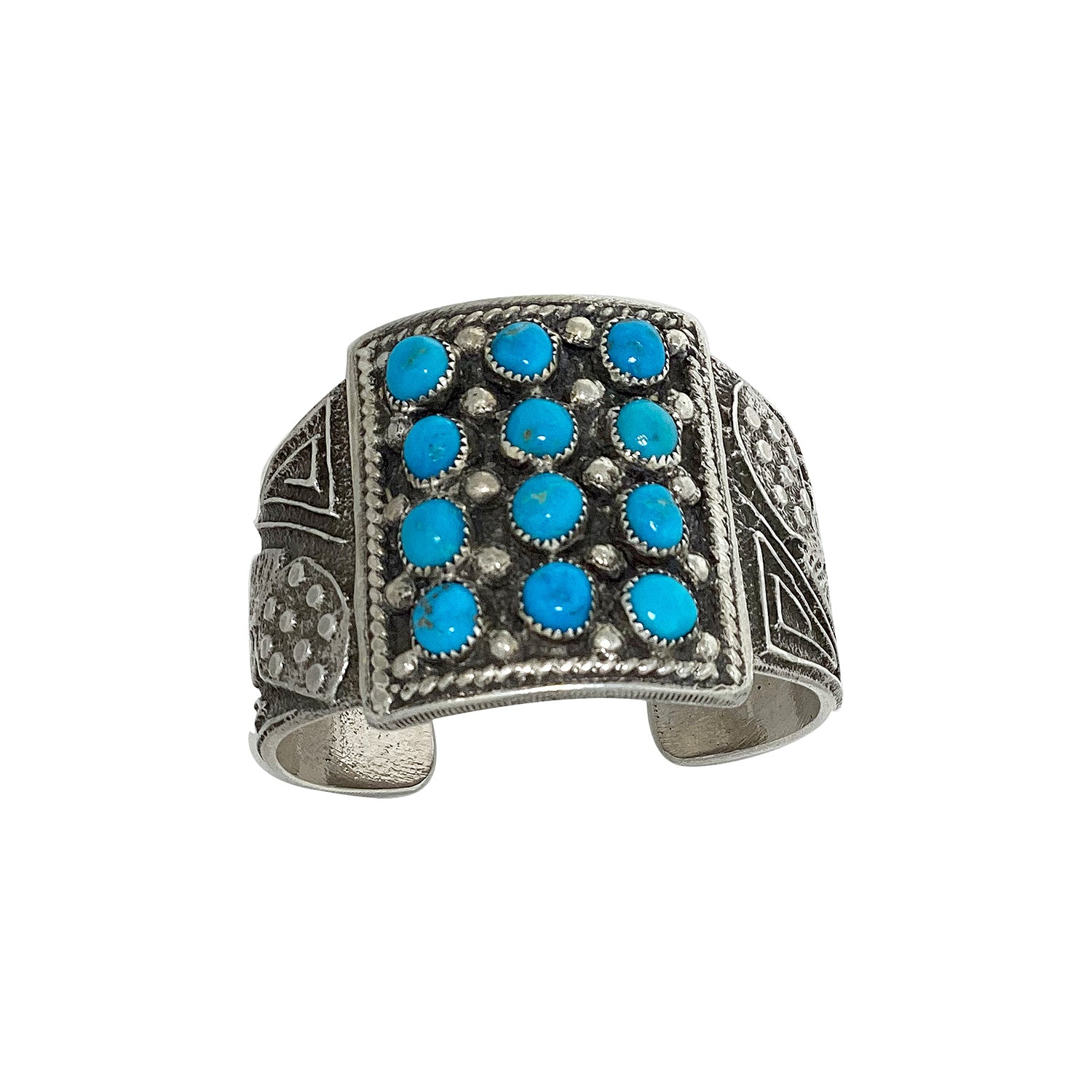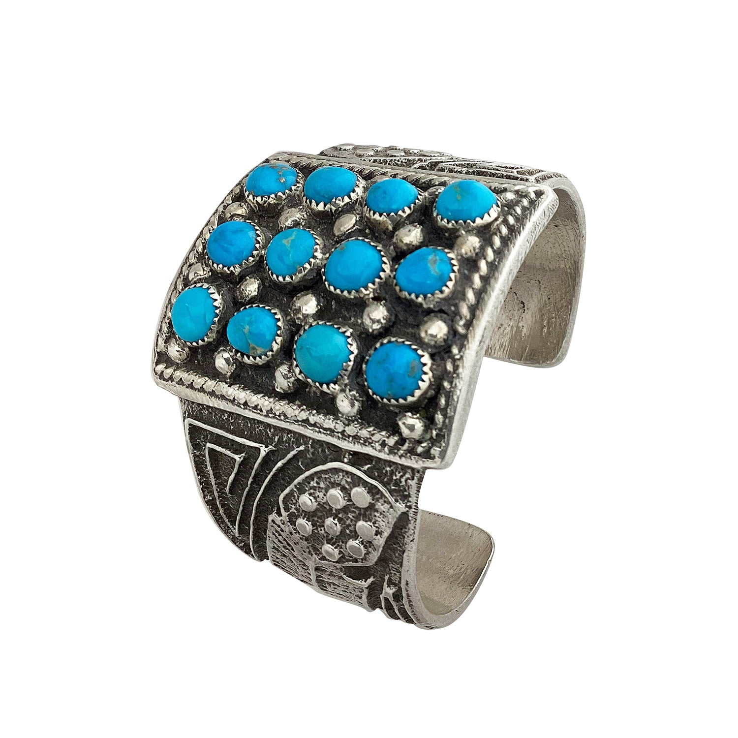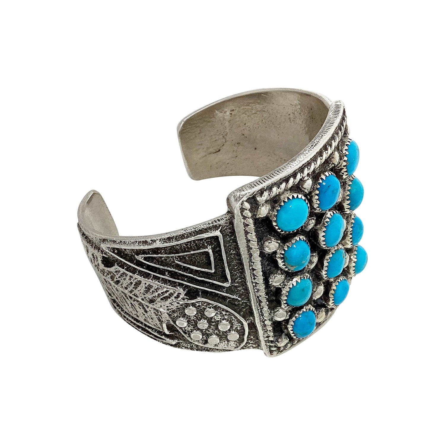 This bracelet just shouts traditional Navajo style art. The old classic tufa cast pieces are filled with a feather on each side of the bracelet. Navajo silversmith Delbert Arviso honors past generations with this big tufa cast cuff. Right in the center he uses a cluster of an American classic, Kingman Turquoise. The deep blue Arizona rock looks right at home on the wide bracelet. Just like most of Delbert's revival work this cuff is finished with a rustic antique look. Make sure you check out all of his work in the online Trading Post.