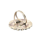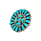 This handcrafted ring by Navajo silversmith Lavern Bahe showcases the radiant beauty of Kingman Turquoise set in sterling silver. Designed in a traditional cluster style, the circular face features vibrant turquoise stones arranged in concentric patterns, each stone hand-cut into teardrop and oval shapes. The stones are secured in serrated bezels and framed with twisted silver rope detailing, adding depth and texture to the piece. Silver drops accent the design, balancing the composition while enhancing its brilliance. The oxidized background provides contrast, allowing the vivid blue hues of the turquoise to stand out boldly. With its large face and precise symmetry, the ring makes a striking statement while honoring classic Navajo artistry.