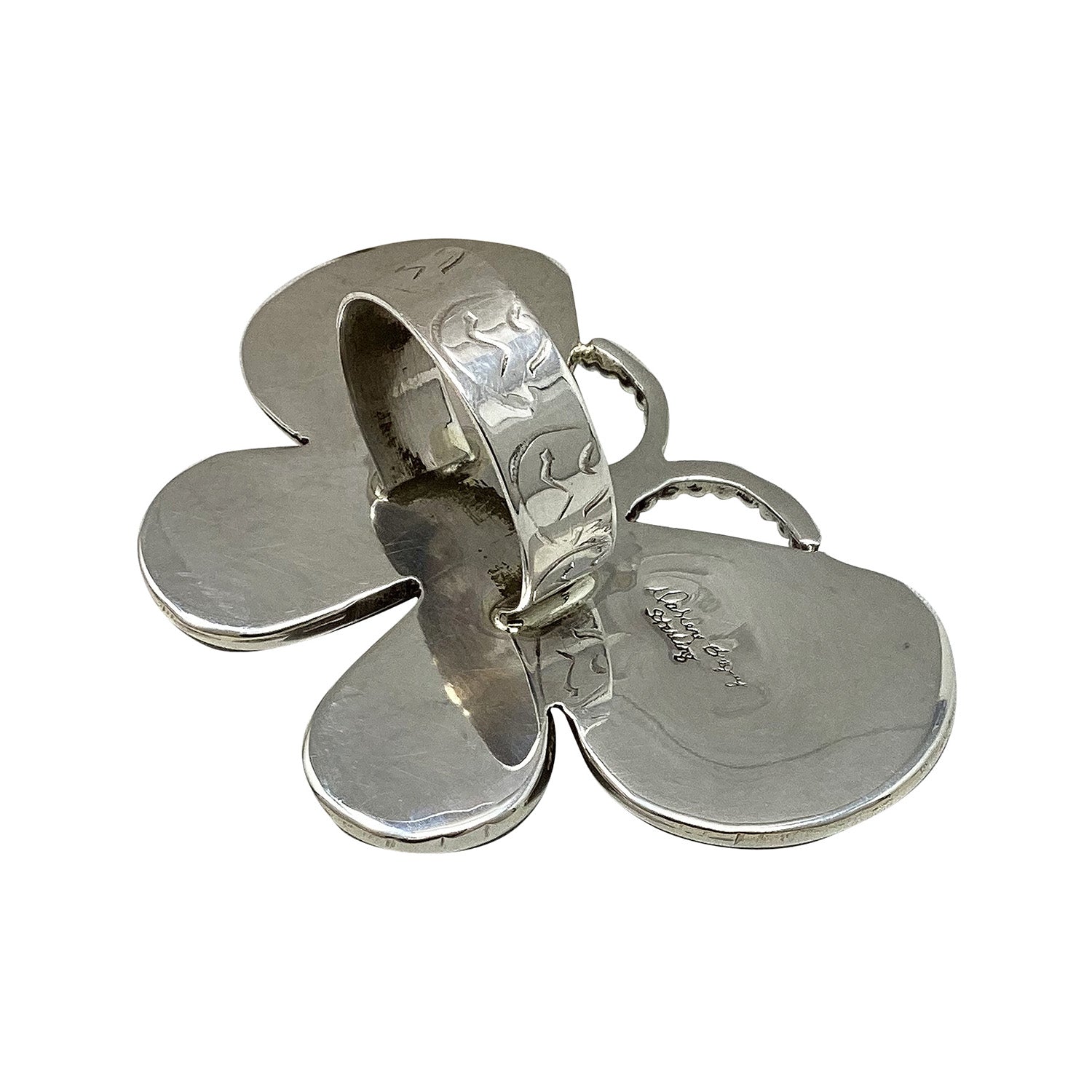 Navajo silversmith Darlene Begay made this magnificent purple Spiny Oyster Shell butterfly ring. She has used an amazing collection of small Spiny Oyster Shell stones. The combination of size and design of this ring is going to get a lot of people to notice it. You will find the vibrant stones are enhanced by the centered flower blossom, silver drops and unpolished background. Also, she has placed the cluster of rocks on an easy wearing stamped ring band. Look for other works by Darlene Begay in the online Trading Post.