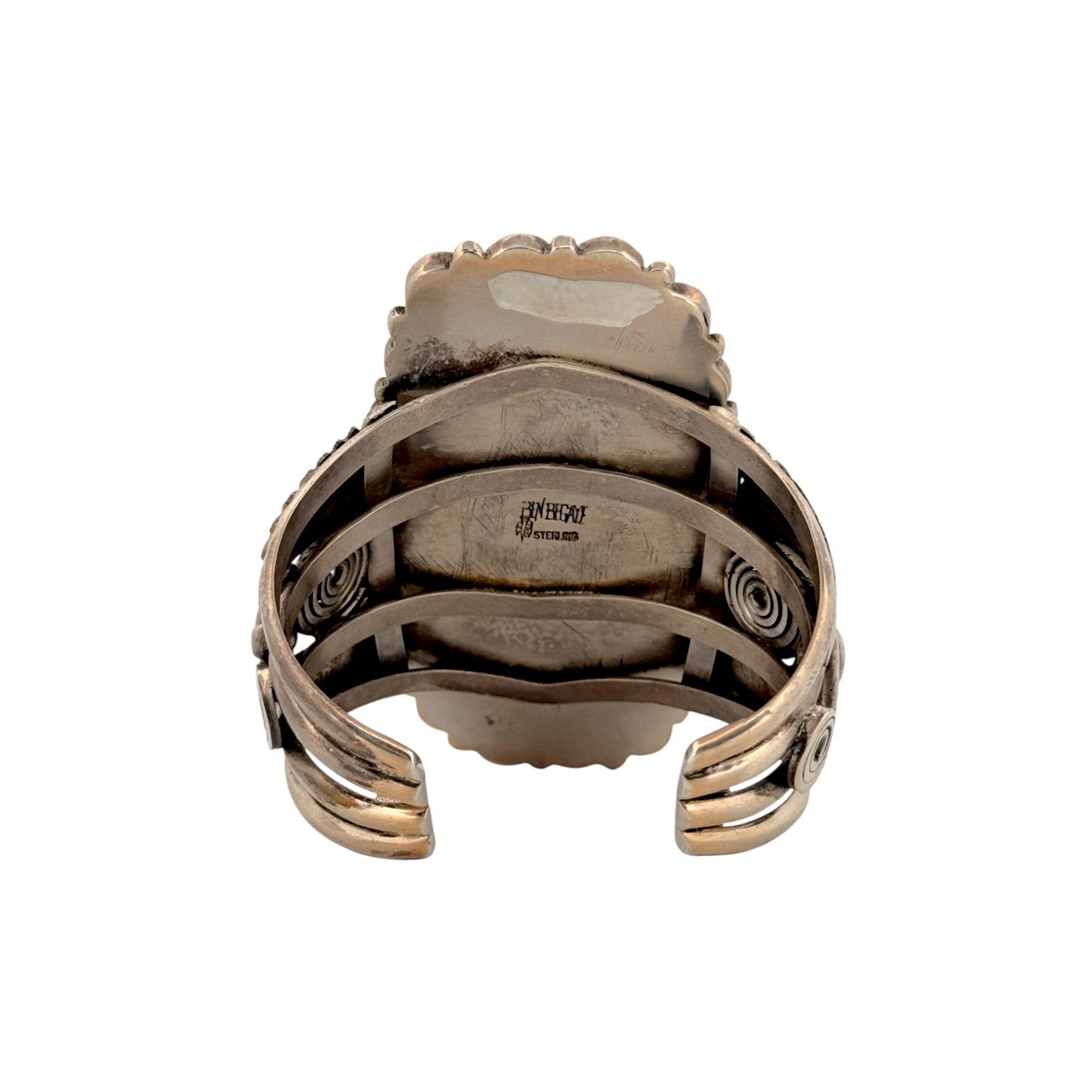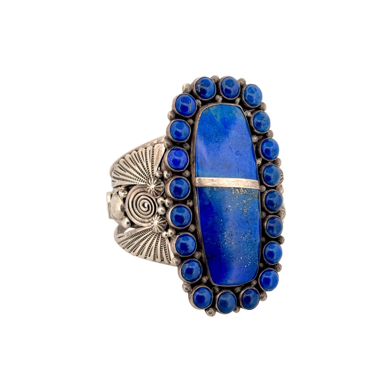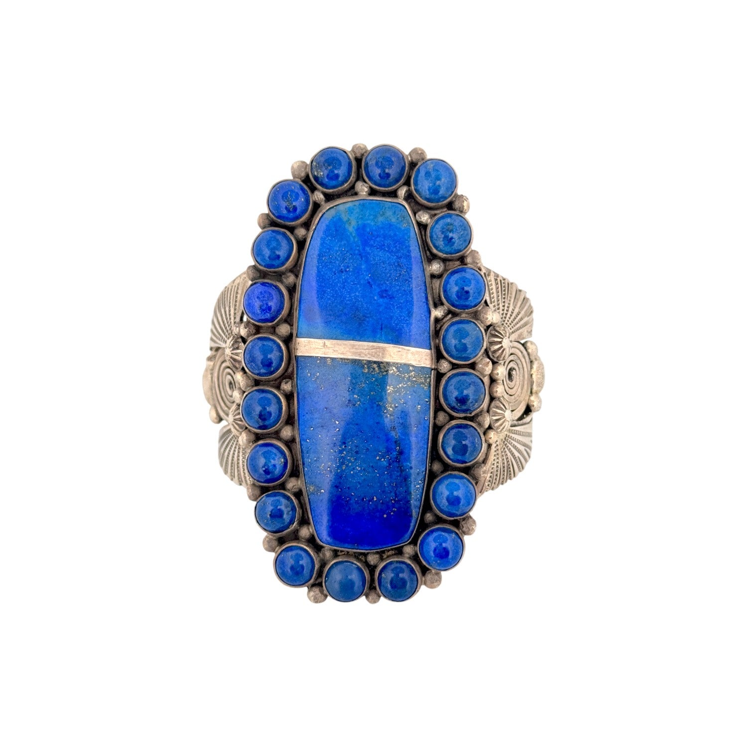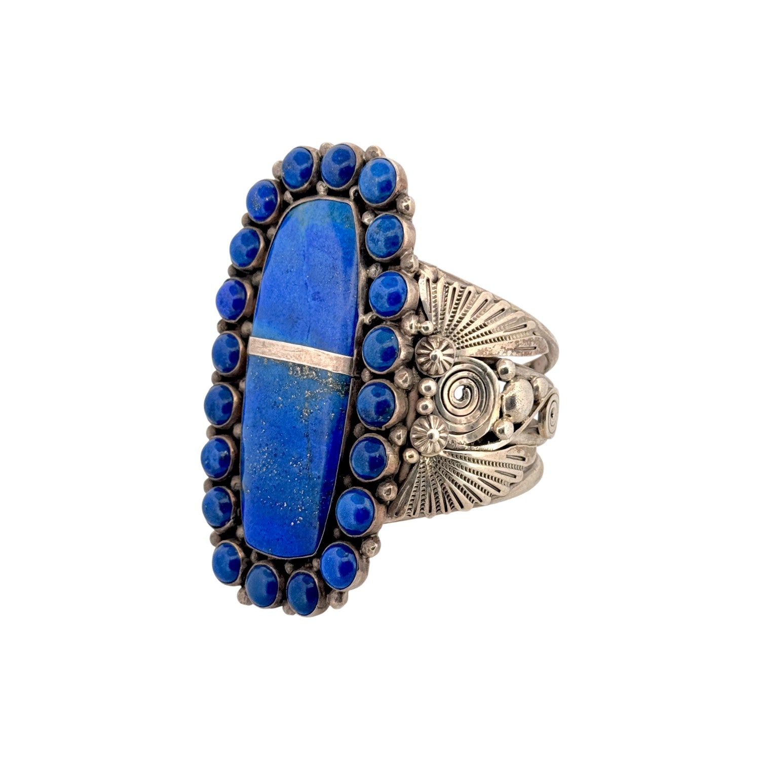 This vintage bracelet by Ben Begaye features a striking lapis lazuli centerpiece framed by rich, hand-set blue stones in sterling silver. Handcrafted in the Navajo tradition, the bracelet displays bold stamp work and classic Native American design elements. The deep cobalt hues of the lapis lazuli are accented with natural inclusions, adding depth and character to the piece. Solid and well-balanced, this bracelet reflects the skilled artistry and timeless style associated with Begaye’s work. A standout vintage piece, it’s perfect for collectors or anyone who appreciates authentic Navajo handmade jewelry.