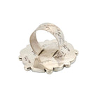 This striking ring by Navajo artist Darlene Begay features the bold beauty of Kingman Turquoise set in sterling silver. The round cluster design showcases multiple oval turquoise stones, each with unique matrix patterns, arranged in a balanced and eye-catching composition. The stones are set in serrated bezels, surrounded by polished silver drops that add texture and depth. The oxidized background enhances the vivid blue tones of the Turquoise, making the stones stand out brilliantly. Handcrafted with precision, the ring reflects the traditional Navajo cluster style while carrying Begay’s distinctive artistry. Its wide face and solid construction make it a statement piece, perfect for those who appreciate bold, authentic Southwestern jewelry.
